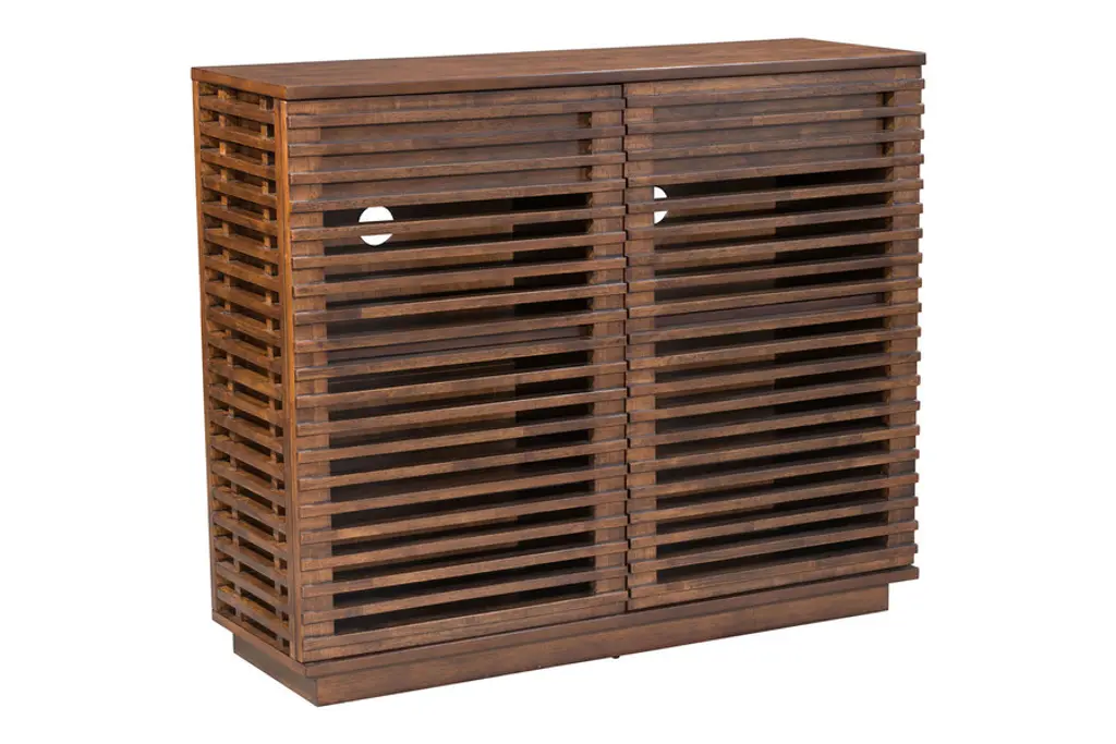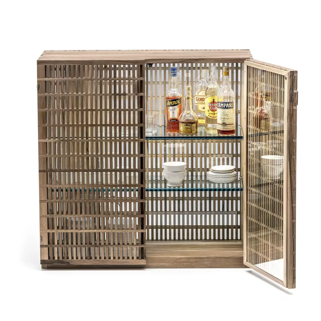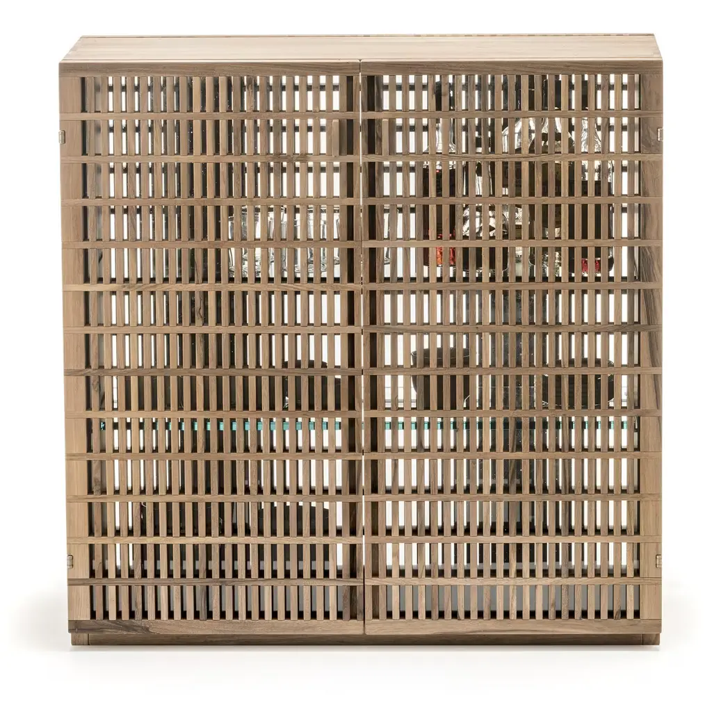 Interpreting a traditional design with contemporary flair, this exceptional cabinet will take center stage in a modern decor. Handcrafted of solid walnut with a polished finish, it has a square frame with two doors mounted on custom-made, stainless steel hinges. Two front doors enriched with gratings open to reveal two extra-clear glass shelves with adjustable height and LED lighting with floor control.