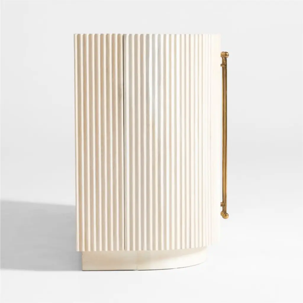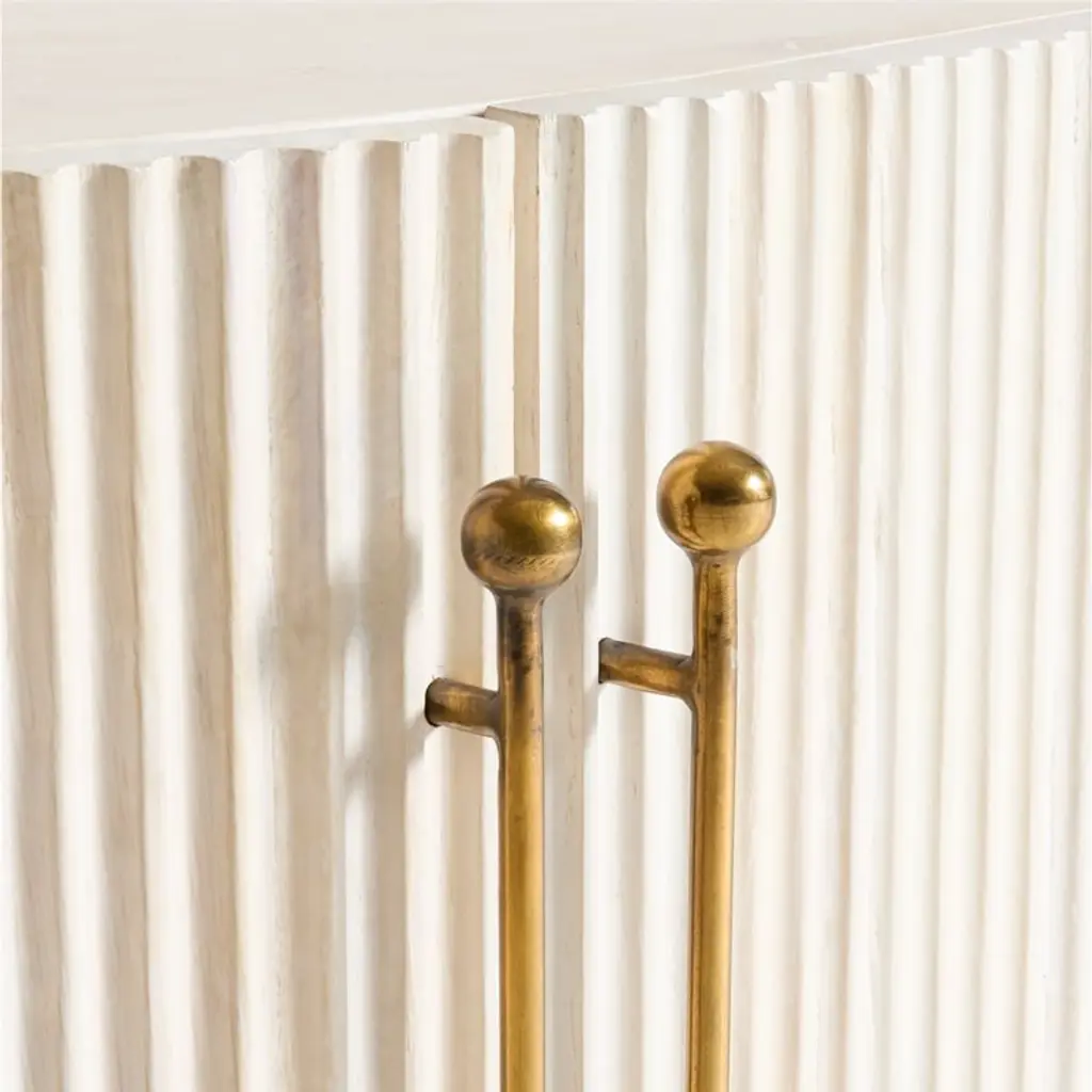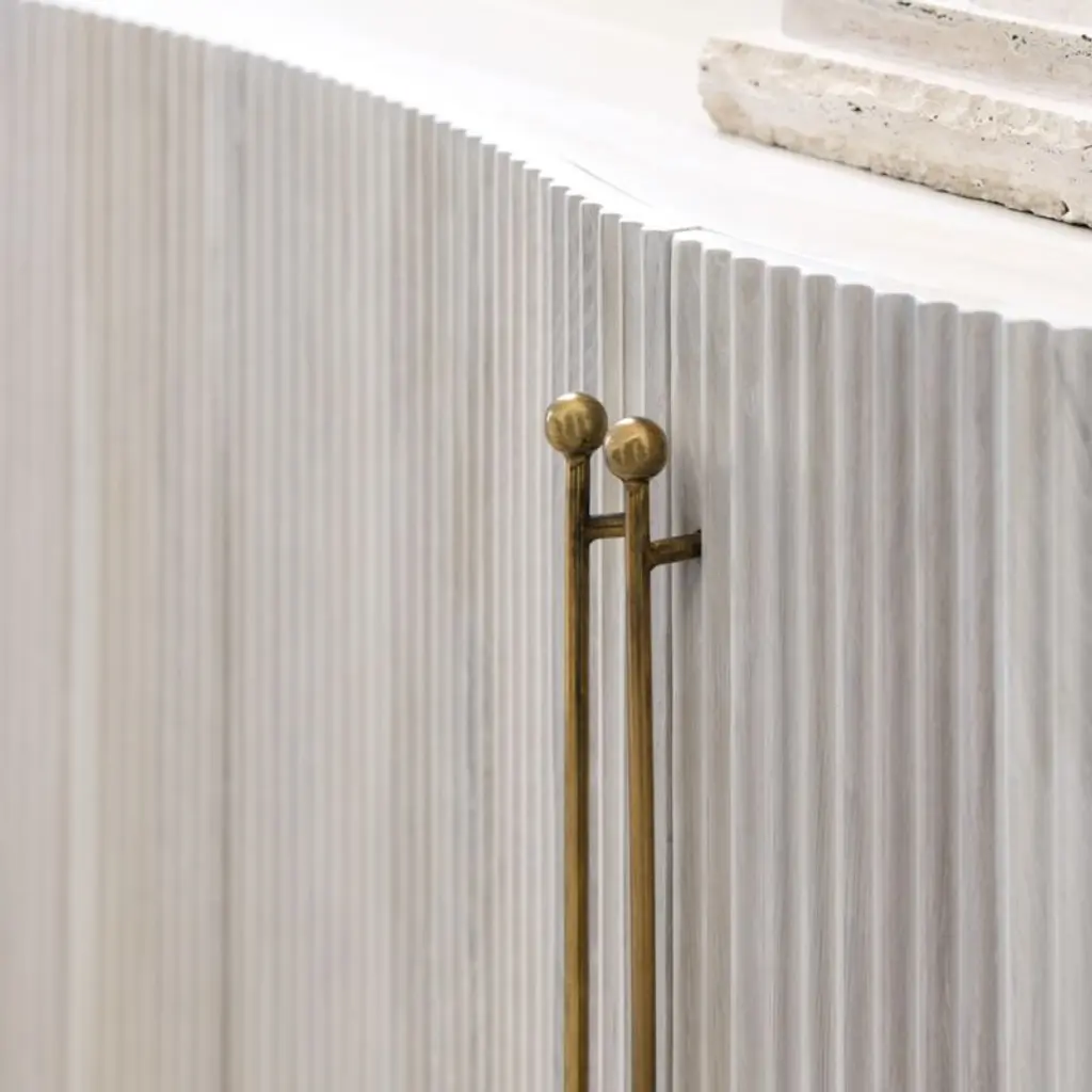 Undulating curves and rhythmic fluting evoke the ocean surf in our Coastline credenza. Made of oak with a light whitewash finish, the credenza accentuates the grooved facade with vertical pulls finished in burnished brass. Two sets of double doors open to two cabinets each for ample storage. This curvy statement-maker is classic and functional, with just the right amount of attitude.Exclusive collaboration! L.A.-based star designer Brigette Romanek redefines design rules as only she can, with playfully unexpected forms to bring you the fresh look her A-list clients love.