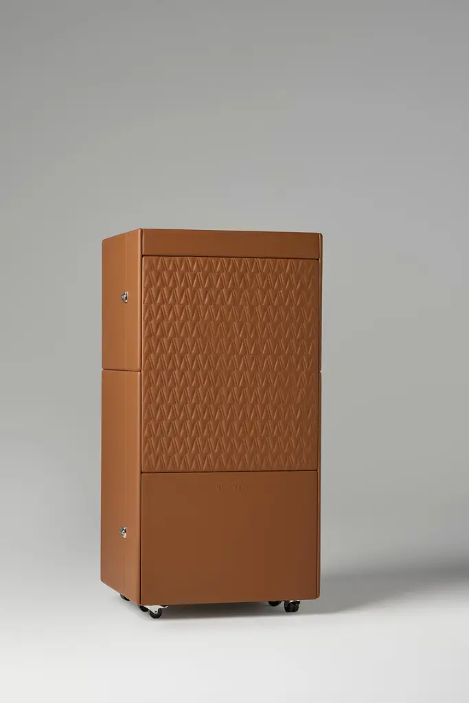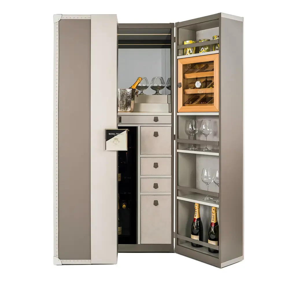 A piece of furniture created for lovers of coffee and design. This coffee station is a creation by Jacobo Ventura with the aim of providing an elegant solution to coffee lovers. A piece of furniture with a careful aesthetic that makes it an essential both for the home, luxury hotel rooms or offices. The coffee station is a mobile cabinet that can be easily moved thanks to its six wheels. The interior of this coffee cabinet has a distribution designed to have everything you need to prepare coffee or other drinks accessible. The door has shelves with chrome bars at different heights, ideal for both bottles and glasses. The hinges are hidden, with three adjustments, they support up to 60 kilos. A metal rebate has been placed for the closure that, in addition to its practical function, gives it an attractive modern touch. The interior of the cabinet is divided into three sections. The upper one has a central module for the coffee maker and two side shelves for cups. In the middle section there are two drawers, with the front lined in leather and embossed handles in polished chrome, perfect for storing coffee capsules, teaspoons, corkscrews and other kitchenware. The distribution of the lower part maintains symmetry with the upper part, it is designed to house a refrigerator and shelves to place bottles horizontally.LED lighting with motion sensor has been placed in the coffee maker module. The light unit is easily removed so that its long-lasting battery can be charged via USB. In addition, a power strip has been discreetly placed inside the cabinet to plug in the fridge and coffee maker.The interior can be lacquered in a wide selection of tones that allows for color games to be created when combined with the exterior skin and the drawer. Dimensions:Height: 58.27"Width: 28.35"Depth: 26.38" We do our best to expedite production and to ship and deliver product within the listed lead time, however current lead times might be longer due to global shipping backlog and delays. These delays are out of our control and cannot be a reason to cancel an order.