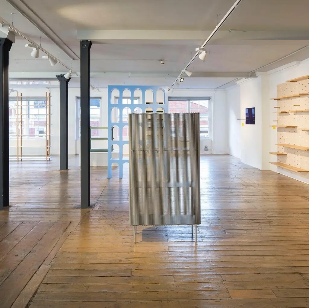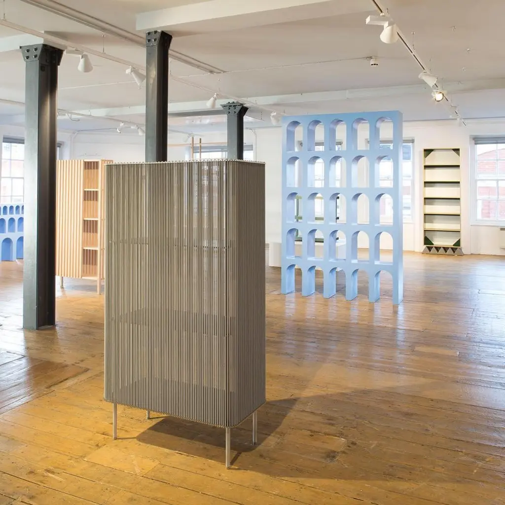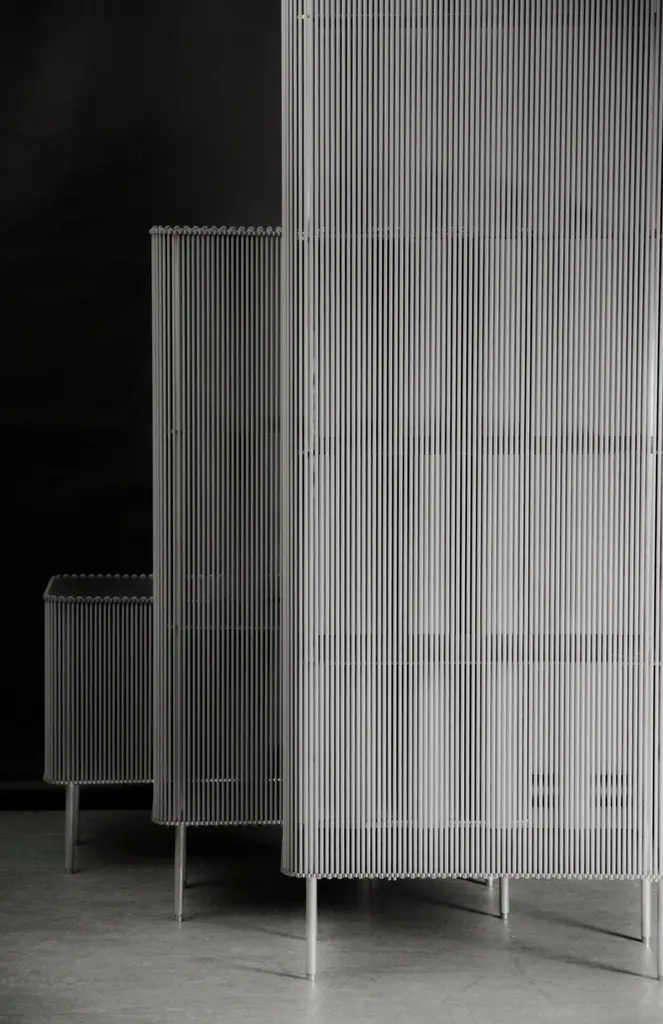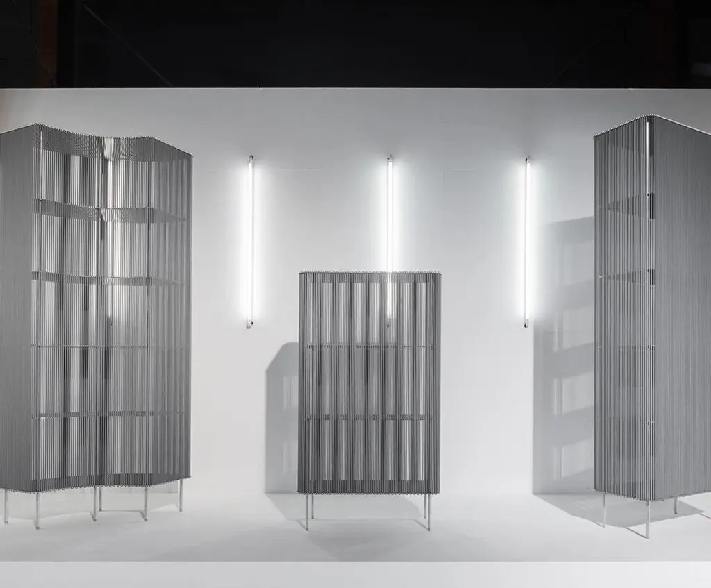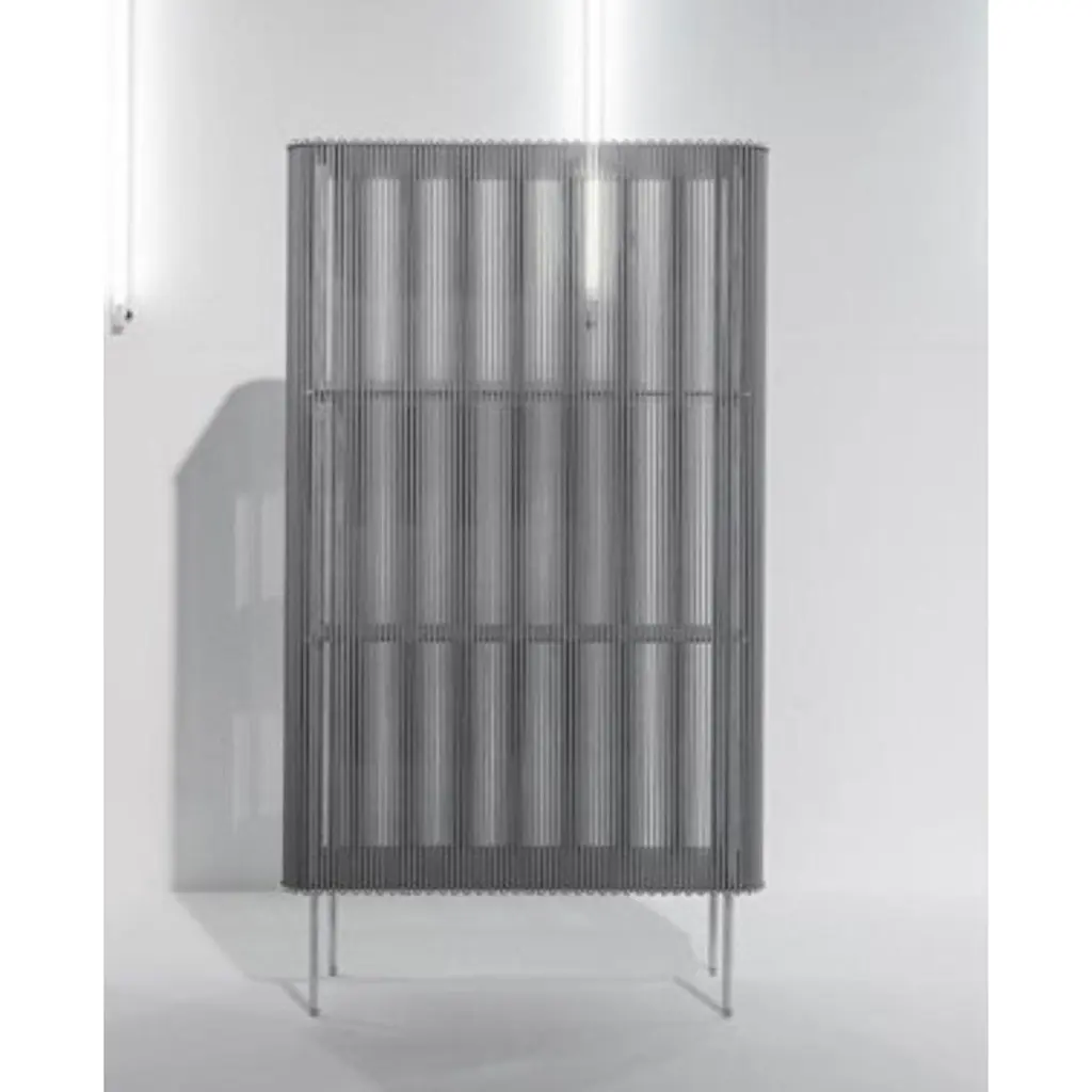 Coil #3 low cabinet by Bram KerkhofsDimensions: D80 x W40 x H144.5 cmMaterials: Stainless steel, aluminum, elastic rope (natural rubber, polyethylene).Other dimensions are available.Coil is a modular cabinet system in which the ‘shell’ is formed completely around a base as a semi-transparent curtain from a vertical and parallel woven elastic rope. It forms the middle between a classic open rack and a display cabinet and can be used on all sides. Coil redefines the cabinet as an object in its use. To put something in or to get it out, the elastics have to be pushed aside. Coil is a good example to clarify my dealings with materials and their properties. To be able to attach the elastic rope, the rope must be stretched so that the rope becomes thinner. The top and bottom shelf of the cabinet are provided with a specific cut-out curve at the edge so that the stretched elastic can be inserted, after which it relaxes nicely in the recessed opening. Due to its modular construction, the coil can vary in height by 40 cm each. The inner shelves are slightly smaller. This keeps them away from the screen. Coil has a fixed rounded rectangular format of 40 x 80 cm (W x H) and can be combined with quarter circle modules with a radius of 40 and 80 cm. This makes it possible to build freestanding walls as a composition of curved and straight forms, as functional room dividers.Bram Kerkhofs (° 1977) is a Belgian furniture designer looking for new forms and methods to challenge the functionality and flexibility of a furniture piece. Educated as a goldsmith he is fascinated by connections, hinges, knots and joints, and especially by the functional opportunities they generate. His work is filled with mathematical principles resulting in intelligible algorithms to make them understandable. He draws particular attention to the relationship between construction and material, bringing simplicity into complexity, with a lasting alertness to the final function. This time-intensive design and development process results in innovative construction systems automatically expressing his signature. Many of his designs must be seen in a bigger picture, as parts to a whole, in which he explores the endless possibilities for links, combinations and variations. Bram wants to clarify complex constructions and gives the consumer and the spectator insight into his thinking process. That is why his work partly revolves around people, as the manipulators of his modular furniture, but above all, Bram aims to influence through collaborations with his interns, apprentices and students and with the wider world around him through workshops and lectures all around the globe.