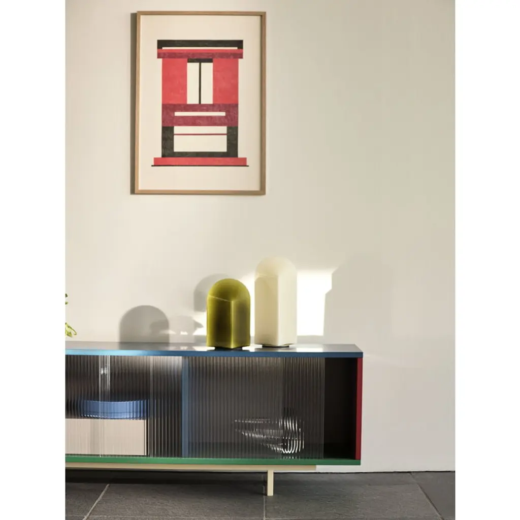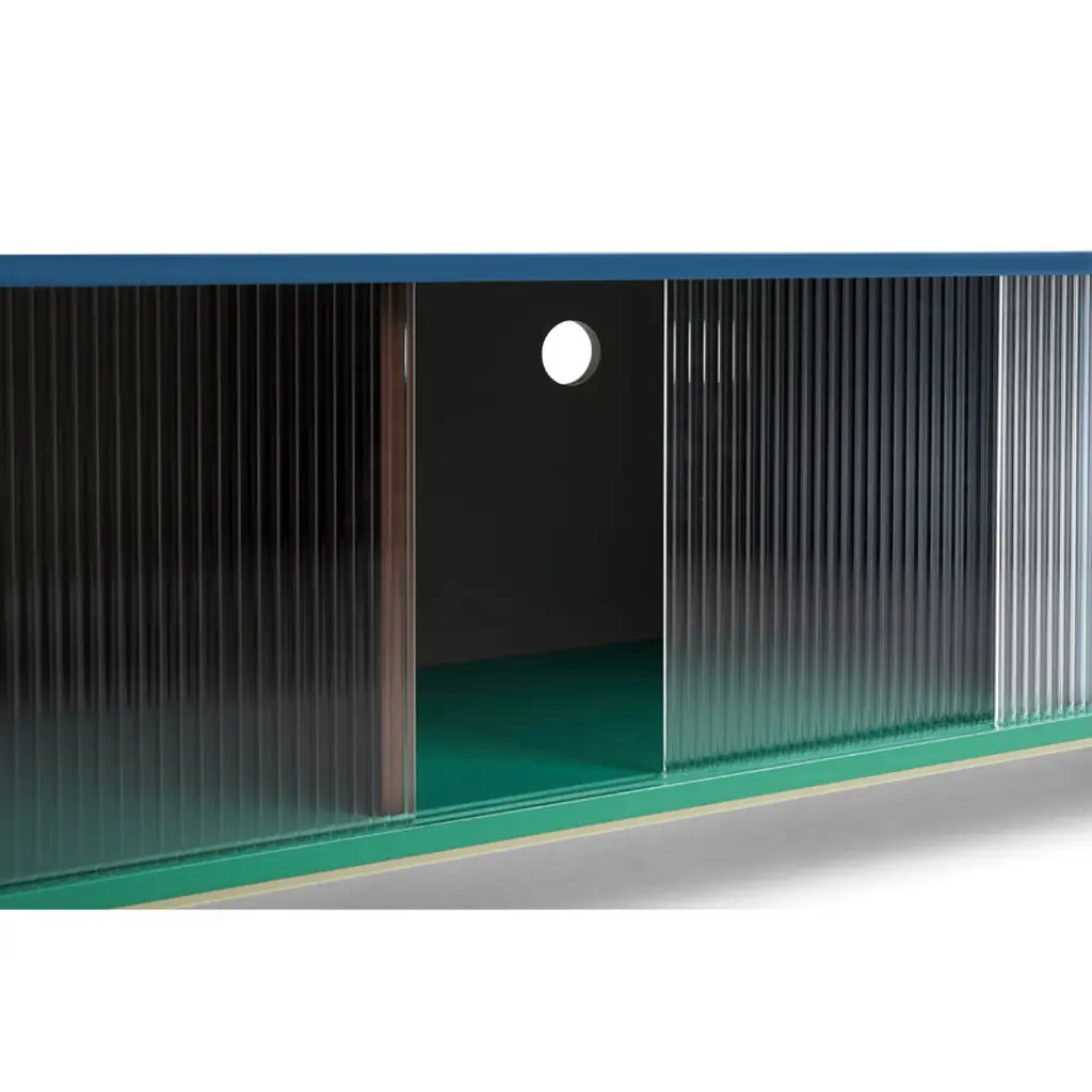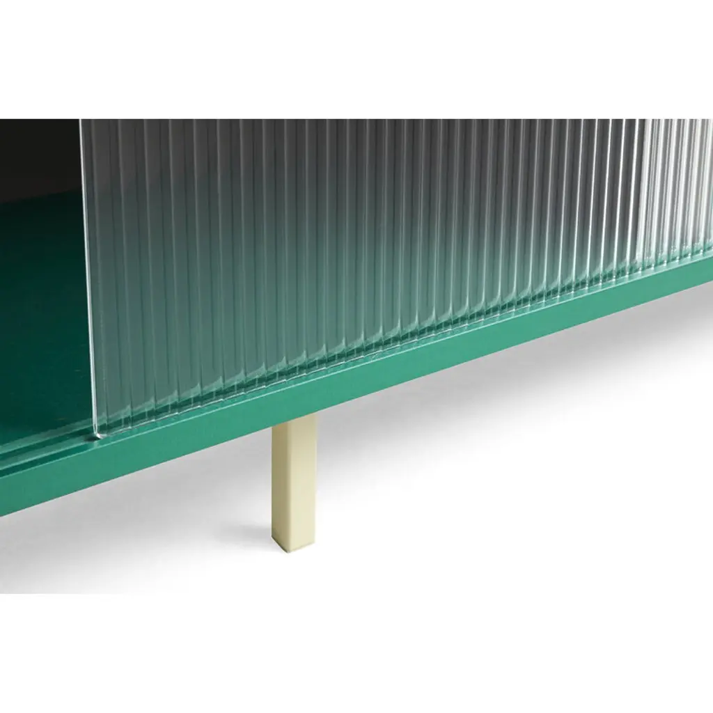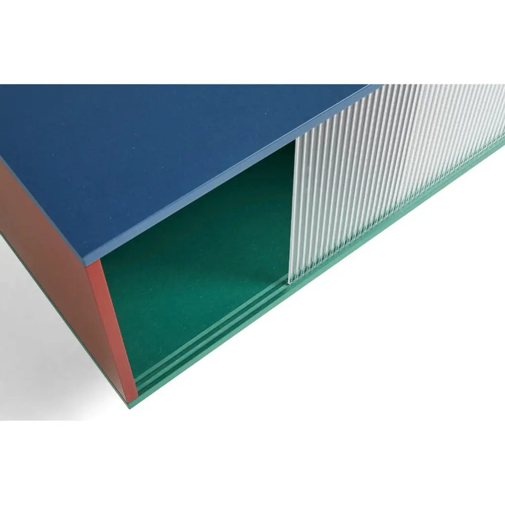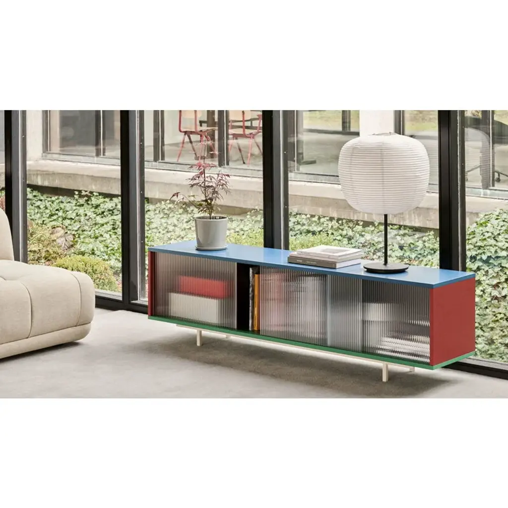 HAY’s Color Cabinet combines a sleek and functional design with strong, dynamic colors. The cabinet is crafted from sturdy Valchromat panels made from certified wood, and its surface is enlivened by small wood fibers. Standing on slender steel legs, this sideboard cabinet can be used, for example, as a TV stand or for storing books, tableware and office supplies in any room you like. The design is complemented by sliding glass doors with a reeded texture. Designed by the Belgian duo Muller Van Severen, the Color Cabinet collection consists of free-standing and wall-mounted cabinets in various sizes and models. Each piece of the collection is characterized by the bold use of colors, highlighting the natural beauty of the wood-based material and creating intriguing contrasts with the simple design. The Color Cabinet series is designed for both home use as well as offices and public spaces. You can also combine different cabinets to create stunning, unique color schemes in various environments.