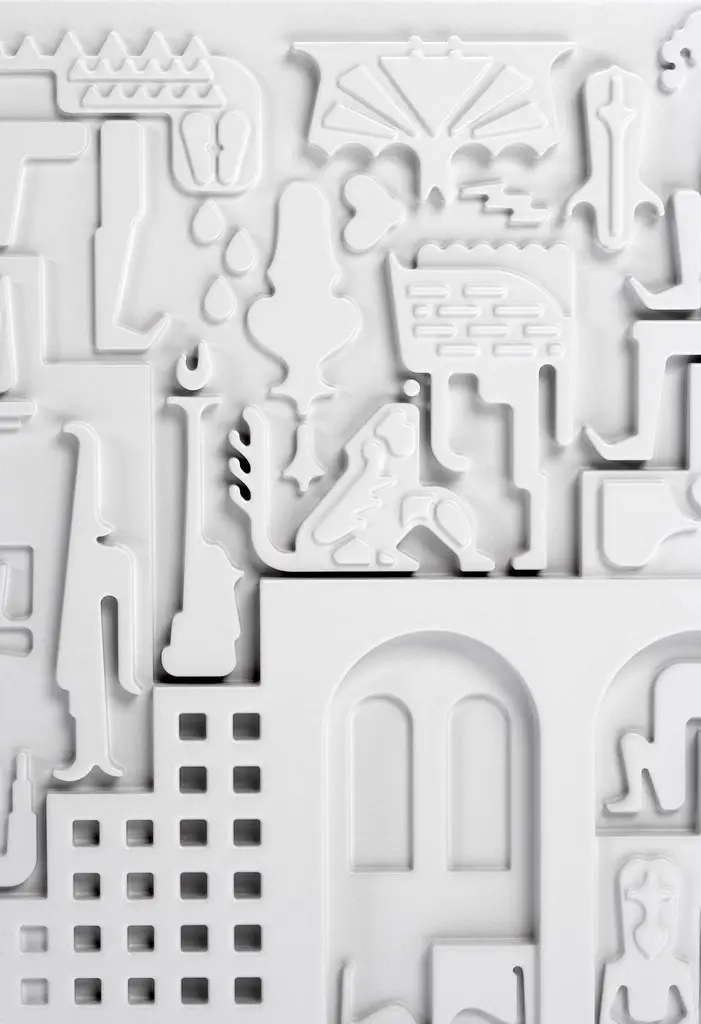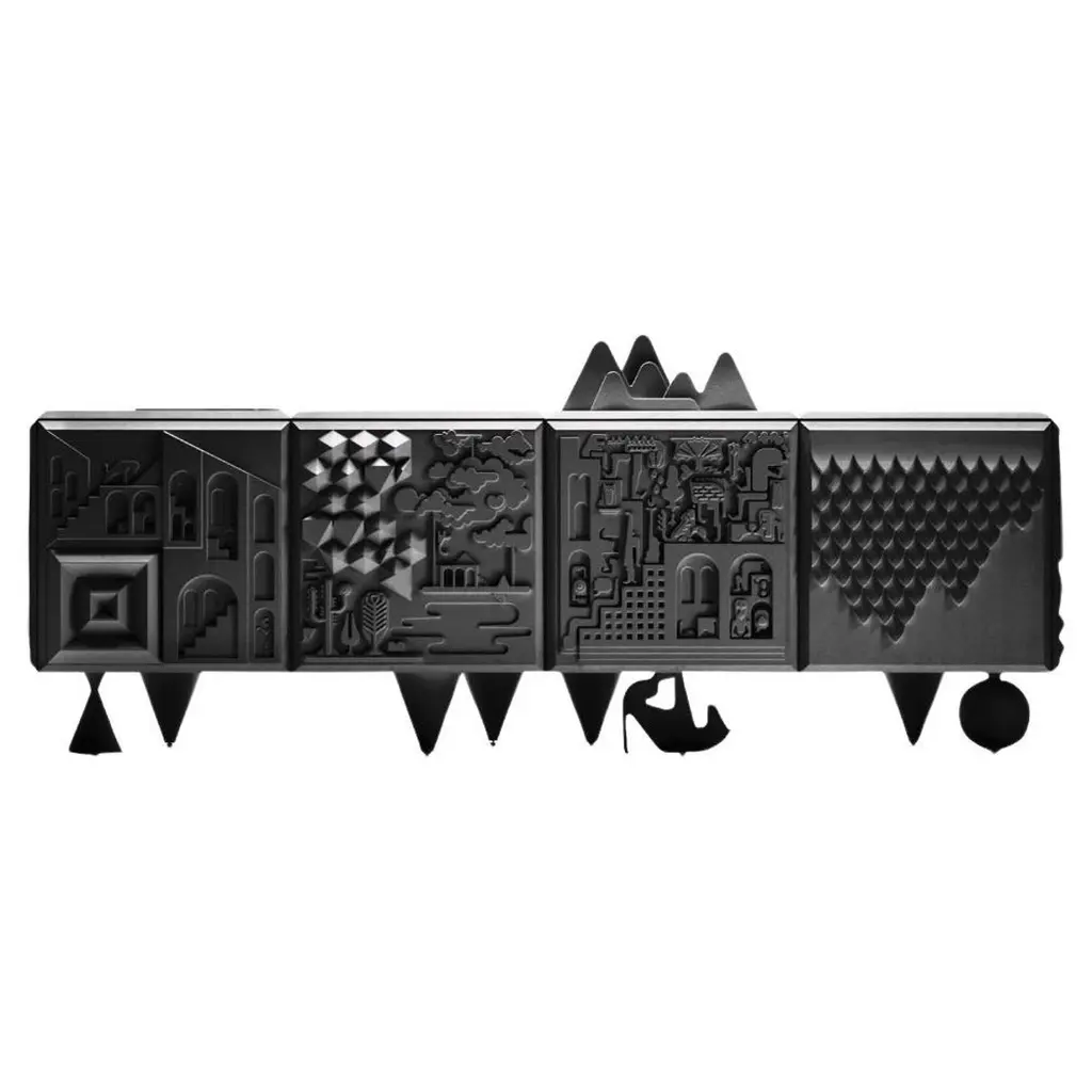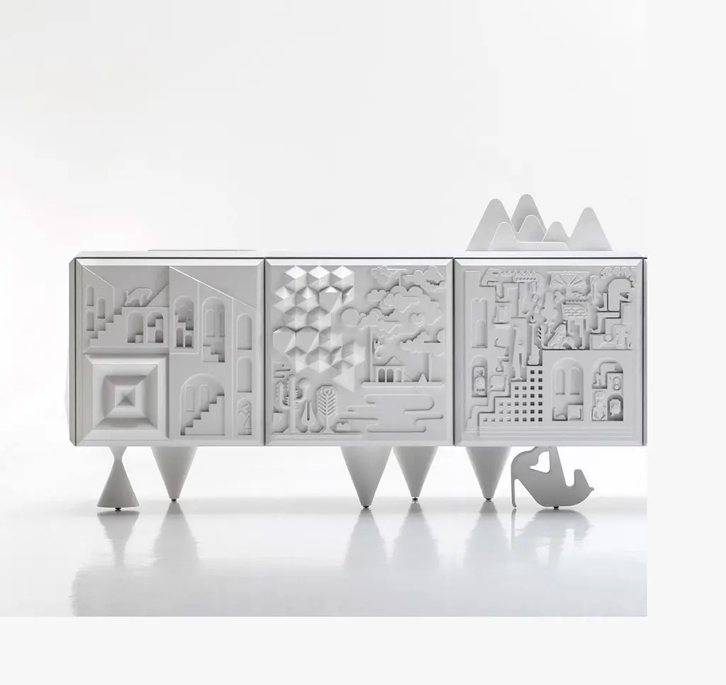Combined 190 Tout va Bien cabinetDimensions: D 50 x W 190 x H 82 cm Materials: Containers manufactured of MDF in a matte lacquered finish, attached together using a mechanical fixing system. Doors made of MDF with mechanized wave-form fronts, and matte lacquered finish. Glass top 8mm thick and transparent. Octagonal legs are made of gold extruded aluminum. The structure is made of tubular iron with welded strips to assemble the legs.Also available in other sizes and in color grey.Combination of Module 120 and Module 60 with custom legs. Produced with yesteryear quality, using here and now technology in white or graphite grey. This Cabinet designed by Antoine and Manuel for BD is a surprising mixture of applied arts, hieroglyphic language, contemporary graphics, fantasy, and optimism.In 1972, a group of young architects and designers from Barcelona created BD with the aim of producing and marketing furniture and other objects for our projects, with complete creative freedom and with a criterion that has turned out to be quite different from the norm at companies in the sector, regarding both the shape and function.