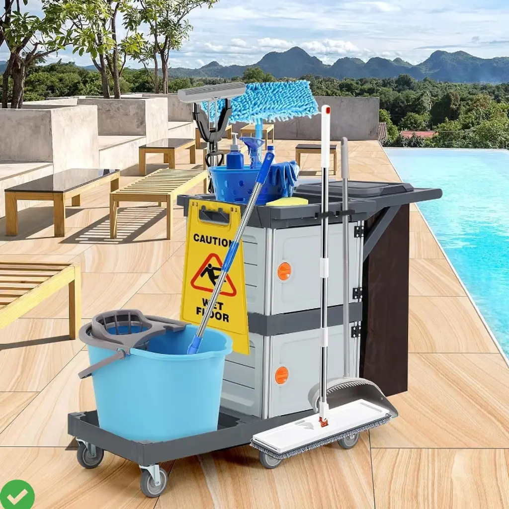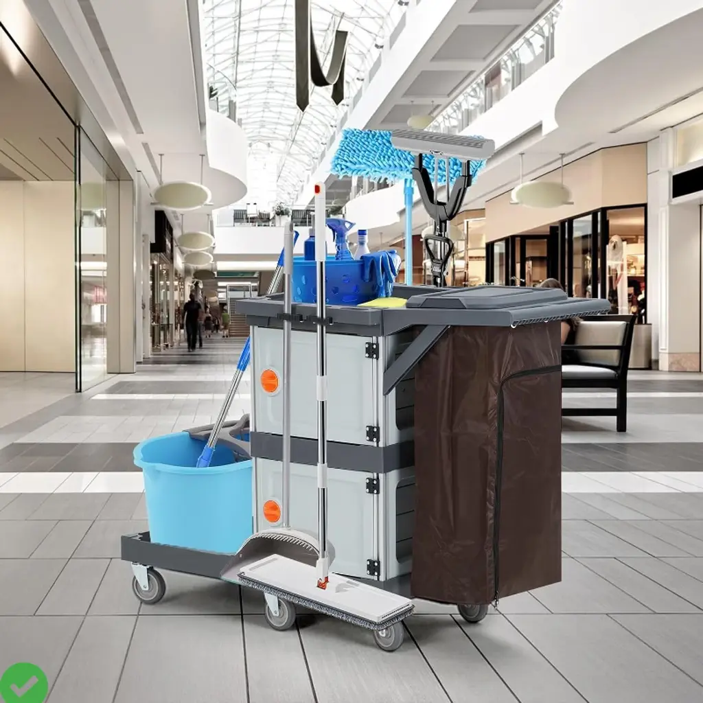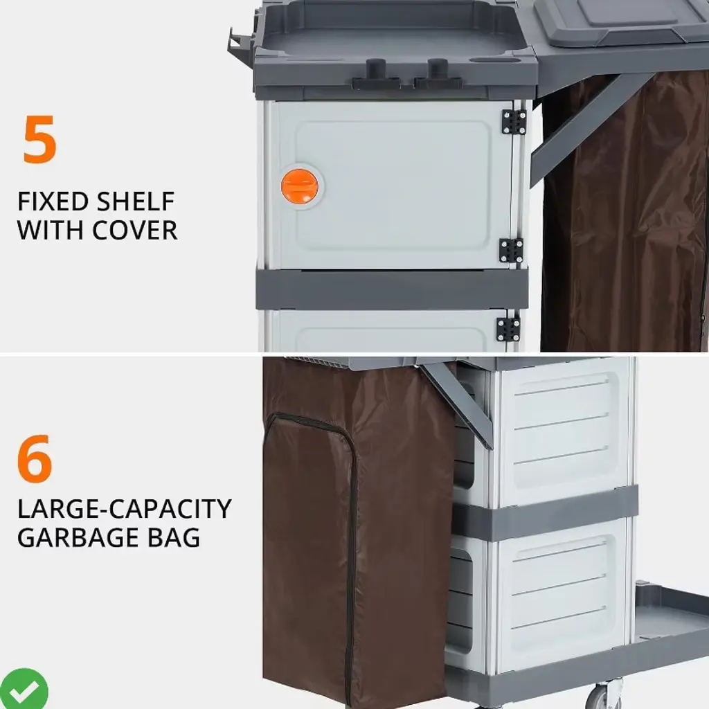 This commercial-grade janitorial cart offers intelligent storage with dual cabinets, a three-tier shelf, and multiple hooks and bars. Everything stays neatly organized and within reach¡ªminimizing time spent searching for supplies and maximizing cleaning efficiency, Efficient Organization & Storage.