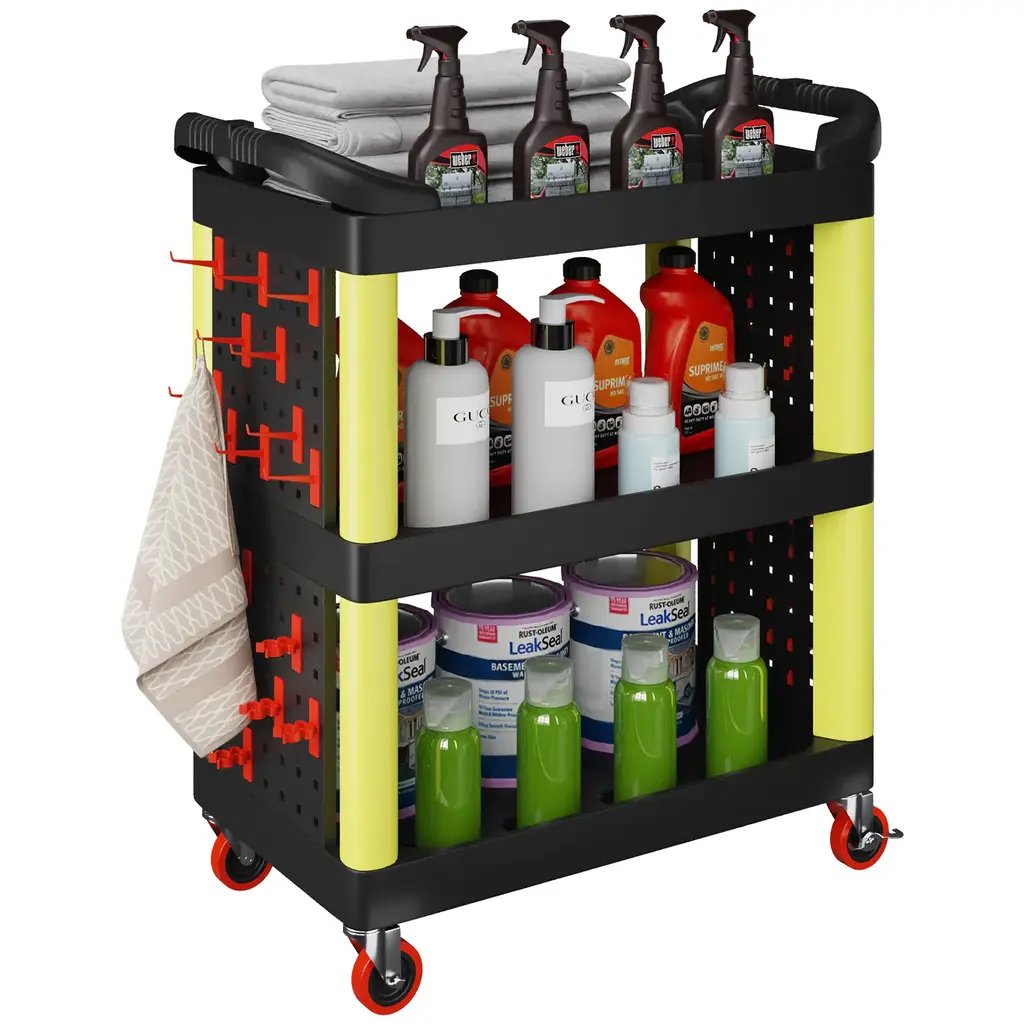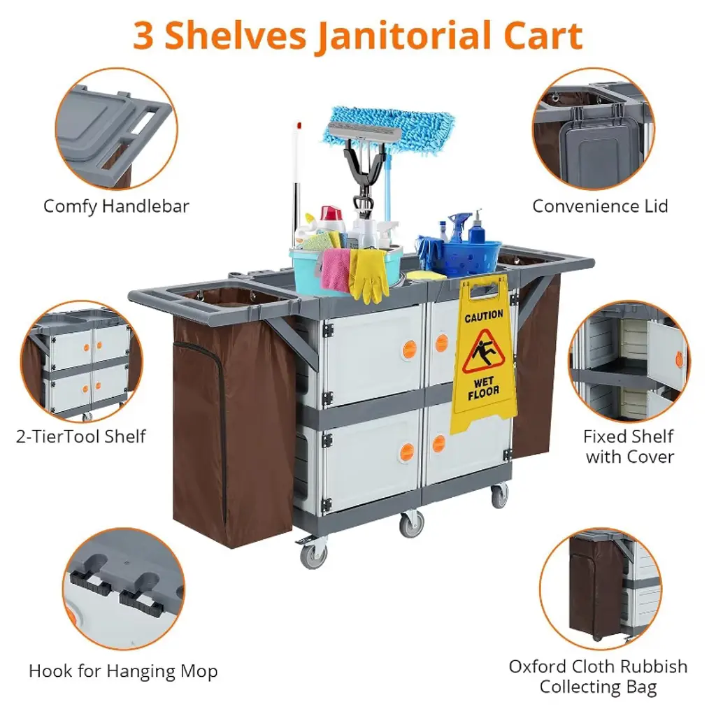 Streamline your cleaning and housekeeping tasks with this Commercial Janitorial Cart designed for hotels, offices, schools, and medical facilities. Equipped with two storage layers, four small cabinets, multiple hooks, and rods, it offers convenient organization and secure storage for all your cleaning tools, reducing loss and improving efficiency. Crafted from durable polypropylene (PP) and reinforced aluminum tubes, this cleaning cart boasts excellent load-bearing capacity, resisting cracking and peeling for reliable long-term use. It can support an overall weight of up to 220 lbs, making it ideal for heavy-duty cleaning environments. The rear features a large, replaceable Oxford cloth storage bag with buckle attachments for easy hanging and durability against tearing, perfect for collecting trash or storing supplies. Six silent castors provide smooth, quiet mobility, while lockable wheels ensure stability when stationary. The wide ergonomic handle allows effortless pushing around busy spaces without disturbing occupants. The spacious front platform supports up to 80 lbs, suitable for a water squeezer or garbage can. A fixed groove on the platform secures items and prevents shaking or falling during movement, enhancing safety and convenience. Dimensions: [Please specify if available] Material: Durable polypropylene, aluminum tubes, Oxford cloth storage bag What You Get: One commercial janitorial cart with cabinets, hooks, storage bag, and wheels After-Sales Service: Customer support available for product inquiries and assistance