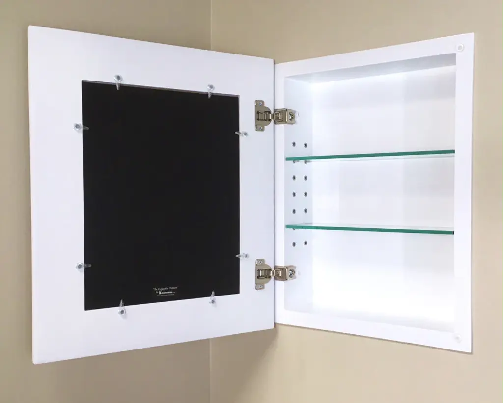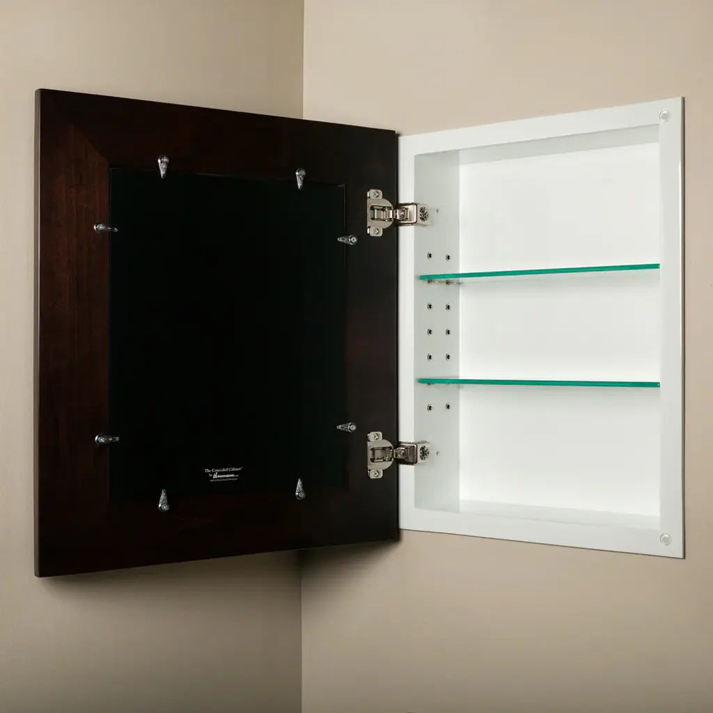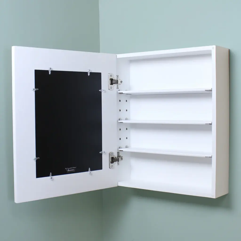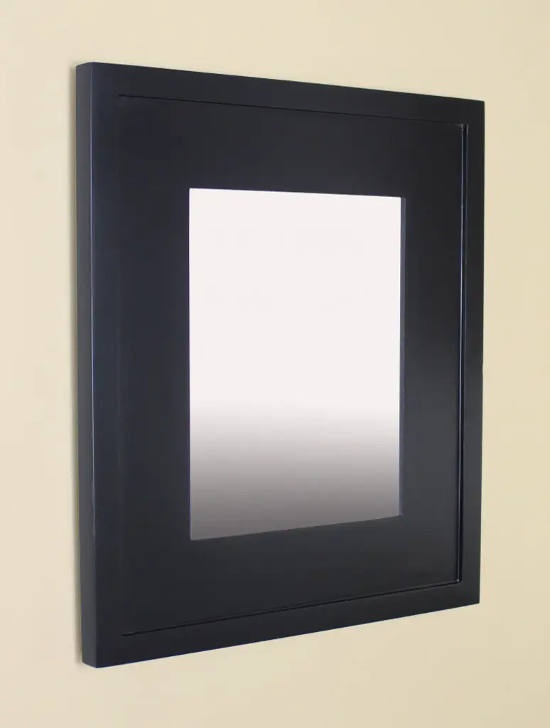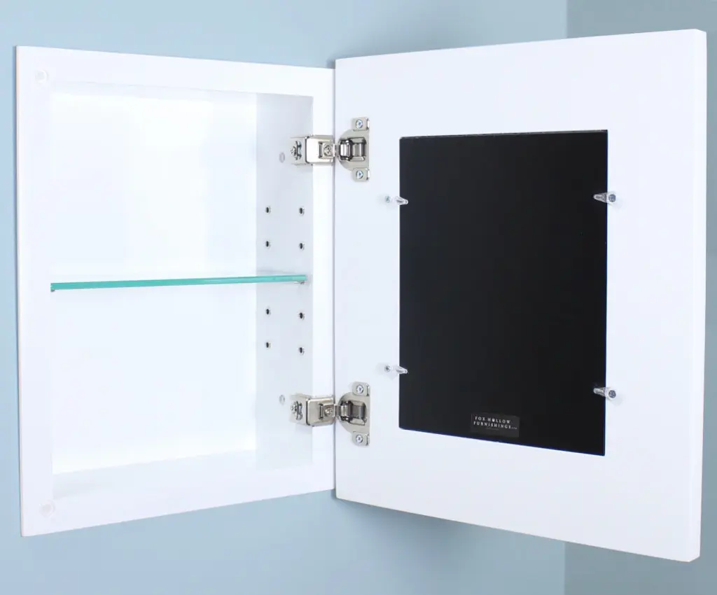 We believe the Fox Hollow Furnishings Mirrored Medicine Cabinet is the nicest recessed medicine cabinet available anywhere today. It features the look of an upscale framed mirror, is handmade from real wood, and sits closer to the wall than any other medicine cabinet we''ve ever seen. Our unique design also allows you easy access to the mirror so you can remove it for thorough cleaning or replace it, should anything ever happen to it -- without having to replace the entire cabinet.Compact Portrait Mirrored Medicine Cabinets are available in White, Shaker White, Black, Coffee Bean, and Unfinished flat frame or Unfinished raised edge frame. Measures 11" W x 14" H x 3 3/4" D and holds an 8" x 10" mirror.individually handcrafted from US grown hardwoodslacquer finish makes it resistant to moisture (no lacquer on Unfinished frame models)completely reversible; mounts with door opening in either directionincludes 1 high quality beveled glass shelf adjustable to 5 different heightsDimensions:In-wall cabinet, 14" H x 11" W x 3 3/4" DRough opening, 14 1/4" H x 11 1/4" W x 4" DCabinet interior, 13" H x 10" W x 3 1/2" DExterior frame, 15 3/4" H x 13 3/4" WHolds an 8" x 10" mirror• Note: The cabinet overlay (flange) will cover up to 1" in height and up to 1" in width.This listing is for 1 Mirrored Portrait Cabinet.