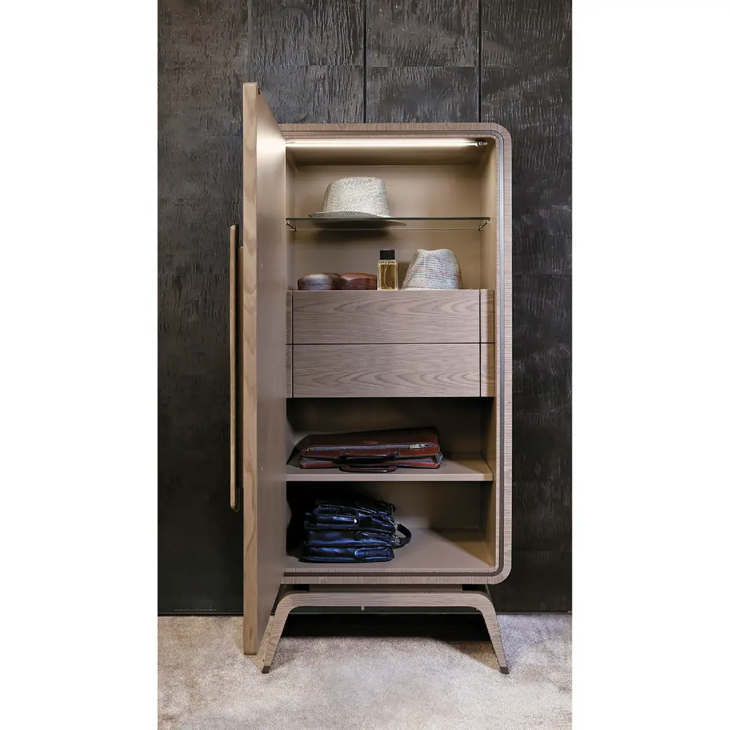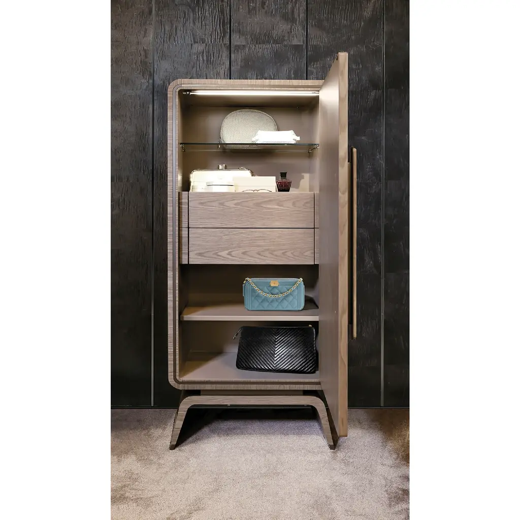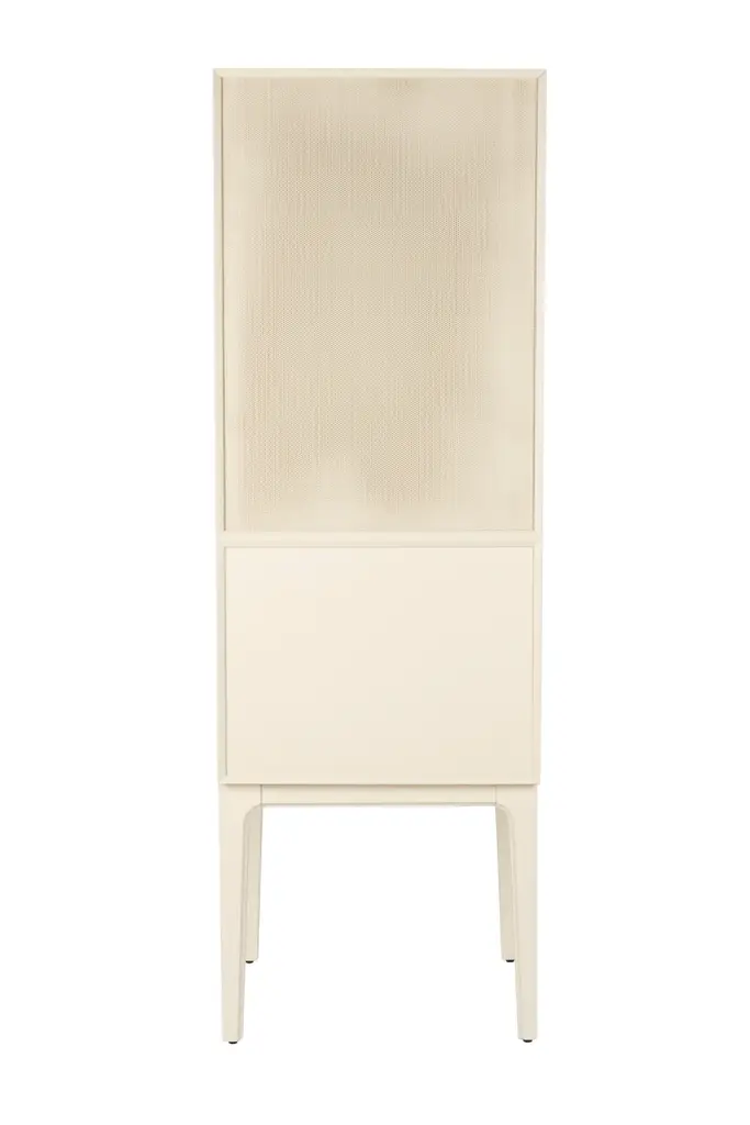 Introducing the Hanami collection compact single-door cabinet. Boasting a wooden structure and polyester lacquered Pearl Champagne finish, this cabinet exudes luxury. The textured front door features nabuk quilting and a metal handle, with internal soft closing drawers and a strip LED option. Upgrade your space with Redeco Hanami.