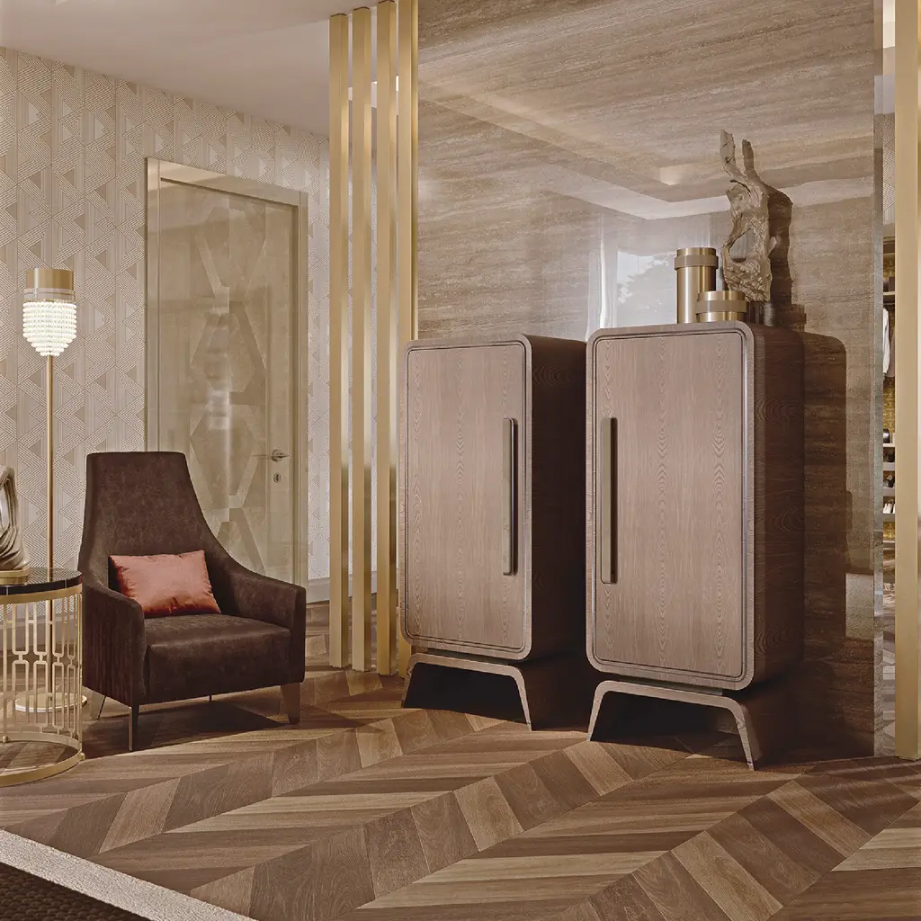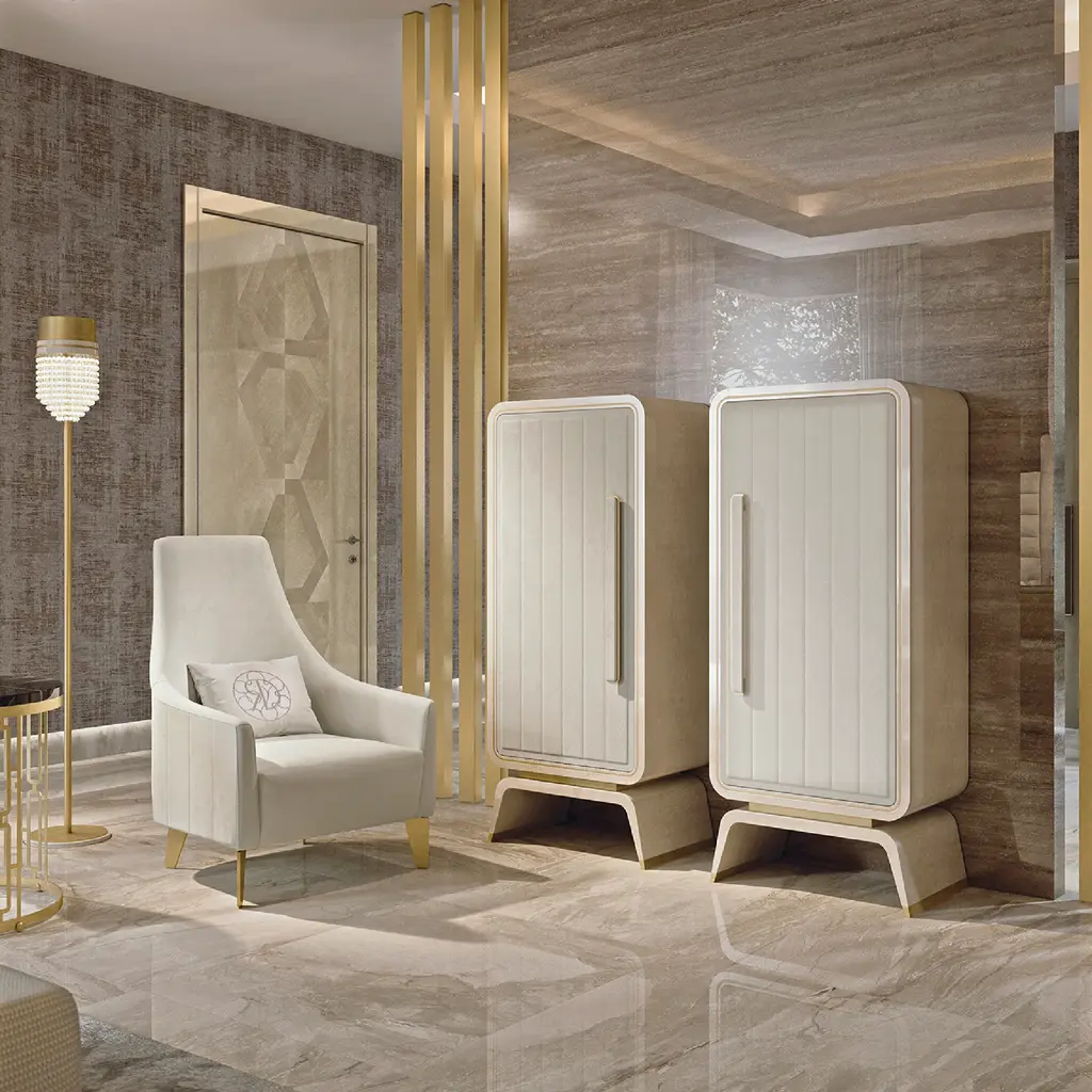 Introducing the Hanami collection compact single-door cabinet. Boasting a wooden structure and polyester lacquered Pearl Champagne finish, this cabinet exudes luxury. The textured front door features nabuk quilting and a metal handle, with internal soft closing drawers and a strip LED option. Upgrade your space with Redeco Hanami.
