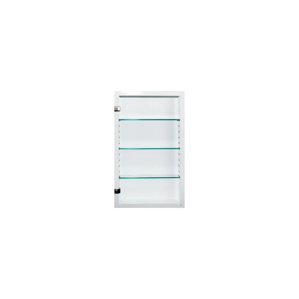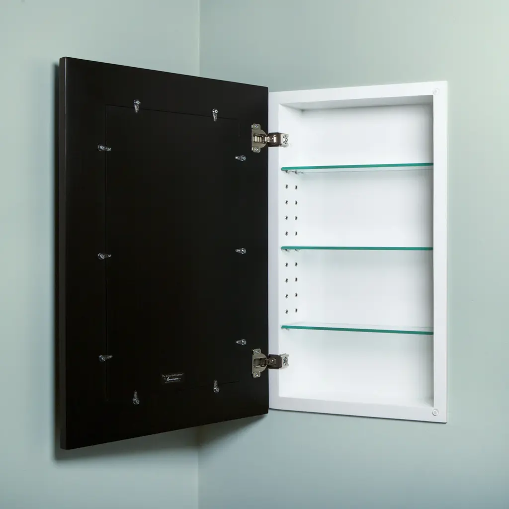 The Extra Large Black Concealed Cabinet features our raised edge profile door painted a rich, deep black, giving this a modern look. Looks great in contemporary designs. Measures 24" H x 14" W x 3.75" D and holds up to 11" x 20" artwork from your personal collection.Features:Individually handcrafted from US grown hardwoodsLacquer finish makes it resistant to moistureCompletely reversible; mounts with door opening in either directionIncludes 3 high quality beveled glass shelvesAdjustable to 11 different heightsPlexiglass front helps to protect artworkNo artwork or matting includedDimensions:In-wall cabinet, 24" H x 14" W x 3 3/4" DRough opening, 24 1/4" H x 14 1/4" W x 4" DCabinet interior, 23" H x 13" W x 3 1/2" DExterior frame, 25 7/8" H x 16 7/8" WHolds up to 11" x 20" artwork*Note: The cabinet overlay (flange) will cover up to 1" in height and up to 1" in width.Interior Finish:-White (Recommended for all uses, including medicine cabinet, make-up cabinet, spice cabinet, key cabinet, jewelry cabinet, etc.)