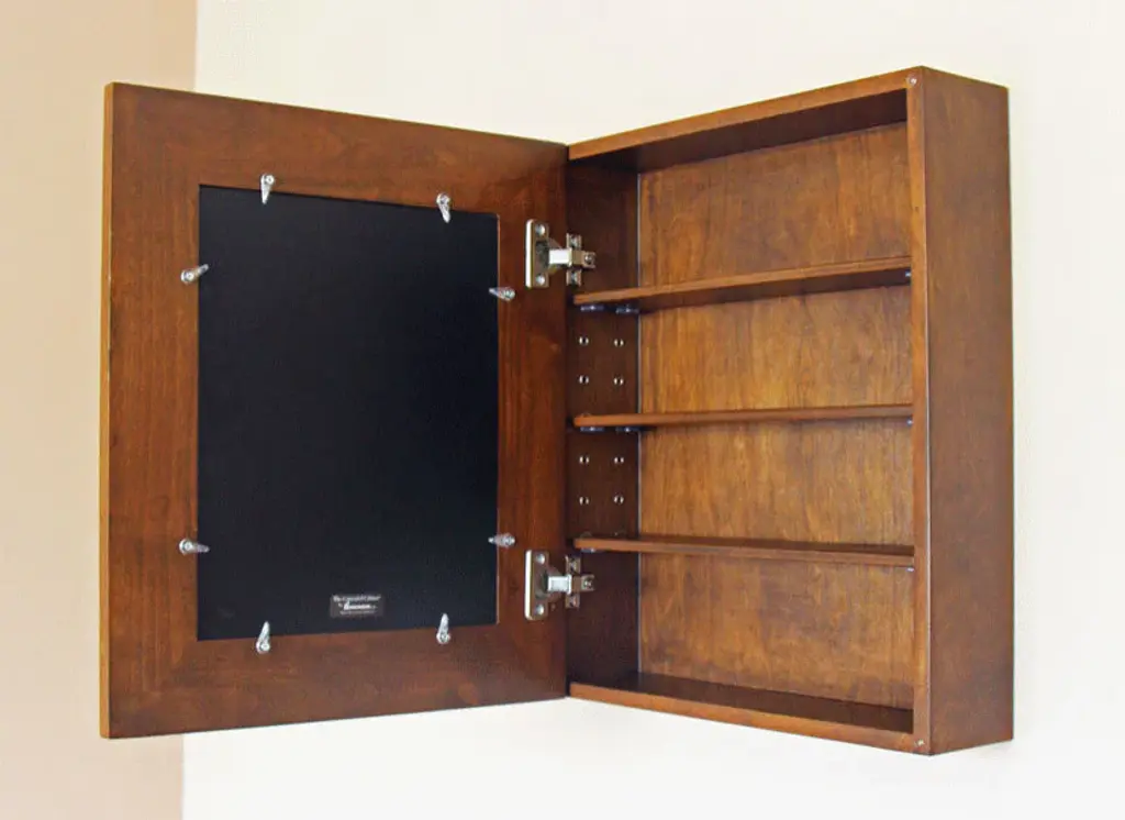 The Regular Coffee Bean Concealed Cabinet features our raised edge profile door and is stained with the darkest brown we could find. Works well with both modern and traditional decor. Measures 16" H x 13 1/8" W x 3 3/4" D and holds up to 10" x 13" artwork from your personal collection.Features:-Individually handcrafted from US grown hardwoods-Lacquer finish makes it resistant to moisture-Completely reversible; mounts with door opening in either direction-Includes 2 high quality beveled glass shelves-Adjustable to 5 different heights-Plexiglass front helps to protect artwork No artwork or matting includedDimensions:-In-wall cabinet, 16" H x 13 1/8" W x 3 3/4" D-Rough opening, 16 1/4" H x 13 3/8" W x 4" D-Cabinet interior, 15" H x 12 1/8" W x 3 1/2" D-Exterior frame, 18 7/8" H x 15 7/8" W-Holds up to 10" x 13" artwork• Note: The cabinet overlay (flange) will cover up to 1" in height and up to 1" in width.Interior Finish:-White (Recommended for all uses, including medicine cabinet, make-up cabinet, spice cabinet, key cabinet, jewelry cabinet, etc.)