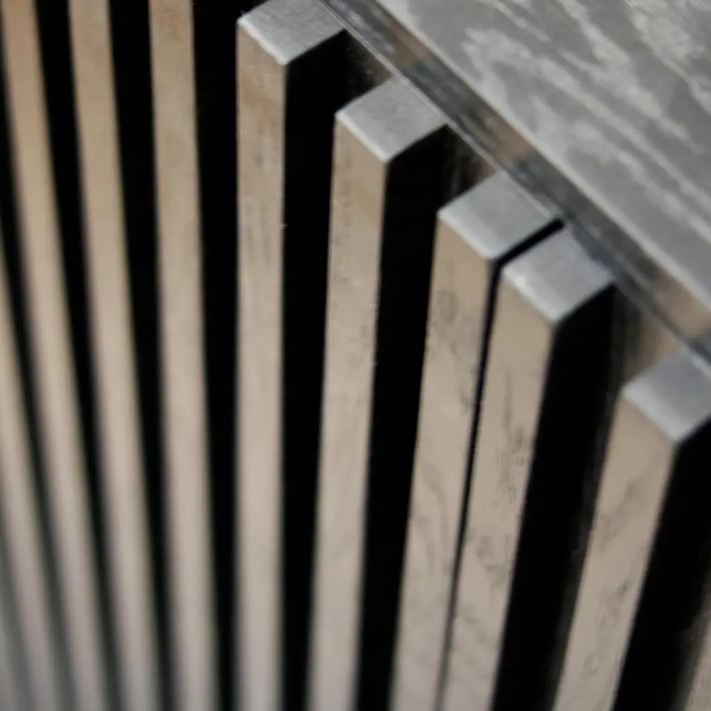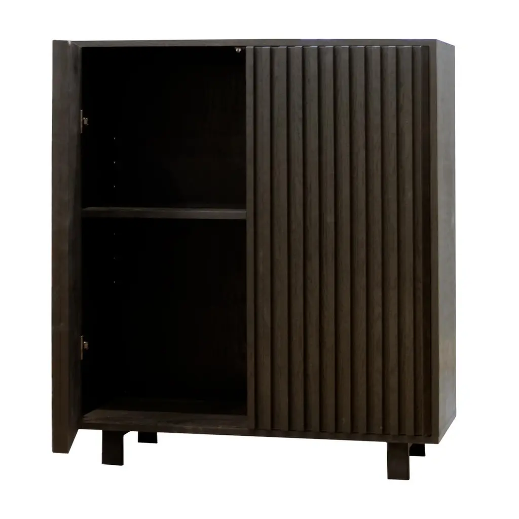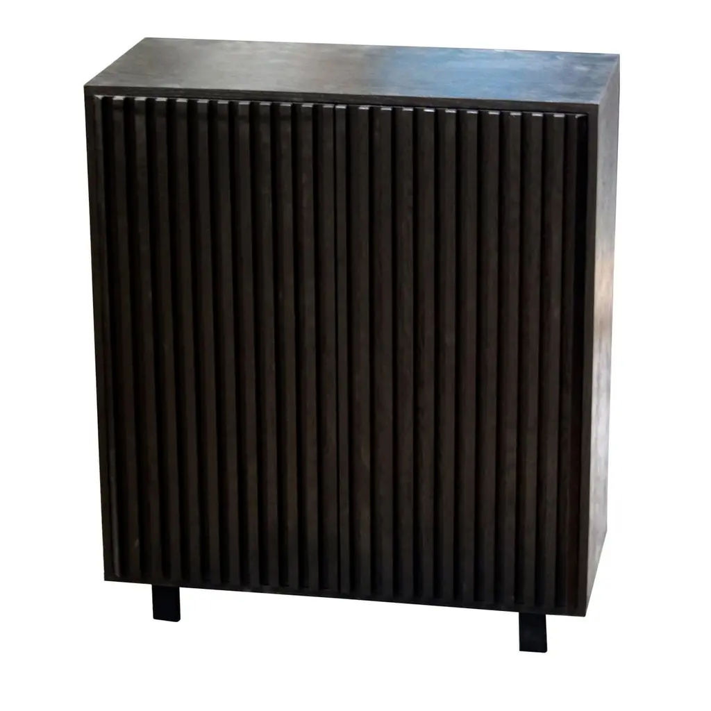 The Constantine blackened oak storage cabinet features slatted doors entirely constructed and finished by hand, with brass details, adjustable shelf. and a solid steel base. This cabinet can be completed customized to perfectly suit your space.