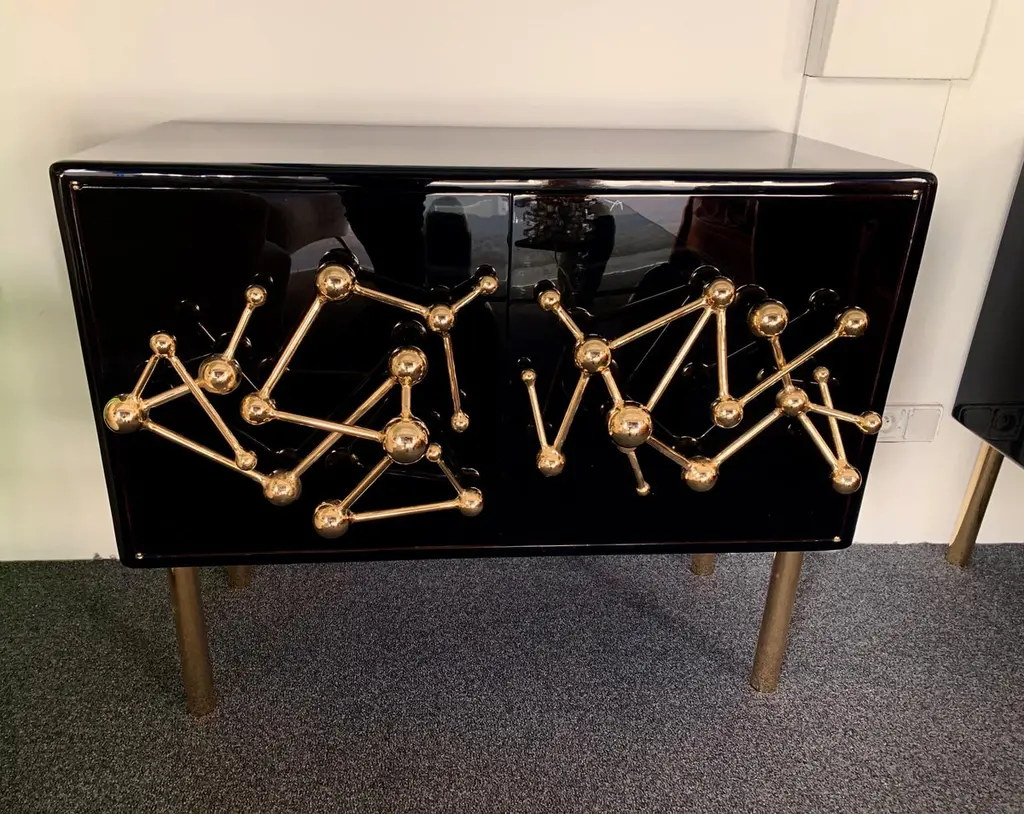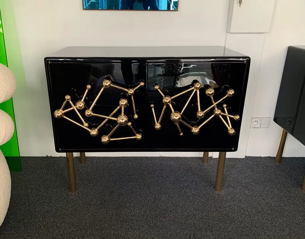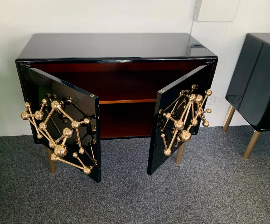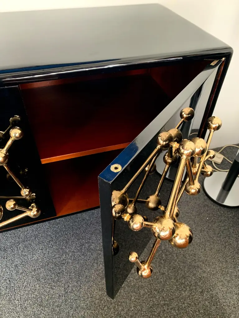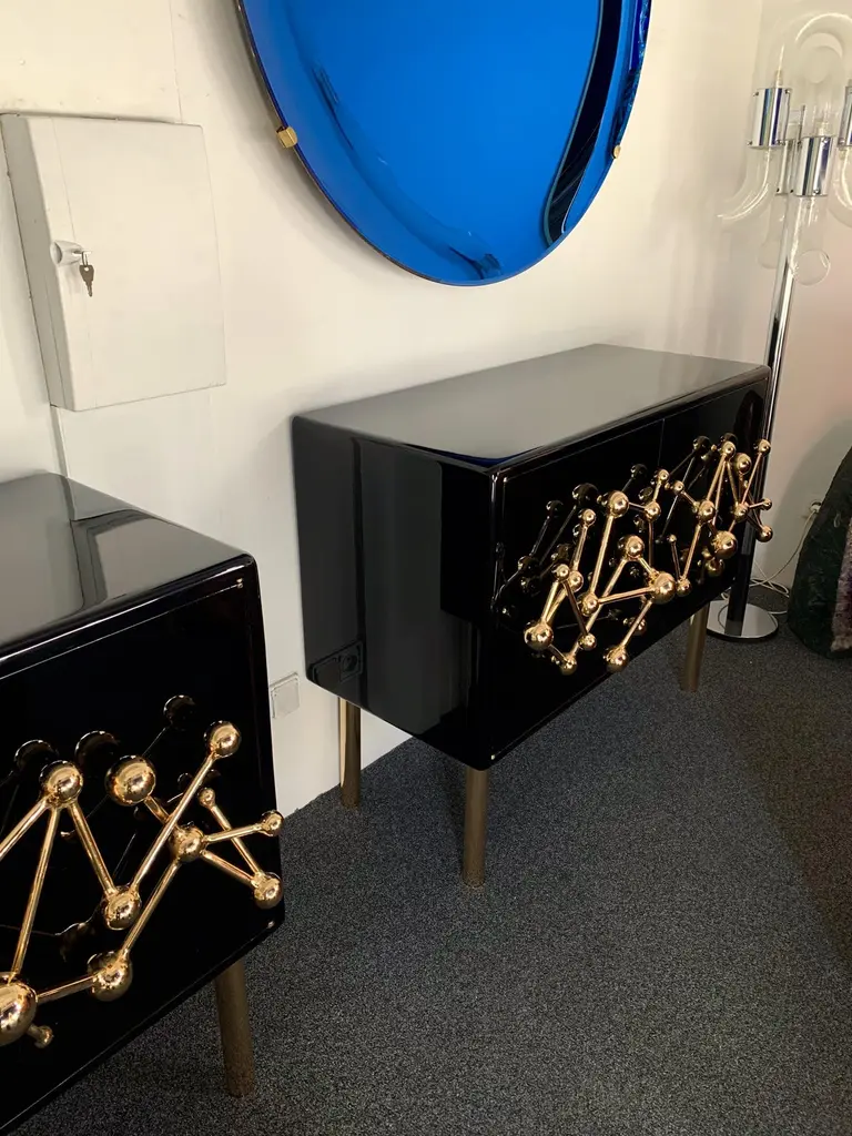 Contemporary Atomo black lacquered cabinets buffets by the Italian designer Antonio Cagianelli , sculpture handle and feet in nice gilt wrought iron made in gold bath 24-karat, in a brass stylePrice by cabinet.