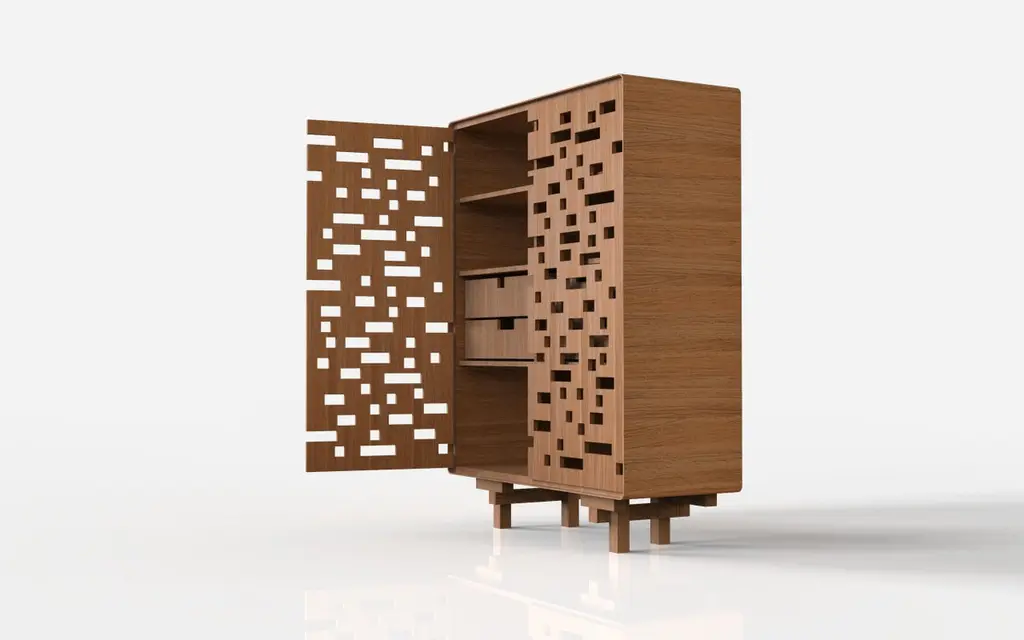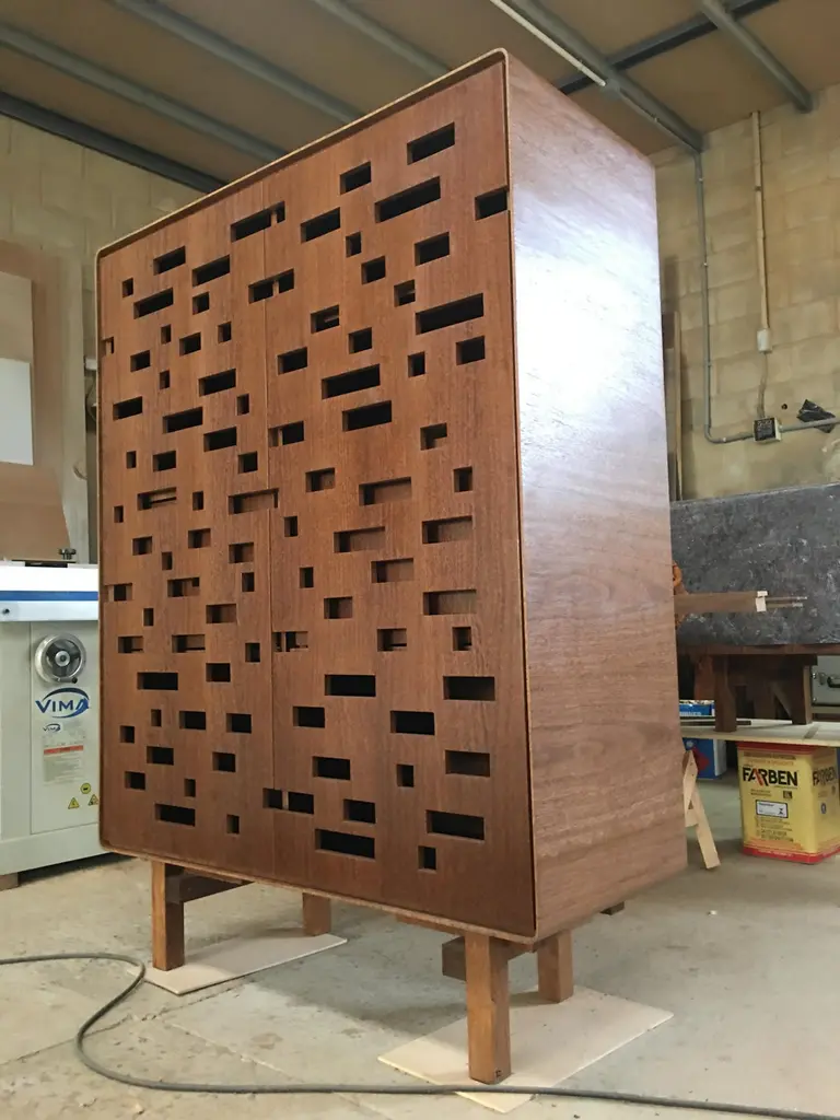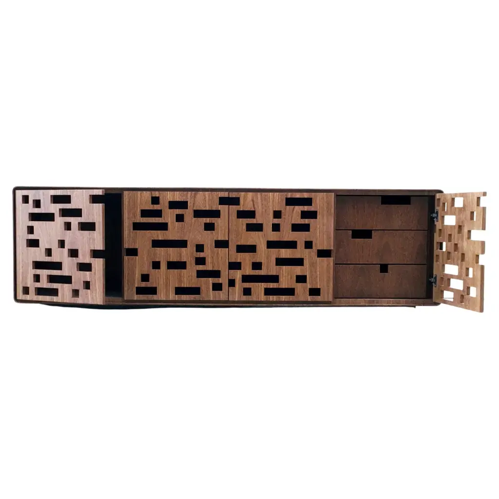 In the plenitude of timelessness, the Bar Brick is inspired in the bricks facades worldwide. The door’s hollow cutouts have the function of providing the ventilation of the niches made of shelters and drawers.Its manufacturing is in an industrialized wooden plate, and its feet in solid wood. The finish is made by the options made available on a natural sheet of wood and german ironworks.