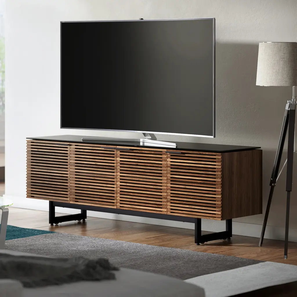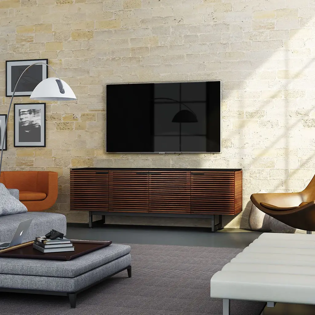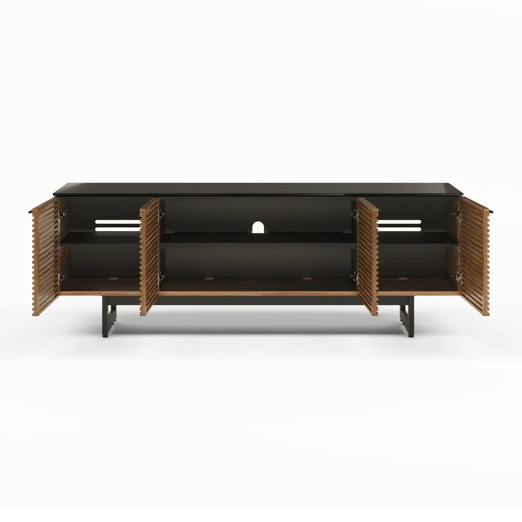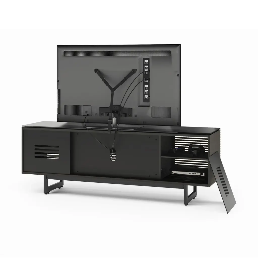 Streamline your entertainment experience with the Corridor 8179 Home Theater Cabinet from BDI. Two louvered doors lead you to a spacious compartment with three adjustable shelves while providing solid air ventilation for electronics. The black, micro-etched glass top is scratch resistant and can accommodate up to an 85" flat panel display, ensuring your space is organized and ready to entertain.Highlights