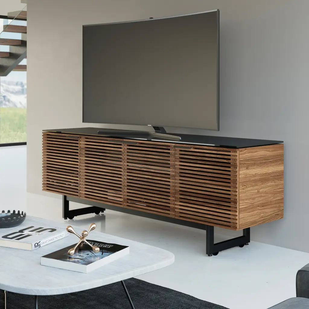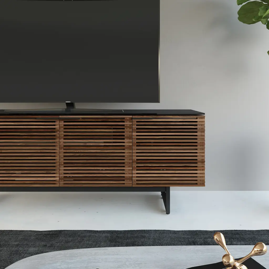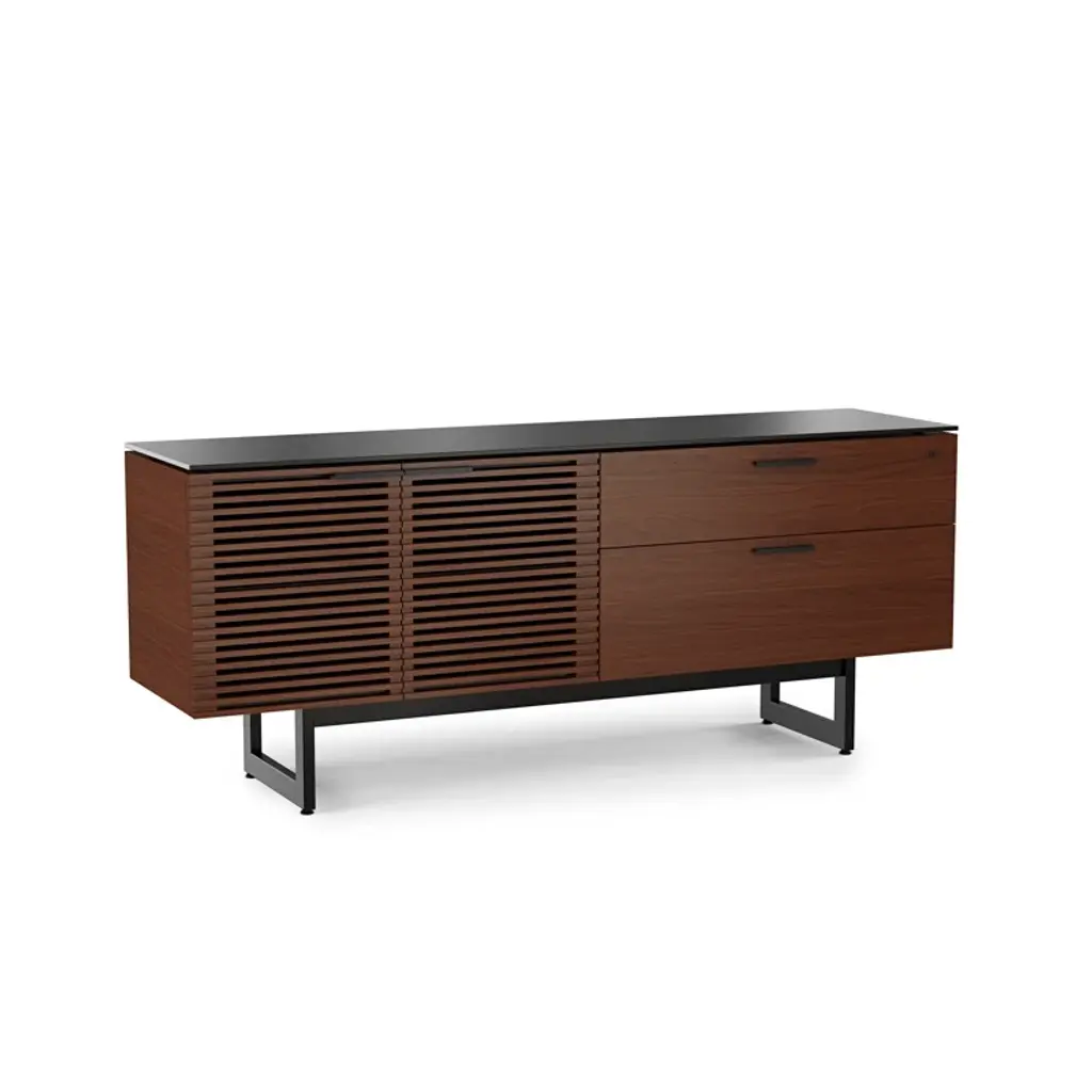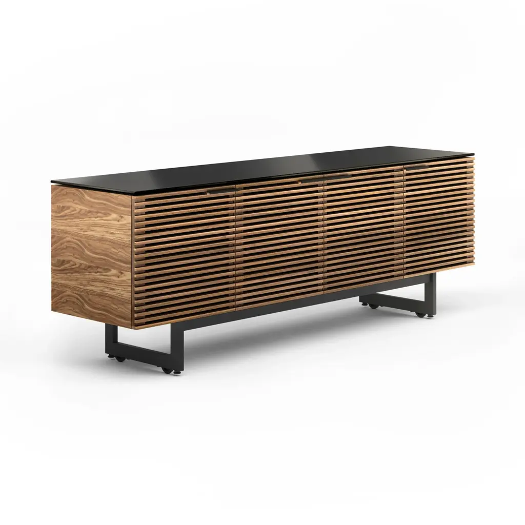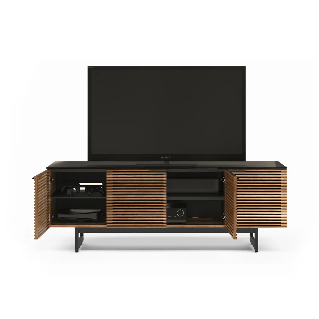 Streamline your entertainment experience with the Corridor 8179 Home Theater Cabinet from BDI. Two louvered doors lead you to a spacious compartment with three adjustable shelves while providing solid air ventilation for electronics. The black, micro-etched glass top is scratch resistant and can accommodate up to an 85" flat panel display, ensuring your space is organized and ready to entertain.Highlights