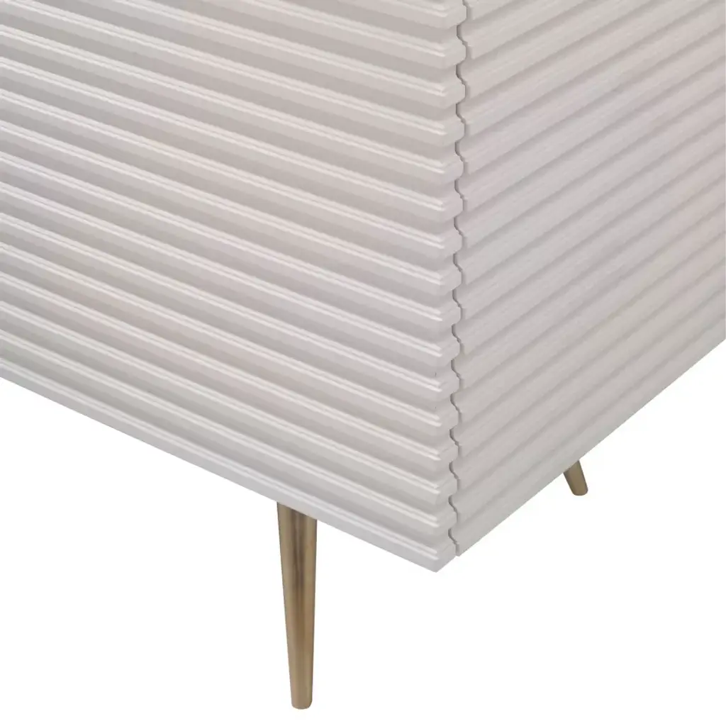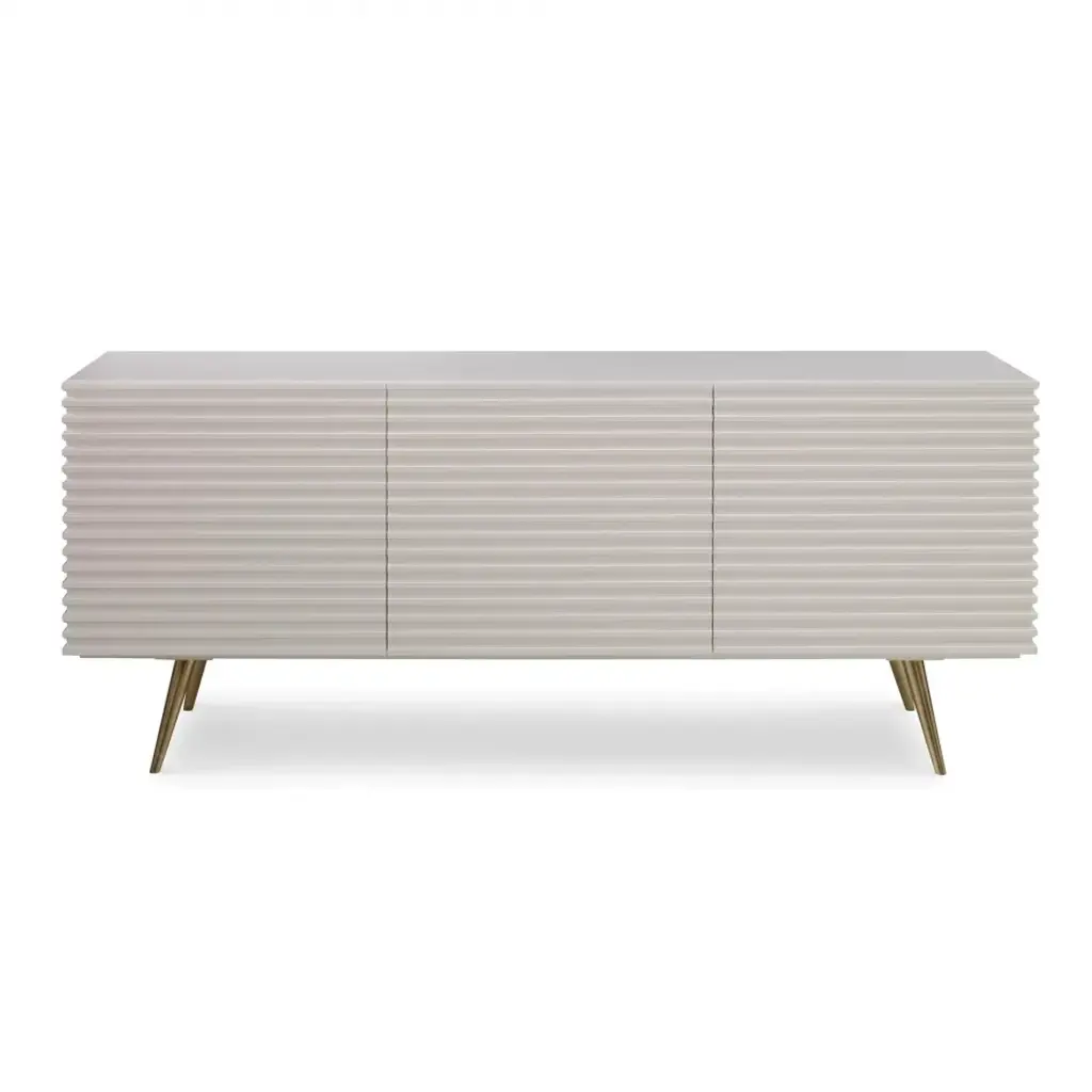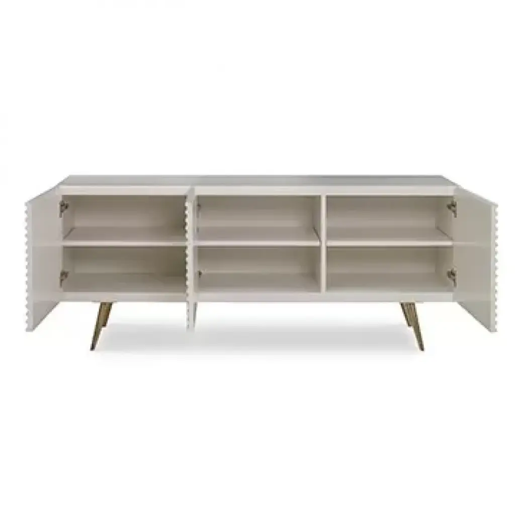 This three door low cabinet features carved, corrugated sides and front. Finished in glossy white, the cabinet is raised on tall, tapering, splayed brass legs. Adjustable shelves and wire access is included.