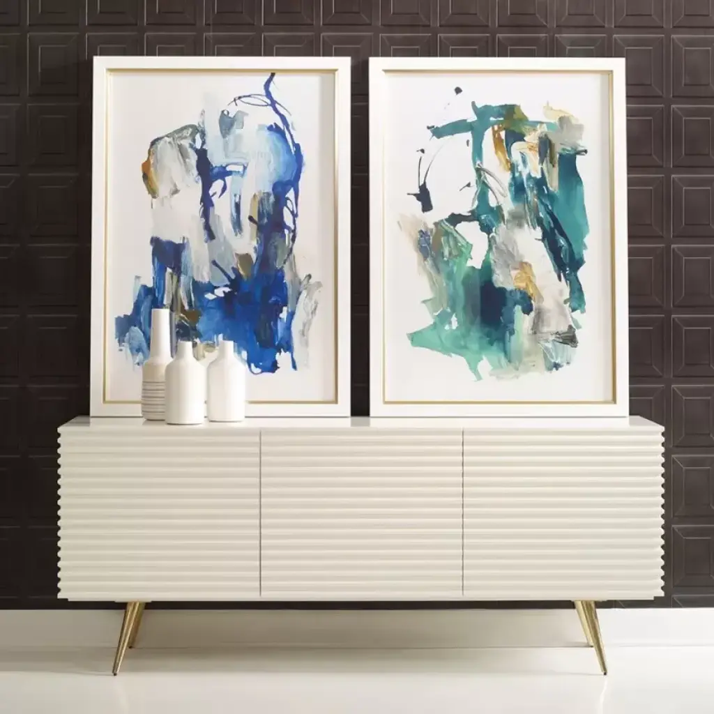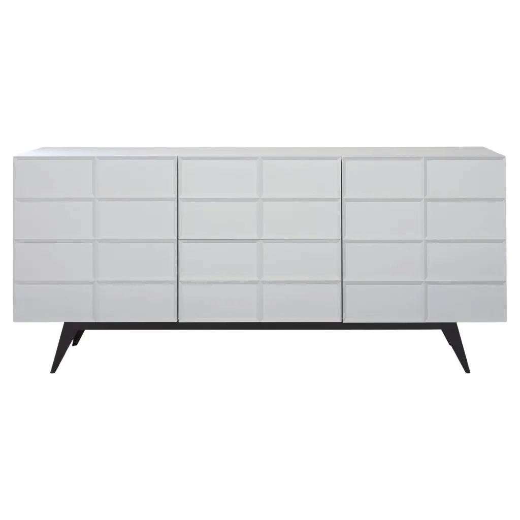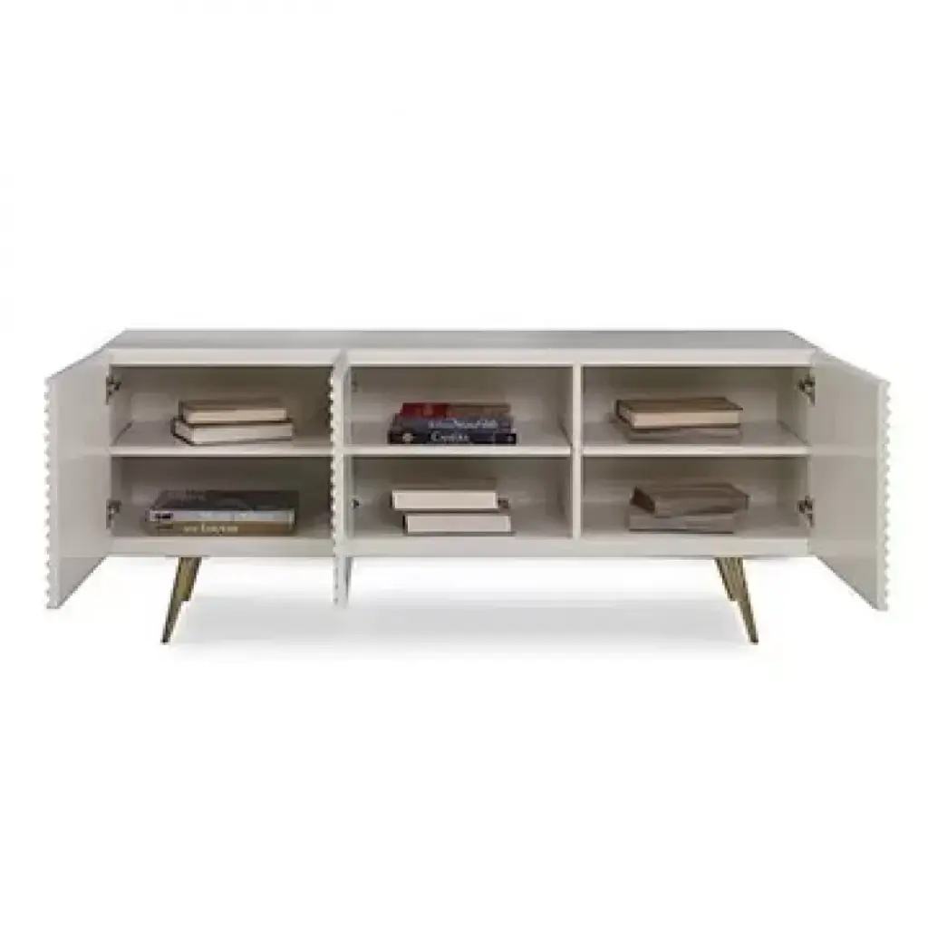 This three door low cabinet features carved, corrugated sides and front. Finished in glossy white, the cabinet is raised on tall, tapering, splayed brass legs. Adjustable shelves and wire access is included.