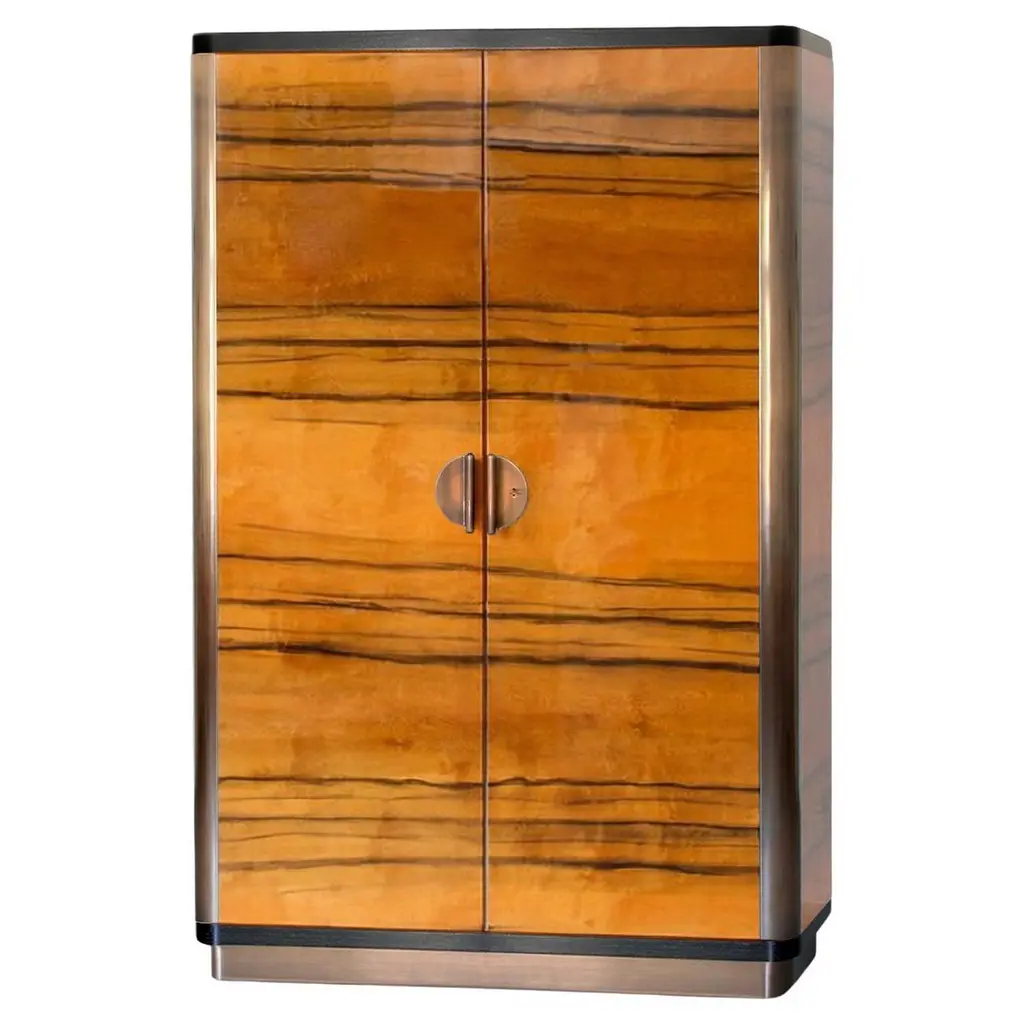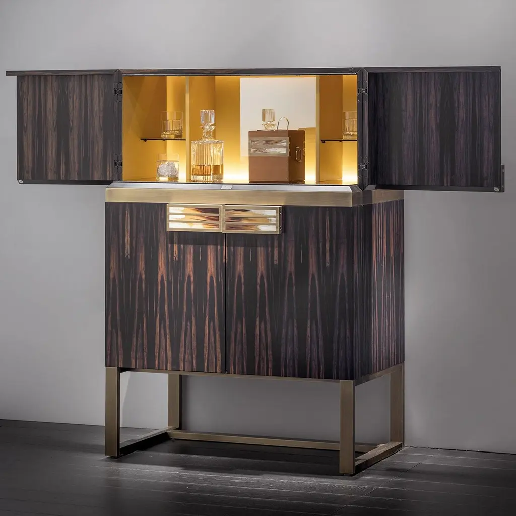 A magnificent addition to a modern home, where it will be eye-catching and functional at the same time, this cabinet bar rests on a structure in burnished brass with curved corners. The piece is in precious ebony macassar with a matte varnish. Its standout element is the superb decoration of its handles in opaque-finished horn and bronzed brass. Inside, the piece has a wood interior in tangerine with a matte finish and is equipped with glass holders and a fridge. Other finishes and dimensions are available - please consult the Concierge.