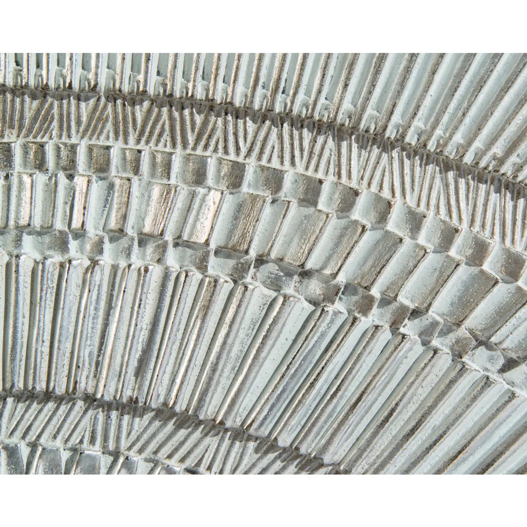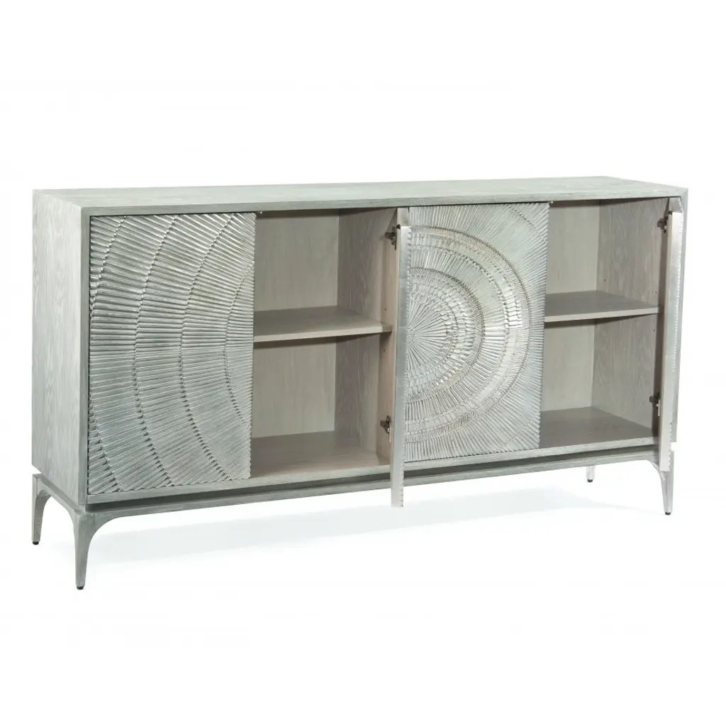 The doors have a silver-white radiating pattern from the center, and they are set in a gray oak case. Behind the auto-latch doors, there is one adjustable shelf.