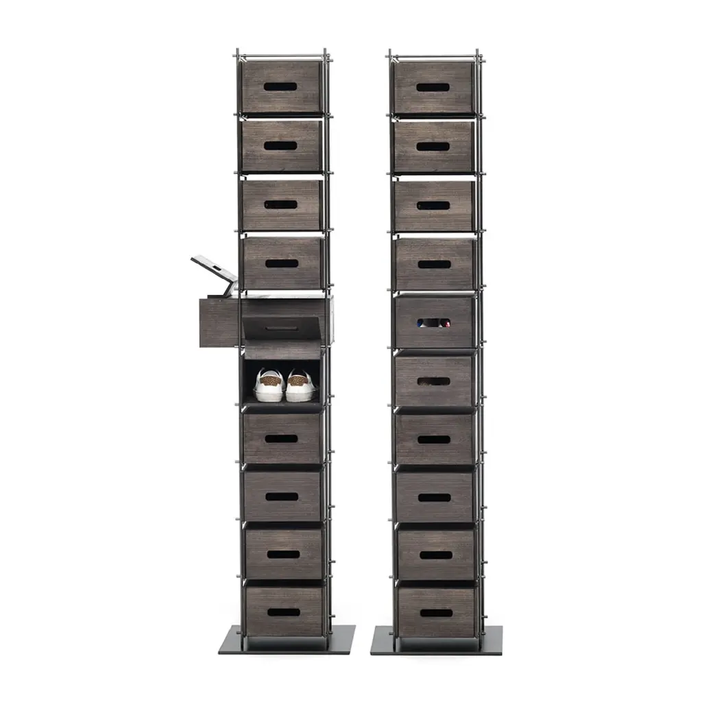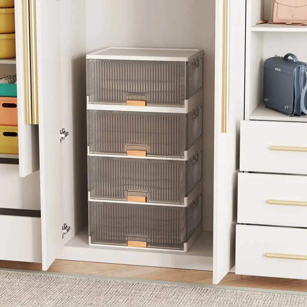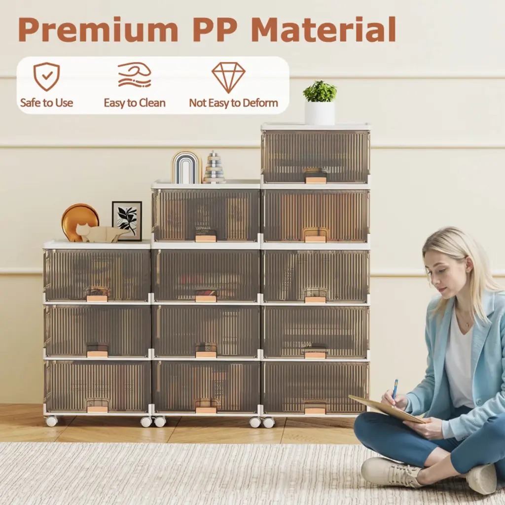 The stackable storage bin is a practical and versatile solution for keeping your belongings organized. With 13.5Gal large load capacity, it offers plenty of space to store shoes, clothes, books, or food. Its flexible modular design allows you to customize the layout by splitting and combining cabinets as needed. The collapsible bins are easy to fold for convenient storage and quick setup. Equipped with detachable universal wheels, the storage bin can be moved around effortlessly, and 2 lockable wheels provide stability when stationary. Crafted from premium PP material, the cabinet is deformation-resistant and safe to use. Convenient handles make it easy to reach items inside, while side clips ensure secure stacking for stability and organization in any space. The stackable storage bin is an ideal storage solution for various needs in your home.Features4 large compartments for ample storage Flexible modular design for customization 2 opening ways to get interior items: top open or front open Four universal wheels with mute design for convenient mobility Locking mechanism on 2 wheels for secure positioning High-quality PP for safety use and long-time lasting Smooth and water-proof surface for easy cleaning Safe to use with the side clips for added stability Convenient handles for easy access of interior itemsColor: White + Brown Material: PP, ABS Overall Dimensions: 15" x 11" x 32" (L x W x H) Interior Size of Each Cube: 14" x 10" x 7.5"(L x W x H) Folded Height: 1.5" Weight Capacity in Total: 55 lbs Weight Capacity of Top: 11 lbs Weight Capacity of Each Cube: 11 lbs Net Weight: 7 lbs Package Includes: 1 x 4-cube Storage Cabinet 1 x Instruction