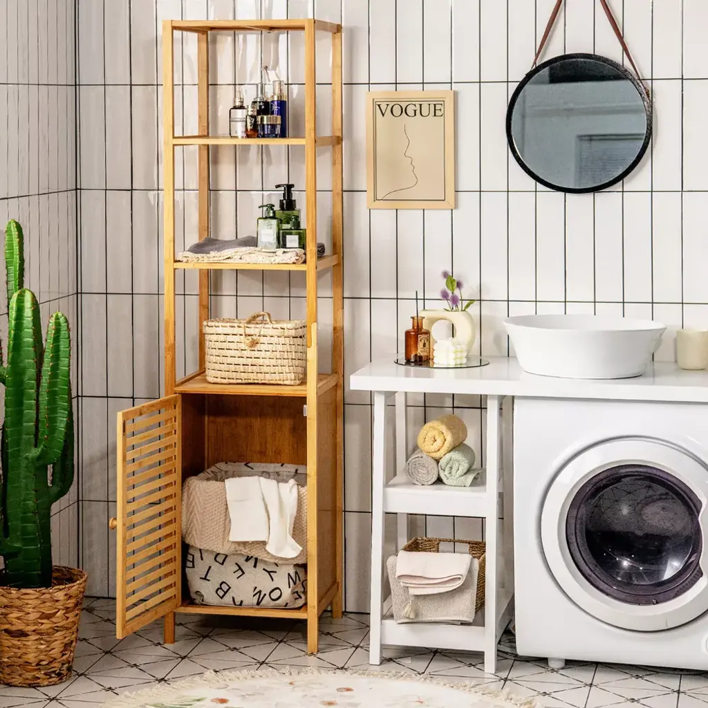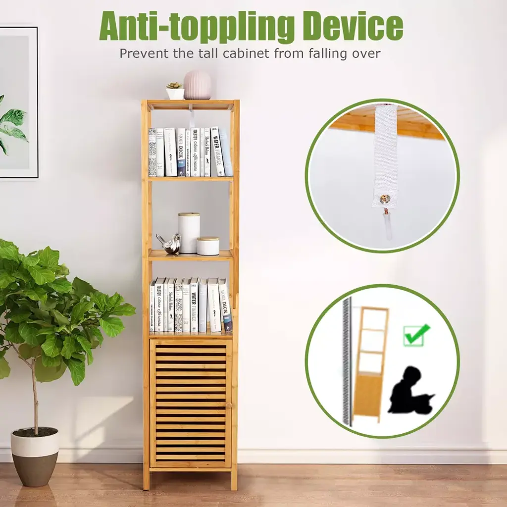 The 65" tall freestanding floor cabinet is a great choice to expand the storage space in the small bathroom. Its slim body contains 3 open shelves and a door cabinet, offering generous storage space and a classified solution to various bathroom supplies. Meanwhile, the slatted layer boards easily drain excess water, and the louvered door facilitates ventilation. What’s more, the bathroom shelving unit is made of selected bamboo material, which is sturdy, waterproof and easy to clean. In addition, there is a wall anchor device at the back for you to fix the standing cabinet in case of accidental toppling. And the 4 feet not only ensure solid support, but also make daily cleaning easier. With all the merits above, the storage cabinet is suitable for bathroom, living room, study and kitchen.FeaturesEquipped with 3 open shelves and a cabinet for classified storage The tall and slim shelving unit maximizes the use of space Made of natural bamboo for a long service life Processed surface is smooth and waterproof for easy cleaning Fitted with anti-toppling device for extra stability Raised feet prevent standing water from soaking the cabinet Can be used in bathroom, kitchen, living room and moreColor: Natural Material: Bamboo Overall Dimensions: 15.5" x 14.5" x 65" (L x W x H) Net Weight: 16.5 lbs Weight Capacity of Each Tier: 22 lbs Inner Dimensions of Cabinet: 14.5" x 14" x 22.5" (L x W x H) Package Includes: 1 x Floor Cabinet 1 x Instruction
