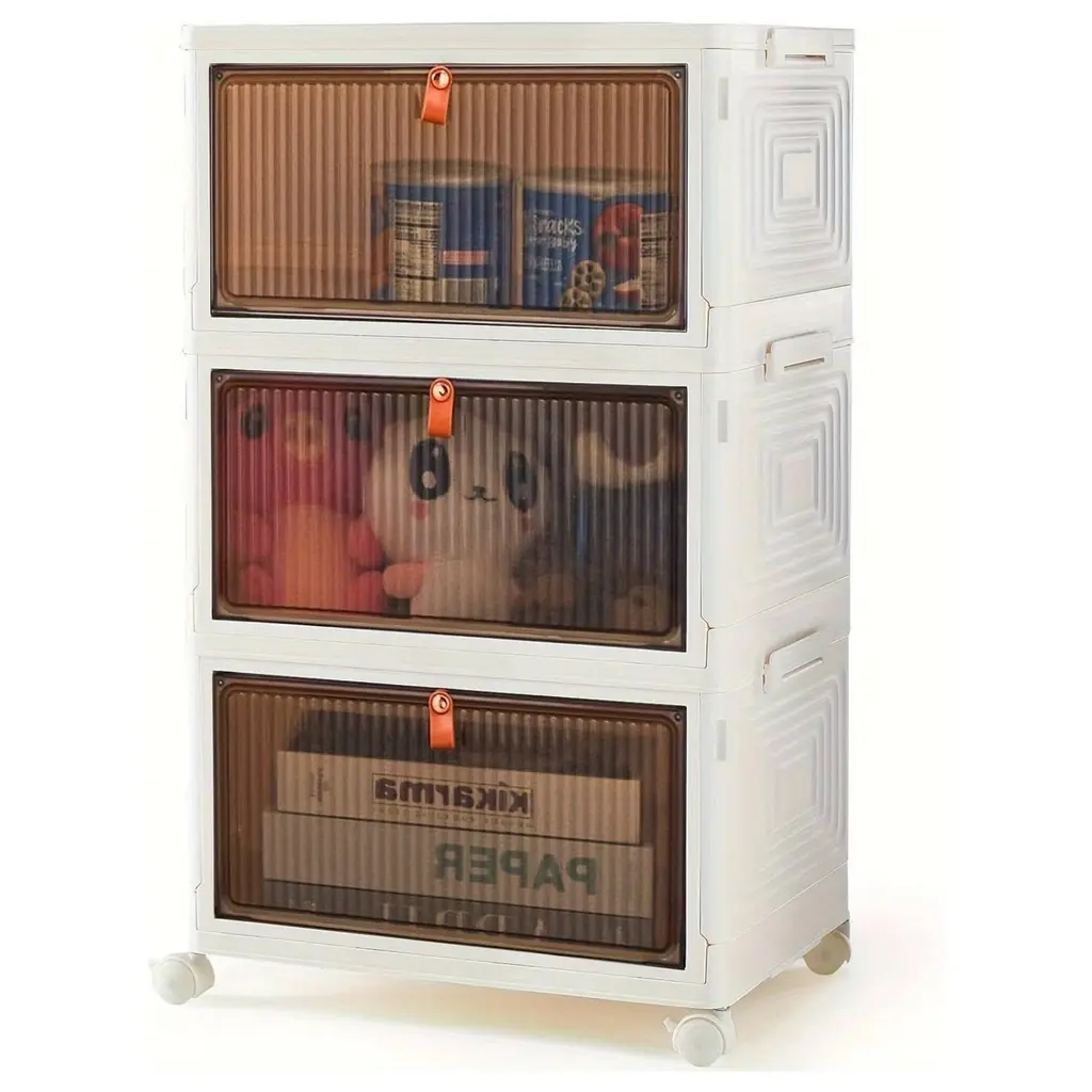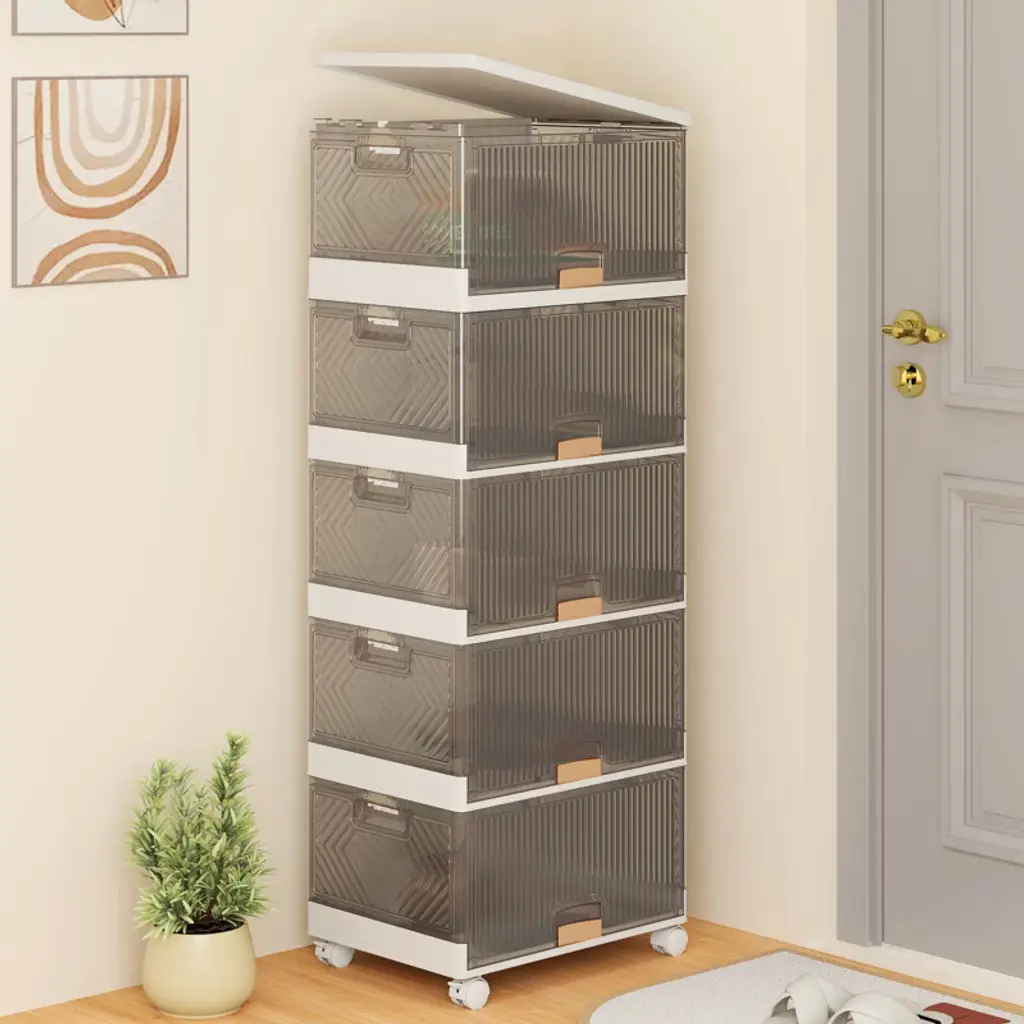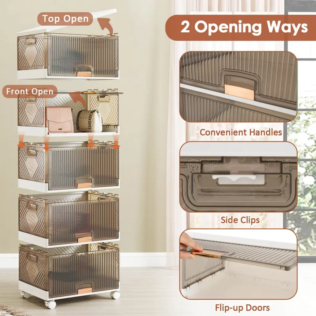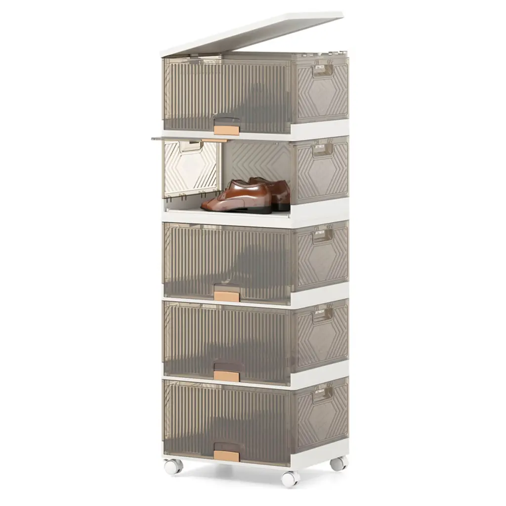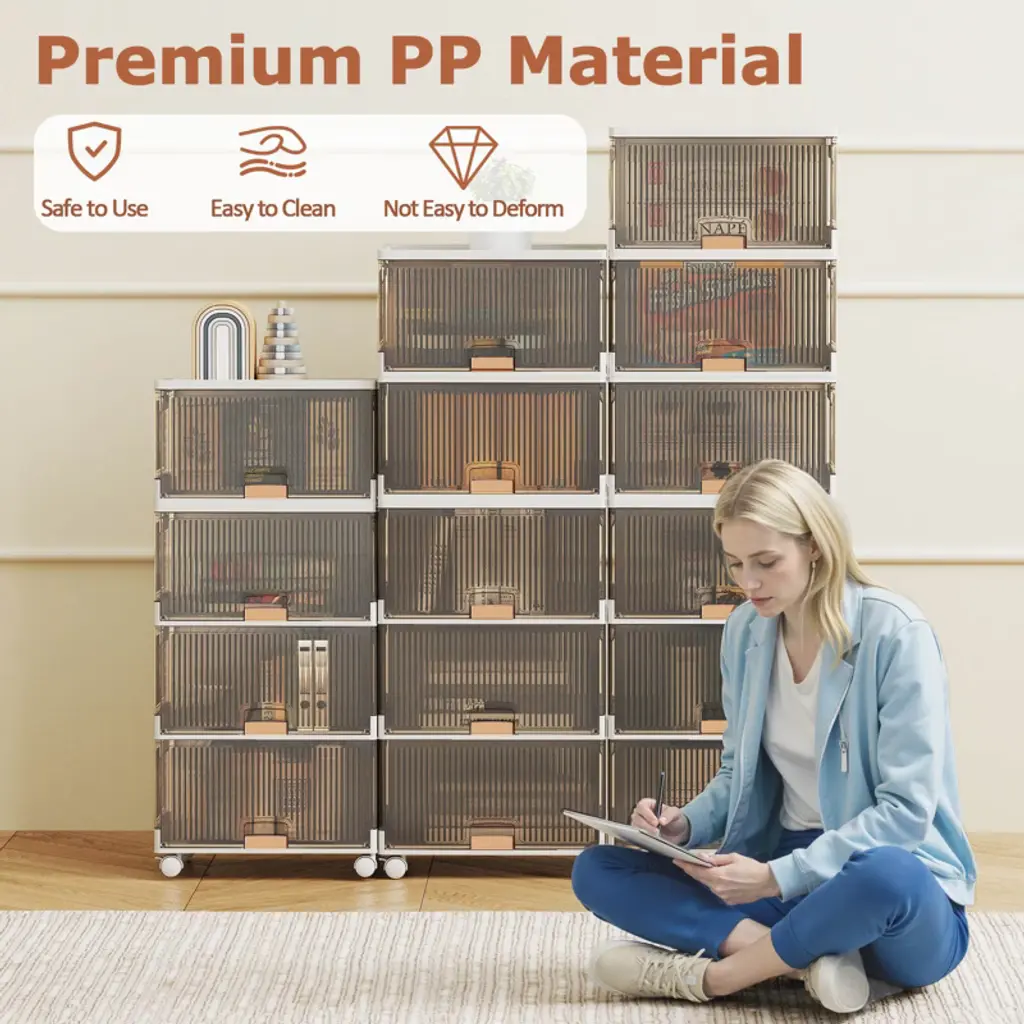 The stackable storage bin is a practical and versatile solution for keeping your belongings organized. With 13.5Gal large load capacity, it offers plenty of space to store shoes, clothes, books, or food. Its flexible modular design allows you to customize the layout by splitting and combining cabinets as needed. The collapsible bins are easy to fold for convenient storage and quick setup. Equipped with detachable universal wheels, the storage bin can be moved around effortlessly, and 2 lockable wheels provide stability when stationary. Crafted from premium PP material, the cabinet is deformation-resistant and safe to use. Convenient handles make it easy to reach items inside, while side clips ensure secure stacking for stability and organization in any space. The stackable storage bin is an ideal storage solution for various needs in your home.Features5 large compartments for ample storage Flexible modular design for customization 2 opening ways to get interior items: top open or front open Four universal wheels with mute design for convenient mobility Locking mechanism on 2 wheels for secure positioning High-quality PP for safety use and long-time lasting Smooth and water-proof surface for easy cleaning Safe to use with the side clips for added stability Convenient handles for easy access of interior itemsColor: White + Brown Material: PP, ABS Overall Dimensions: 15" x 11" x 40" (L x W x H) Interior Size of Each Cube: 14" x 10" x 7.5" (L x W x H) Folded Height: 1.5" Weight Capacity in Total: 66 lbs Weight Capacity of Top: 11 lbs Weight Capacity of Each Cube: 11 lbs Net Weight: 8.5 lbs Package Includes: 1 x 5-cube Storage Cabinet 1 x Instruction