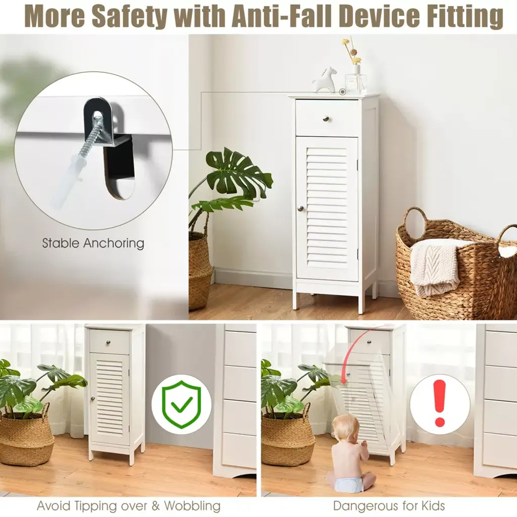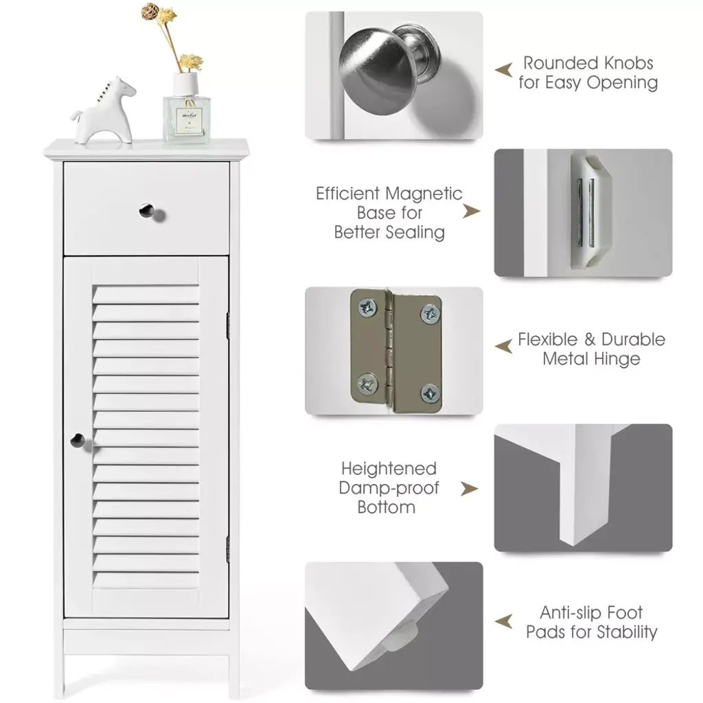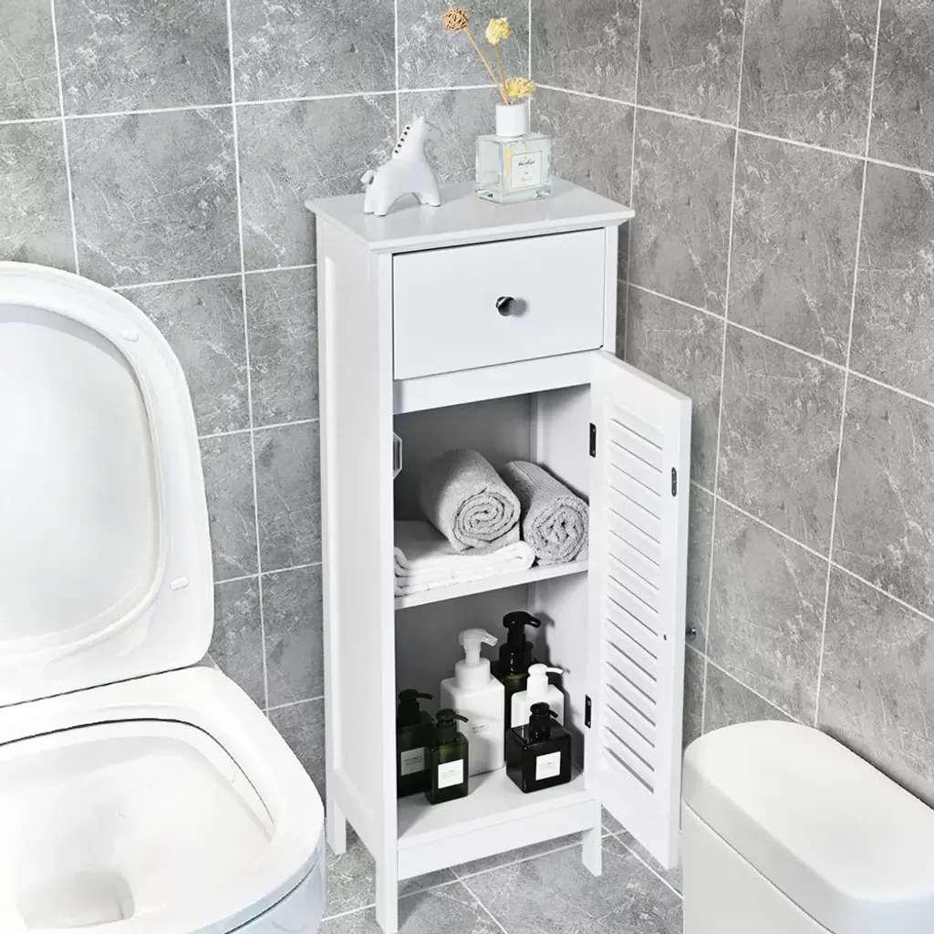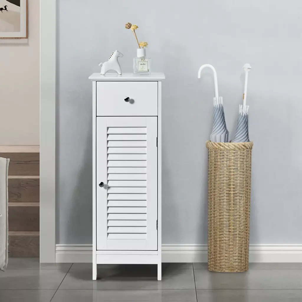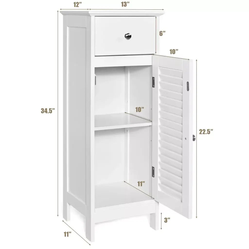 The slim bathroom cabinet with shutter door provides ample storage space while ensuring good air circulation. As a good room organizing helper, our floor cabinet can neatly store bathroom necessities. The bathroom storage cabinet is made of high-quality MDF material to ensure good strength and durability. The top shelf can be used to place frequently-used items for easy access, or display beautiful ornaments for home decoration. Additionally, the shelf can be adjusted to three positions for flexible storage options. It is a perfect organization for bathroom, living room, kitchen, apartment and other places.FeaturesModern and simple white furniture as a pure and peaceful decoration Premium MDF material for safe structure and long service life Waterproof painted surface is easy to clean with only wet cloth Raised bottom designed to avoid water accumulationColor: White Material: MDF Overall Dimension: 13'' x 12'' x 34.5'' (L x W x H) Drawer Dimension: 10'' x 6'' (L x H) Door Dimension: 10'' x 22.5'' (L x H) Net Weight: 20 lbs Top Board Maximum Weight: 20 lbs Shelf Maximum Weight: 7 lbs Drawer Maximum Weight: 5 lbs Package includes: 1 x Bathroom Floor Cabinet 1 x Instruction