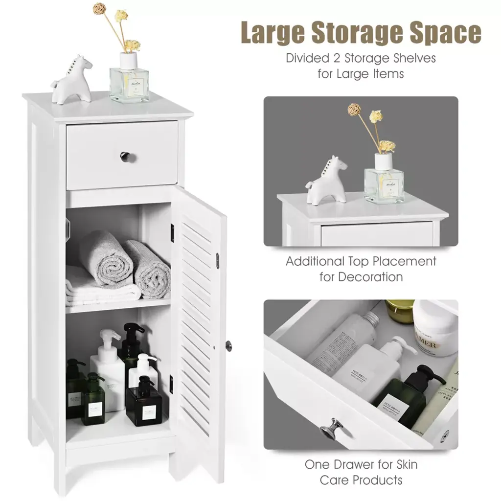 Costway Bathroom Floor Storage Cabinet Side Wooden Organizer W/ Drawer & Shutter Door
