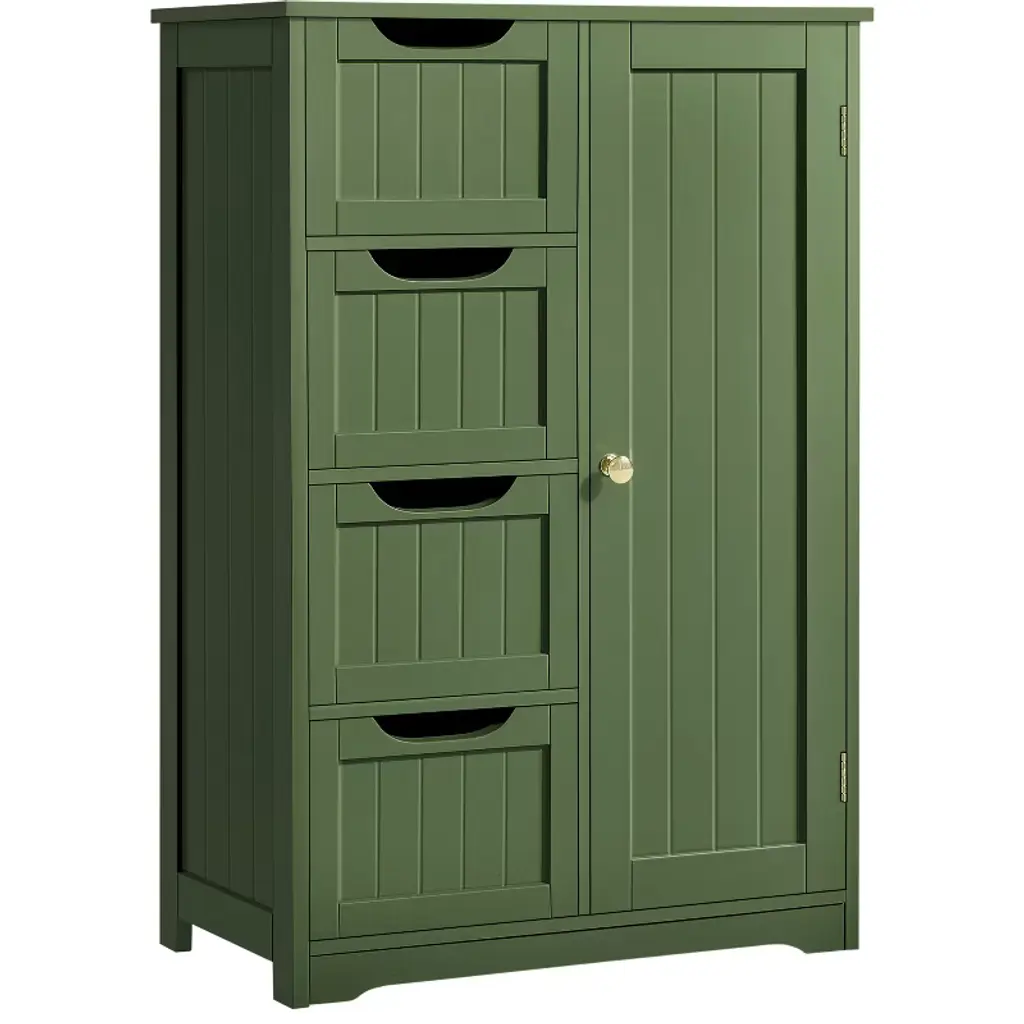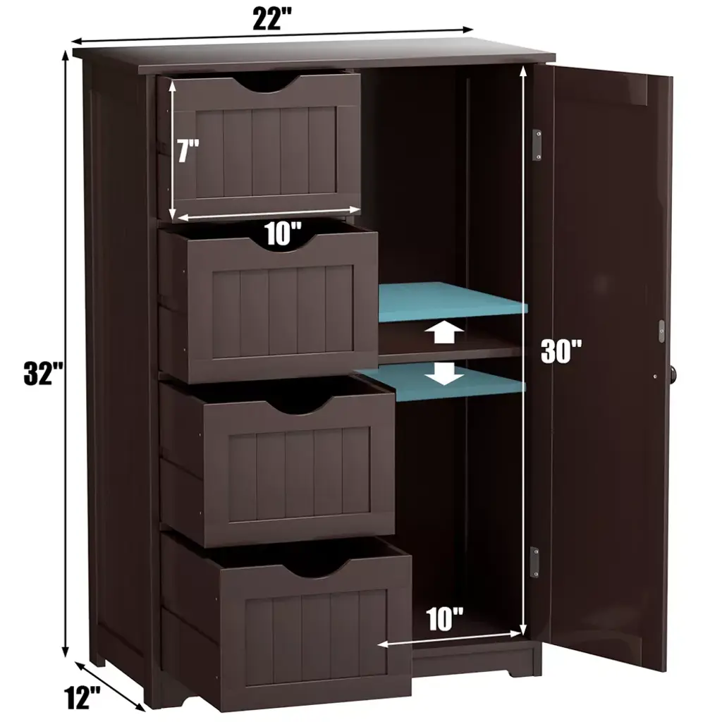Create a cleaner, tidier and more attractive bathroom space with this four drawer cabinet. Perfect for keeping your bathroom clutter free, it features four deep drawers and a cupboard to conceal towels, toiletries and other essentials. The cabinet is made from hardwearing MDF with a clean white finish to complement classic and modern interiors. Each drawer has a stylish slatted front and routed handle with wooden drawer slides to smoothly open and close. Finished with a contemporary silver-colored handle, the cabinet door houses an adjustable shelf to customize your storage space. You can also decorate the top of the unit with candles and other objects to add color and character to your bathroom.Features【Widely Use】: Giantex bathroom floor cabinet is perfect for keeping your bathroom clutter free, it features four deep drawers and a cupboard to conceal towels, toiletries and other essentials. You can also decorate the top of the unit with candles and other objects to add color and character to your bathroom. 【Selected Material】: The cabinet is made from hardwearing MDF with a clean white finish to complement classic and modern interiors. Water-resistant design is suitable for bathroom use. 【Enough Storage Space】: Finished with a contemporary silver-colored handle, 4 slatted drawers design with routed handles. The cabinet door houses an adjustable shelf to customize your storage space. 【Easy To Use】: Each drawer has a stylish slatted front and routed handle with wooden drawer slides to smoothly open and close. 22"L x 12"W x 32"H this bathroom cabinet provides extra space to hold your daily essentials and keep your bathroom neat and organized. Height adjustabColor: Black/Brown/Gray/White Material: MDF Overall Dimension: 22" x 12" x 32" (L x W x H) Size of Drawer: 10" x 7" (W x H) Net Weight: 31.5 lbs Weight Capacity of Top: 66 lbs Weight Capacity of Each Drawer: 11 lbs Weight Capacity of Adjustable Shelf: 17.5 lbs Weight Capacity of Bottom Shelf: 22 lbs Package Includes: 1 x Bathroom Floor Cabinet 1 x Instruction