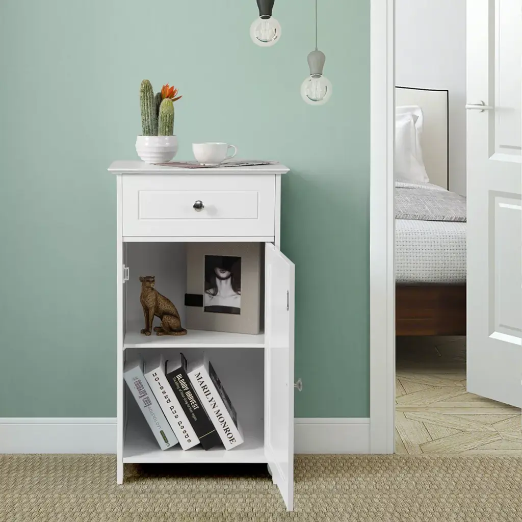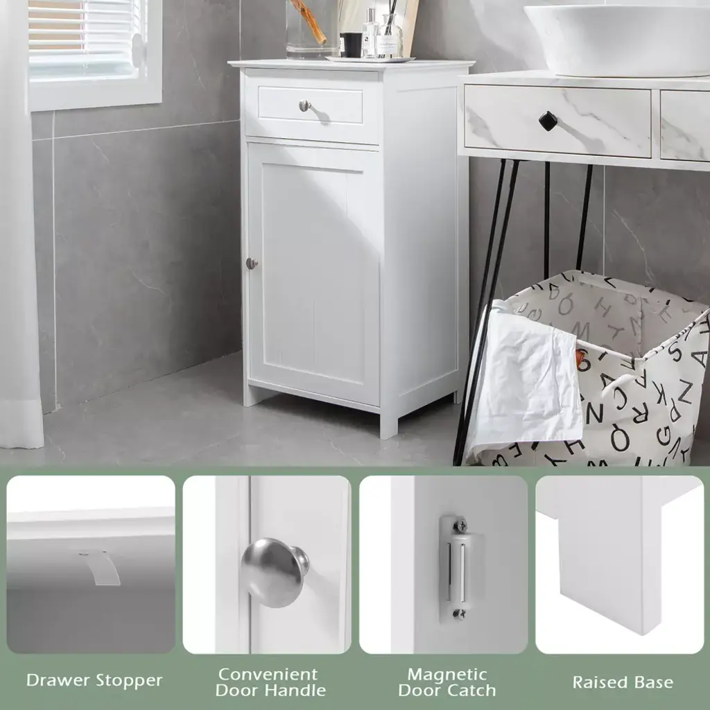 Whether you are struggling with the chaos in the bathroom or worried about the mess in your bed room, this storage cabinet can meet the various storage requirements and providae you with a tidier room. Consists of an one door cabinet and a large drawer, this floor cabinet provides a large storage place for your bathroom. Additionally the adjustable levels for the bottom closet can be adjusted to fit paper, toiletries, cosmetics or other items of different size. What’s more, it offers user-friendly details, such as anti-tipping device and stable foot design which ensure your safety. Moreover the modern simple designed appearance will fit well with your interior decor. FeaturesCustomize the shelf height to accommodate different items Versatile design provides convenient storage solutions for various spaces Features an anti-tipping device and stable foot design to ensure stability Securely keep the doors closed with a magnetic door catch Sturdy metal handle for easy opening and closing of the cabinet doors. Enjoy a smooth and effortless sliding experience with the smooth drawer mechanism The cabinet can be easily assembled according to the instructions.Color: White/Gray/Black Material: MDF, Engineered Wood Item weight: 22 lbs Overall Dimension: 17" x 13.5" x 30.5" (L x W x H) Inner Size of Cabinet: 17" x 12" x 20.5" (L x W x H) Inner Size of Drawer: 13" x 11.5" x 4" (L x W x H) Weight Capacity of Each Shelf: 22lbs Weight Capacity of Drawer: 11 lbs Weight Capacity of Top: 66 lbs Total Weight Capacity: 120 lbs Package includes: 1 X Bathroom Cabinet 1 X User Guide