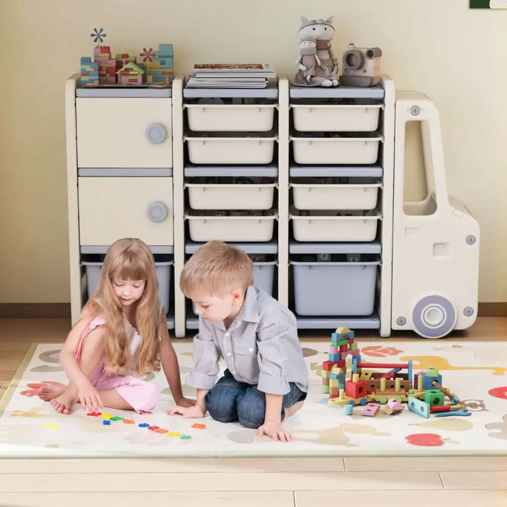 Transform playtime cleanup into a fun adventure with this toy storage organizer. Designed to inspire little imaginations, this playful toy chest combines practicality with a vibrant truck shape, making it an appealing addition to any playroom, bedroom, or nursery. This toy storage cabinet features 2 doors and 11 removable bins, providing plenty of compartments to sort and store toys, books, art supplies, and more. The top shelf is great for showing favorite items, and the hollow front end with a detachable lid adds an interactive element to the storage experience. Measuring 37” in height, this toy storage organizer is crafted for easy access by children, encouraging them to keep their space tidy independently. Moreover, made from BPA-free HDPE material and built with rounded corners, it ensures worry-free play. Features37” child-friendly height allows kids to easily access their belongings 2 cabinets and 11 removable bins provide multiple storage options Hollow front end with a detachable lid offers added storage space Spacious top shelf is perfect for displaying decorative items Rounded corners reduce the risk of bumps during everyday use BPA-free HDPE material ensures longevity and safety Eye-catching truck-shaped design inspires creativity Flexible installation options suit different needs Built-in slots to protect bins from sliding down Ideal for the playroom, bedroom, or nursery Easy assembly and cleaning Color: Off-white + Grey Material: HDPE Overall Dimensions: 58” x 13.5” x 37”(L x W x H) Interior Dimensions of Large Bin: 12” x 9.5” x 8.5” (L x W x H) Interior Dimensions of Small Bin: 12” x 9.5” x 4”(L x W x H) Interior Dimensions of Cabinet: 13” x 11” x 10” (L x W x H) Weight Limit of Each Tier: 55 lbs Weight Limit of Front Engine: 55 lbs Net Weight: 42.5 lbs Suitable Age: 3+ Years Old Package Includes: 1 x Kids Toy Storage Organizer 1 x Instruction