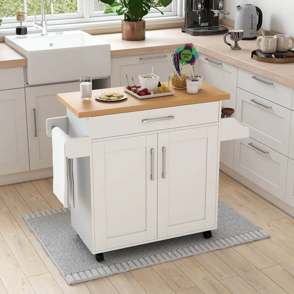 Wish your kitchen had more room to cook and store? Our mobile island cart solves both needs effortlessly. The spacious top gives you extra prep space, while the deep drawer and 2 enclosed cabinets neatly tuck away kitchen essentials. Plus, the side racks keep spices and towels within reach. Glide it around thanks to 4 smooth-rolling wheels (2 lockable), and adjust the lower shelf to 3 heights to fit everything inside. Not only for mealtime, it easily rolls into service as a craft station, office organizer, or living room storage unit, always ready to serve wherever it's needed most!FeaturesWide kitchen cart for extra prep and cooking space Deep drawer organize your dining essentials with ease 2 enclosed shelves conceal bulkier kitchen items 3-height adjustable shelf customizes storage capacity Side rack offer quick access to frequently used spices Towel rack serves also as a convenient handrail 4 universal wheels for 360° free rotation 2 lockable for added stability at your chosen spot Thick top panel ensures long-lasting support Magnetic door catches prevent accidental openings Smooth drawer slides allow effortless access Multi-functional design adapts to various rooms Assembly neededColor:White\Black\Cherry\Gray Material: Engineered Wood, Metal Product Dimensions: 44" × 16" × 35.5" (L × W × H) Countertop Dimension: 35.5" × 16" (L × W) Inner Dimensions of the Cabinet: 30" × 13.5" × 25" (W × D × H) Inner Dimensions of the Drawer: 28" × 12.5" × 2.5" (W × D × H) Adjustable Height of the Shelf: 1.2" Total Loading Capacity: 220 lbs Tabletop Loading Capacity: 88 lbs Net Weight: 63 lbs Package Includes: 1 x Kitchen Cart 1 x User Guide
