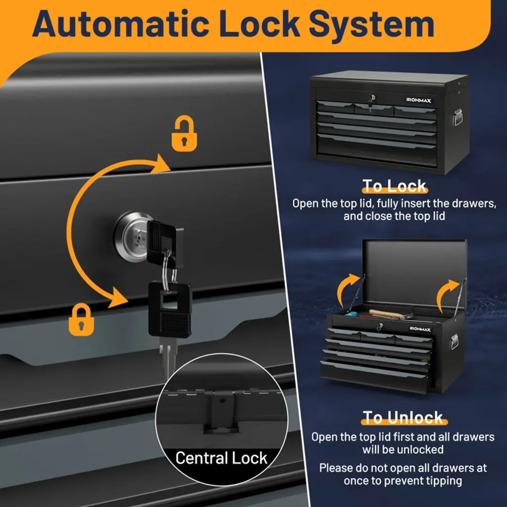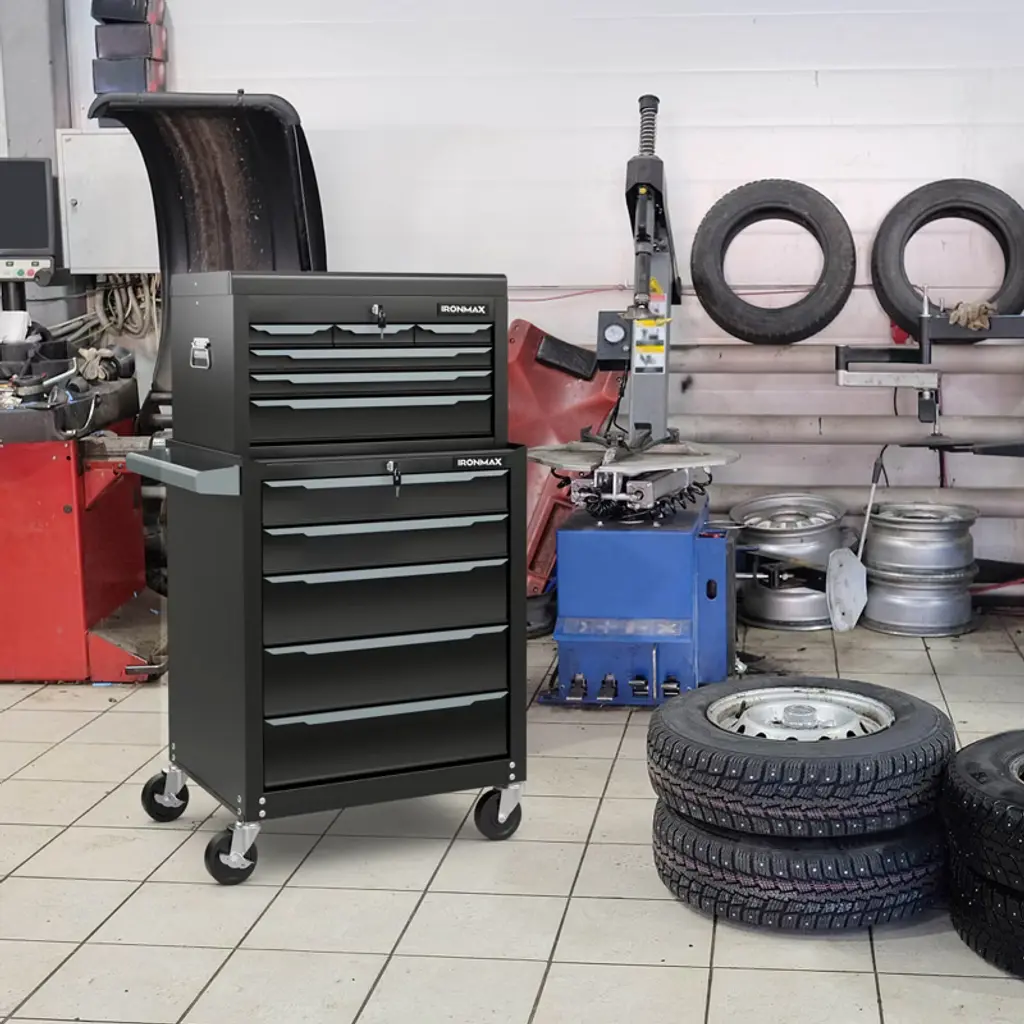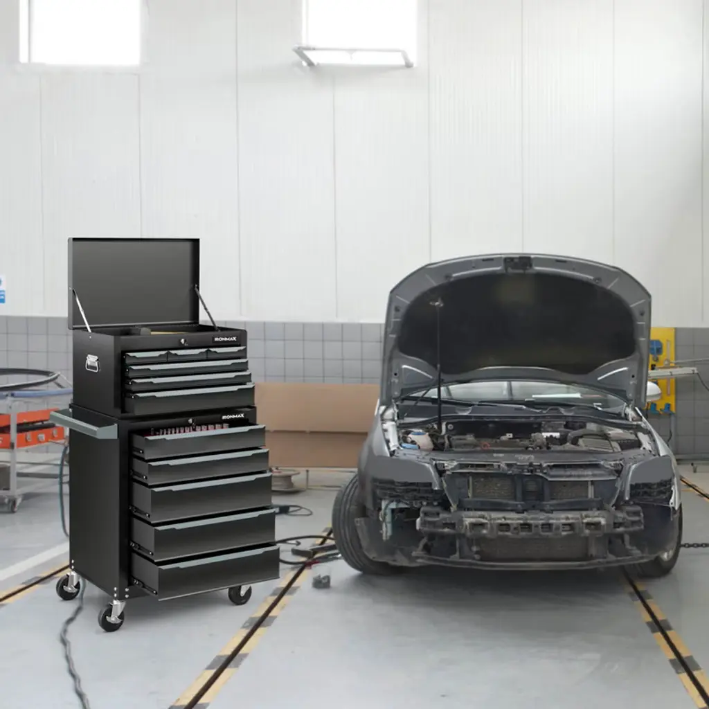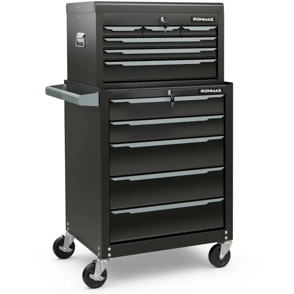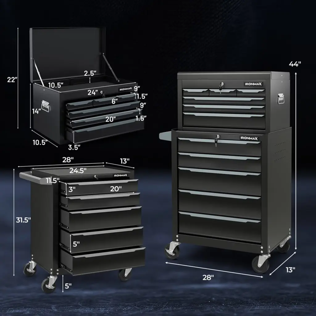 The steel tool chest is a versatile storage choice that offers a practical 11-drawer design for easy tool organization. With ball-bearing slides and a sturdy steel structure, it can support up to 329 lbs. The tool box includes a platform for assembly tasks and pre-drilled holes for tool hook installation. To safeguard tools, it comes with EVA liners and features a central locking system for security. Transporting the toolbox is simple with its pushing handle and 360° universal wheels, including 2 lockable ones for stability in place. Ideal for repair shops, garages, warehouses, and various workspaces, this tool cabinet combines functionality and premium details for efficient tool storage.FeaturesHas a top platform that serves as a temporary workbench Designed with pre-drilled holes for hooks (hooks are not included) Features 11 pull-out drawers for hand tools, power tools, and measuring tools Seamless operation is safeguarded by the ball-bearing slides The robust steel construction is long-lasting and easy to maintain Centralized locking system allows you to easily lock all drawers with a single action Equipped with anti-scratch EVA pads to protect your tools Comes with 4 swivel wheels, including 2 lockable ones Designed with a side pushing handle, making it easy to move Convenient opening is ensured by practical drawer handles Multi-scene use for garage, workshop, warehouse, repair shop, and moreColor: Black Material: Steel, EVA Overall Dimensions: 28'' x 13'' x 31.5'' (L x W x H) Load Capacity : 329lbs Net Weight: 79 lbs Package Includes: 1 x Top Tool Box 1 x Rolling Tool Chest 4 x Keys 1 x User Guide