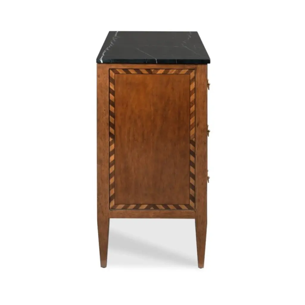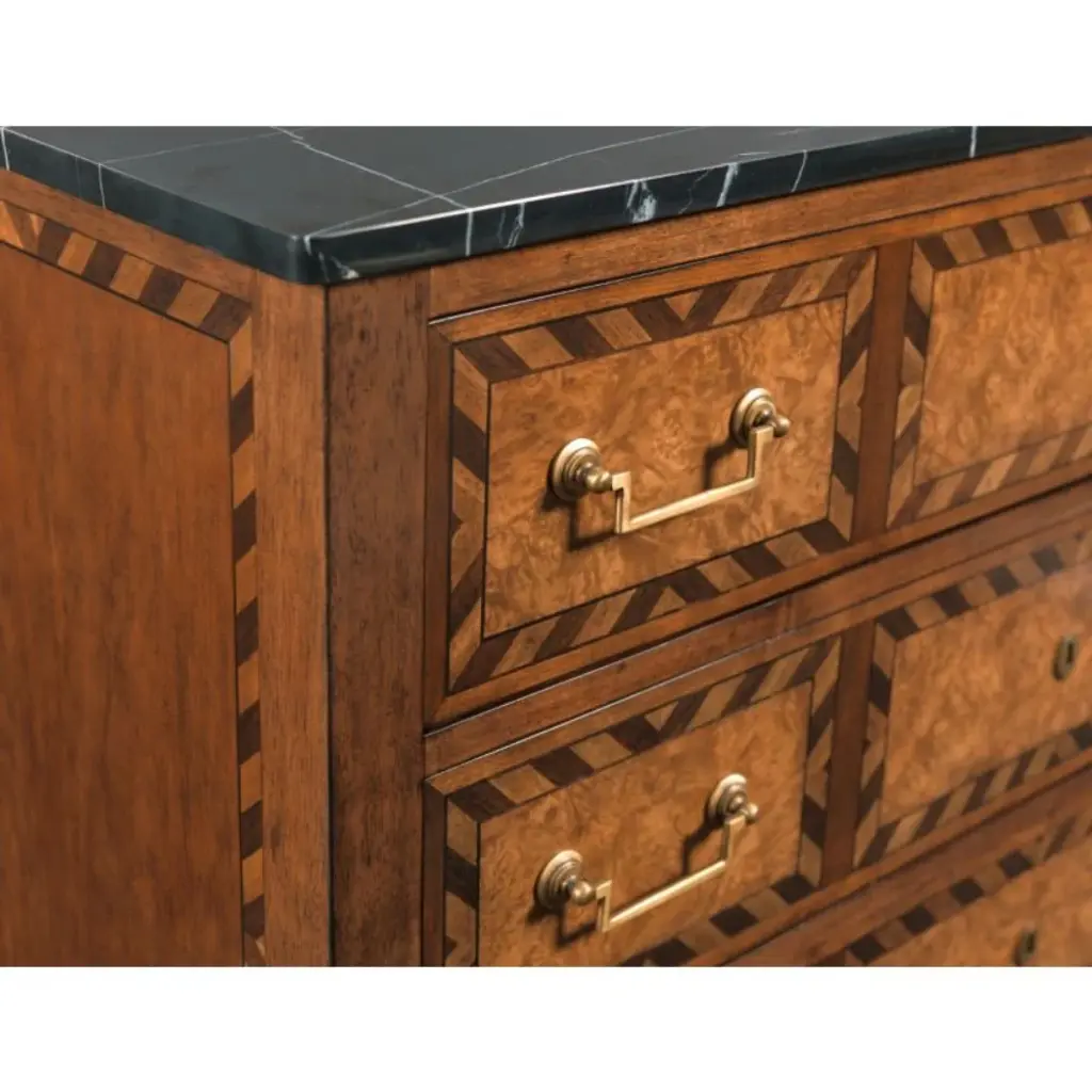 Add a touch of elegance with our Art Deco-inspired chest. The stunning waterfall top and Italian neoclassical design will elevate any room. Store your belongings in the ample cherry veneer drawers with ebony and holly inlays, topped with a honed black marble. Elevated on squared posts for a modern twist.