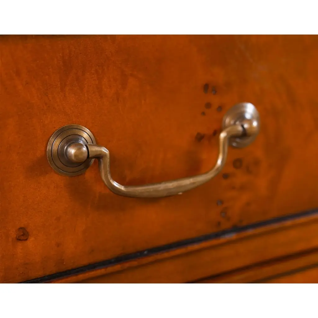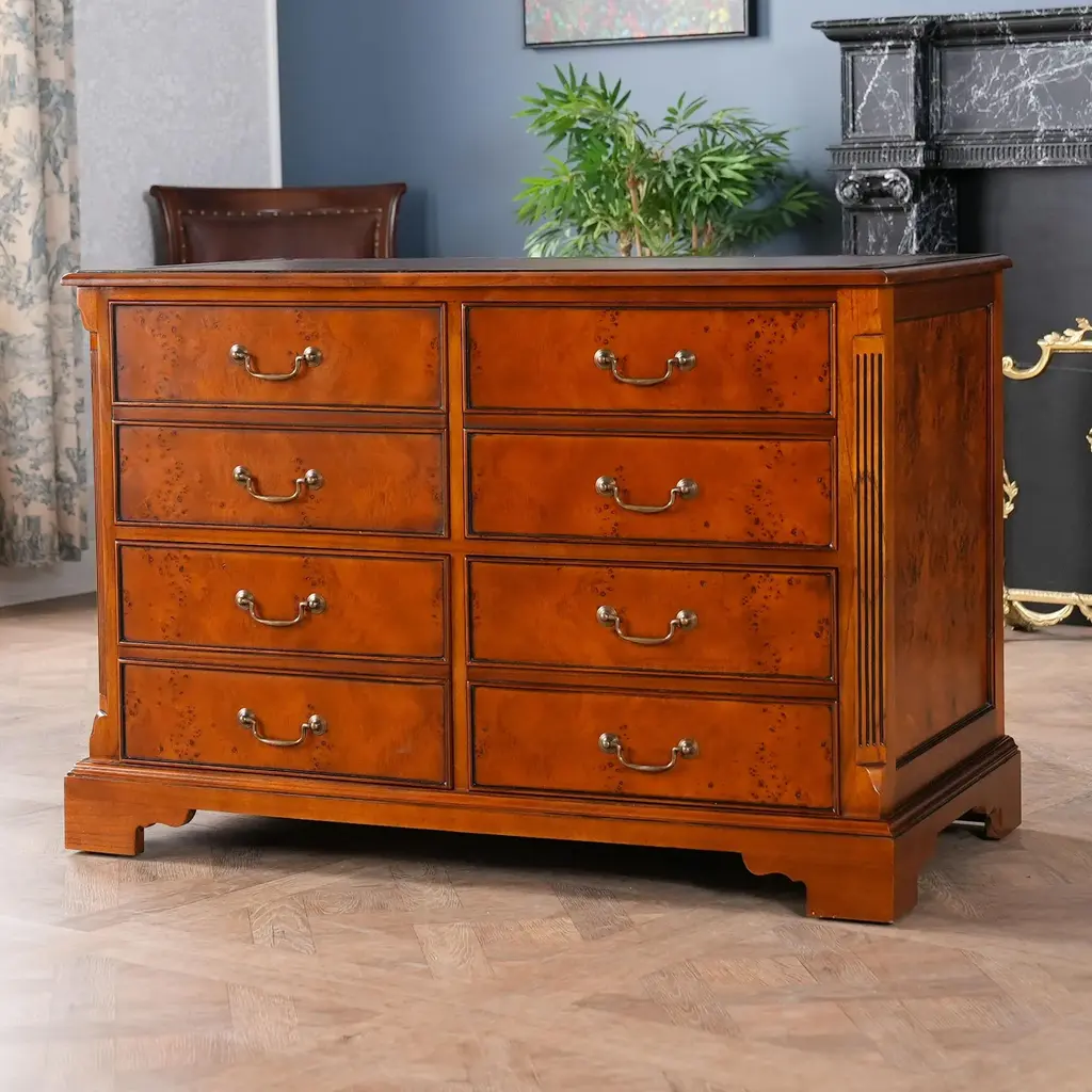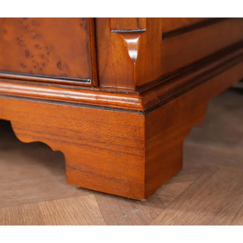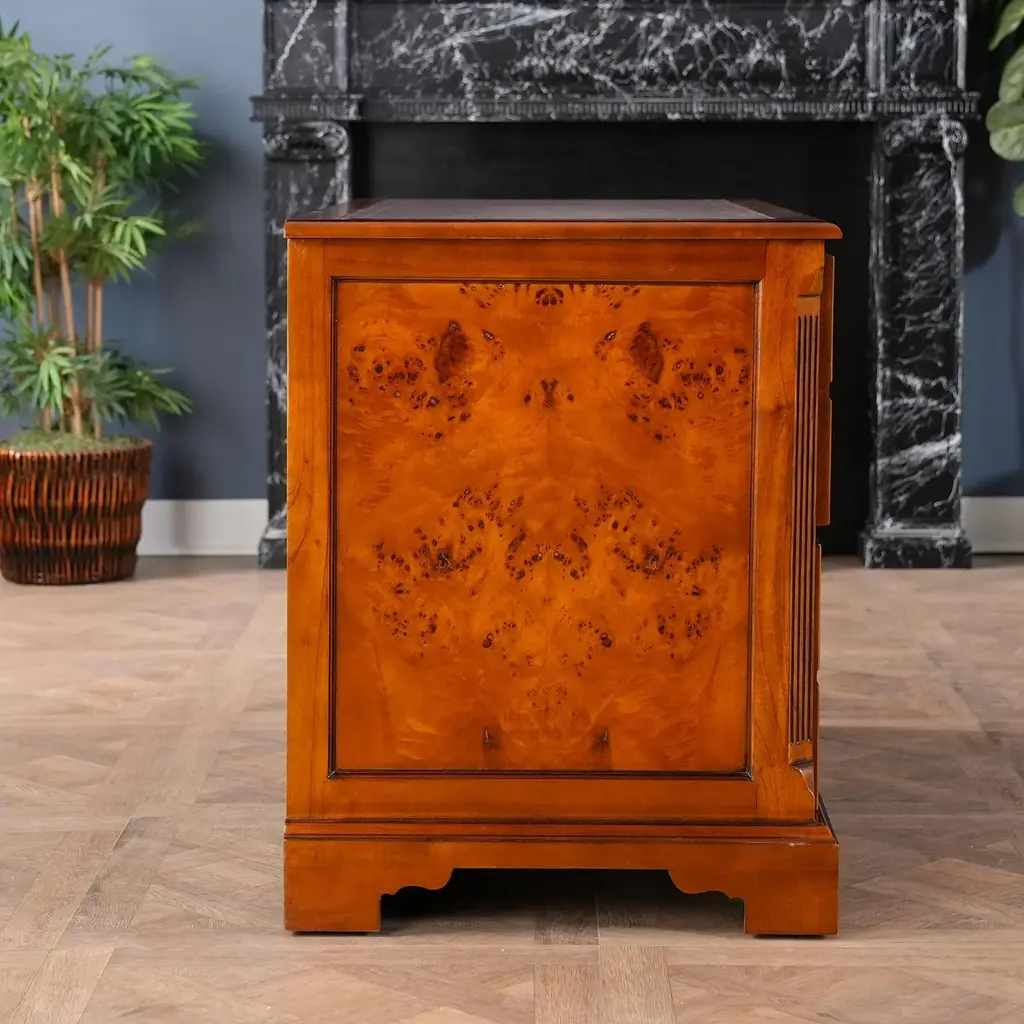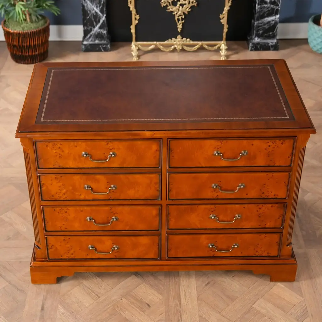 A highly functional and decorative piece this Country Estate Four Drawer File cabinet from Niagara Furniture is made with fine quality burled wood. The top of the cabinet is covered in a full grain brown leather panel which is attractively tooled around the edge with gold tooling. In the front are eight faux drawers, each having applied moldings and displaying lovely matched veneers. Each drawer has solid brass handles and the eight drawer fronts open as four large hanging file drawers all on steel runners. The side of the Country Estate Four Drawer File is also decorated using high quality figured, burled veneers as well as solid moldings. This cabinet matches many other items in our Country Estate office collection. Cabinet Measures approximately 45 inches wide x 24 inches deep x 32 inches high 175 lbs