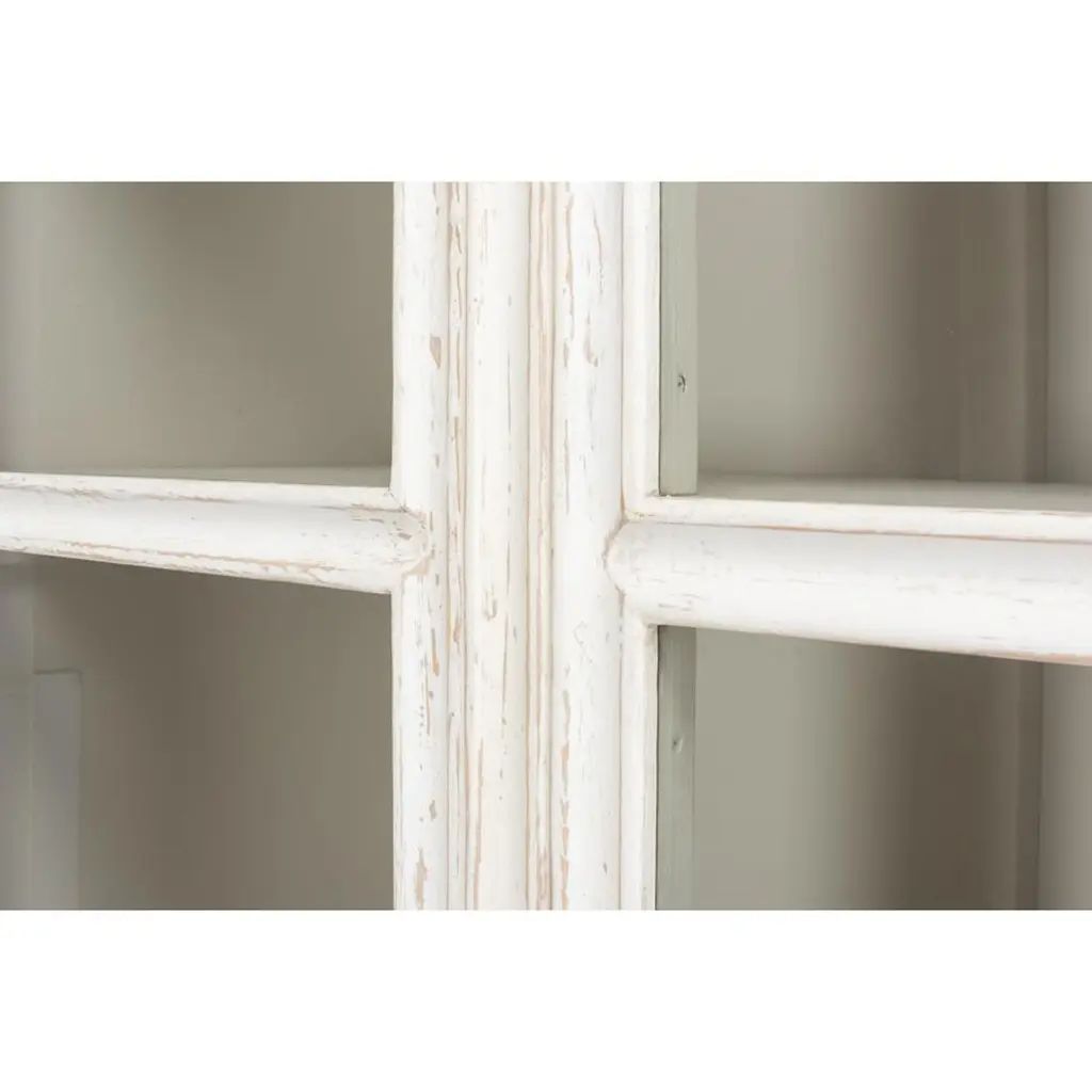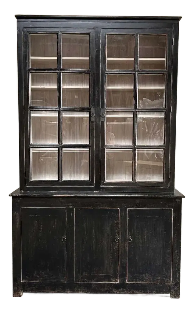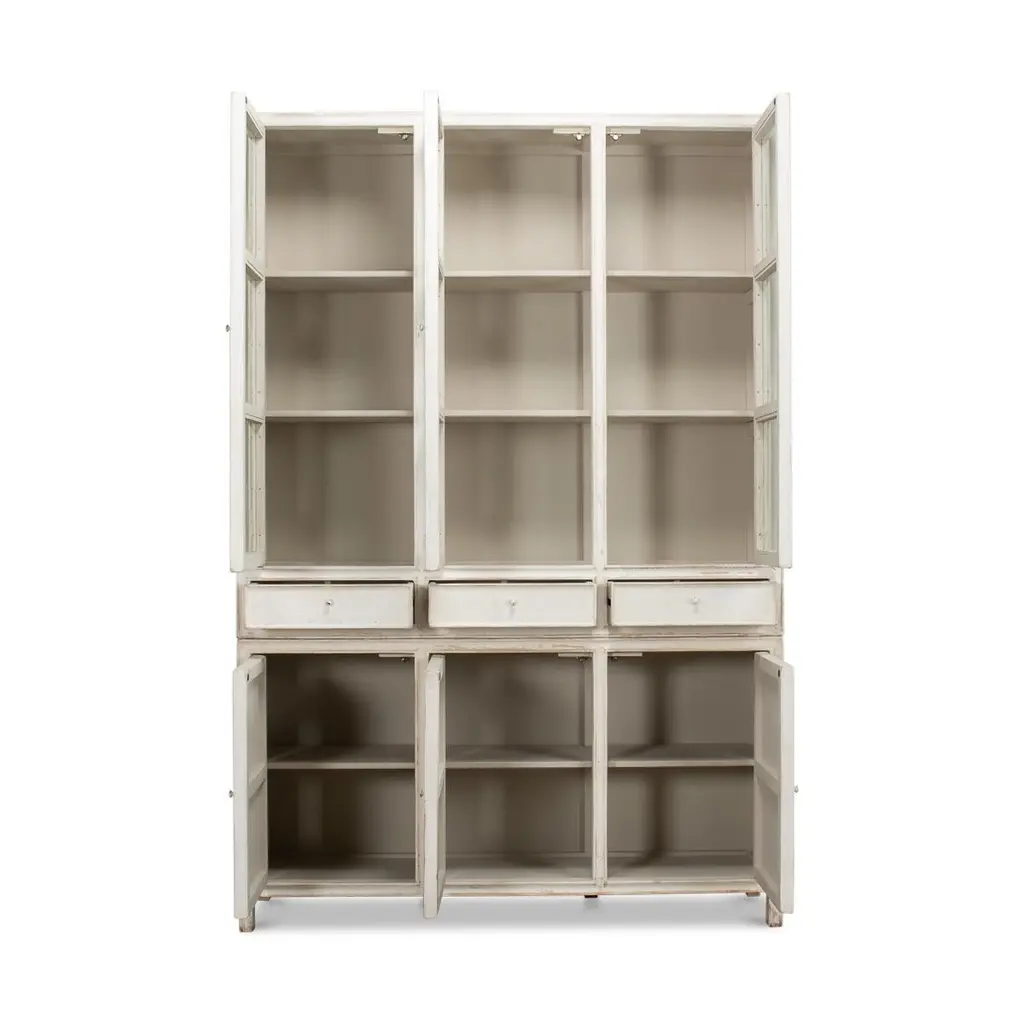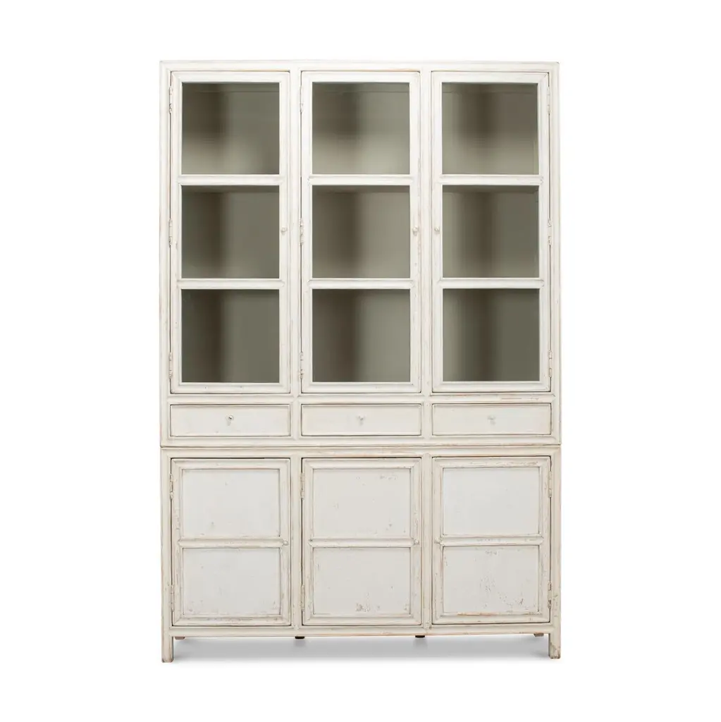 The Country painted display cabinet is made with reclaimed pine and has a hand-rubbed white painted antiqued distressed finish. The upper section with three glass doors above three drawers sitting atop three enclosed cabinets below.Dimensions: 60" W x 19" D x 90" H.