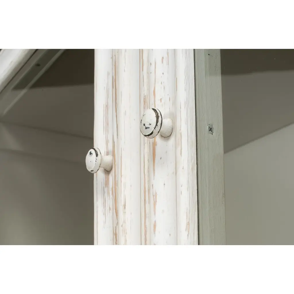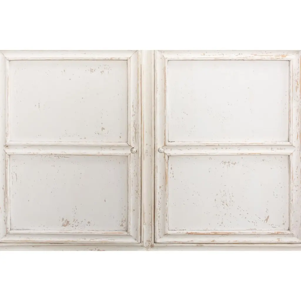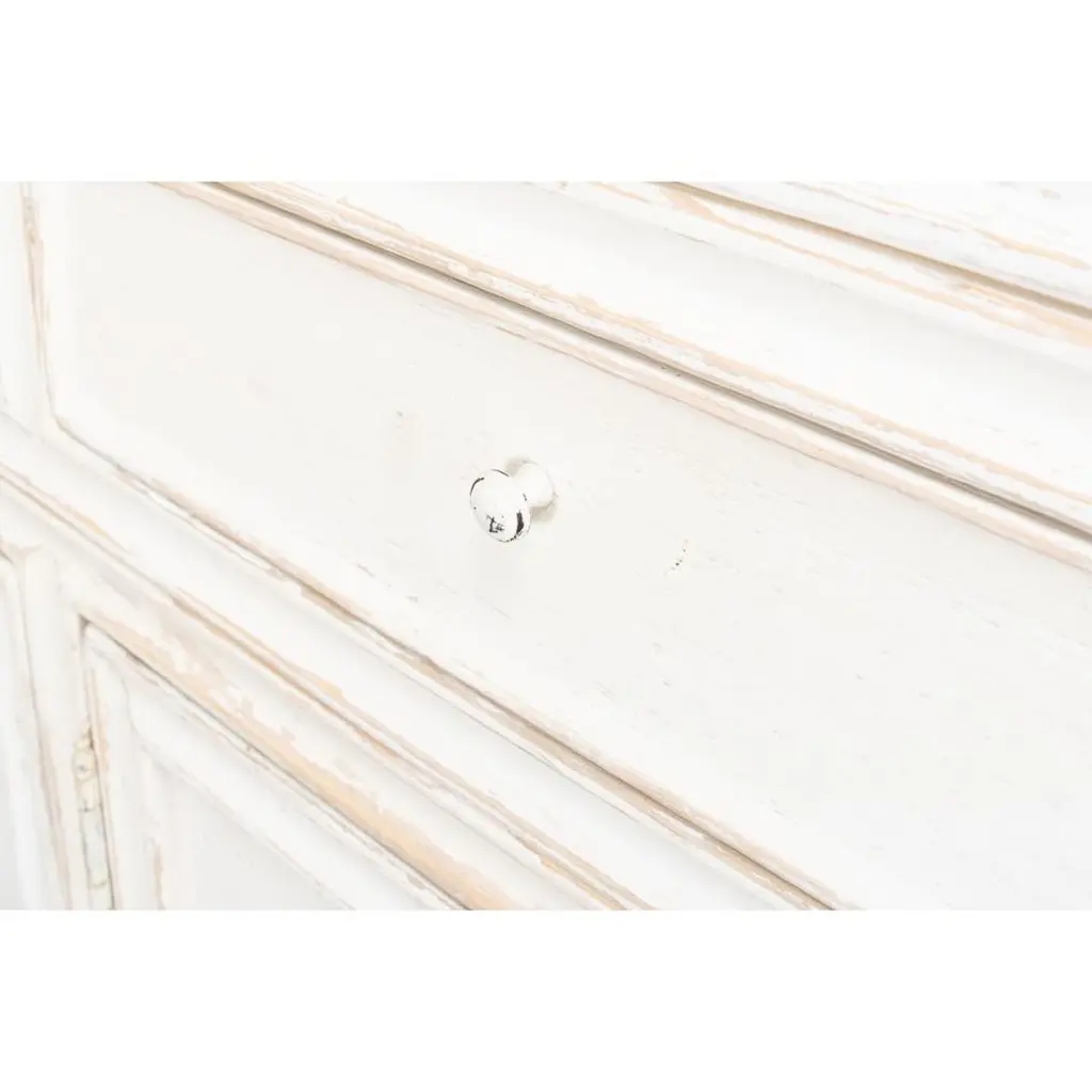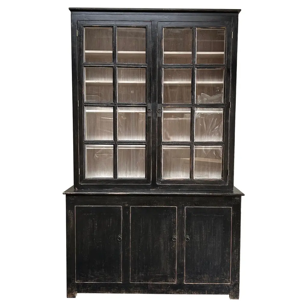 The Country painted display cabinet is made with reclaimed pine and has a hand-rubbed white painted antiqued distressed finish. The upper section with three glass doors above three drawers sitting atop three enclosed cabinets below.Dimensions: 60" W x 19" D x 90" H.