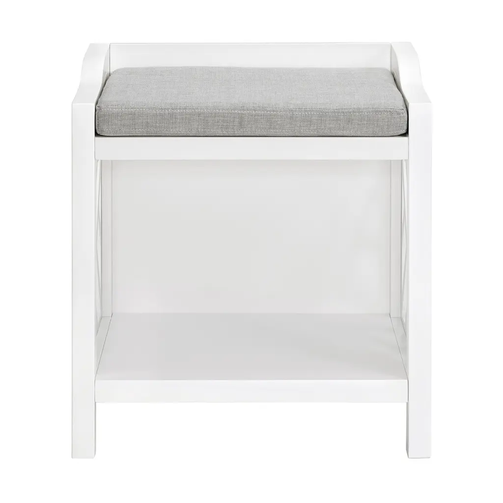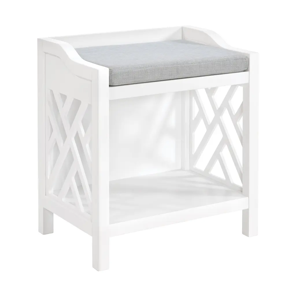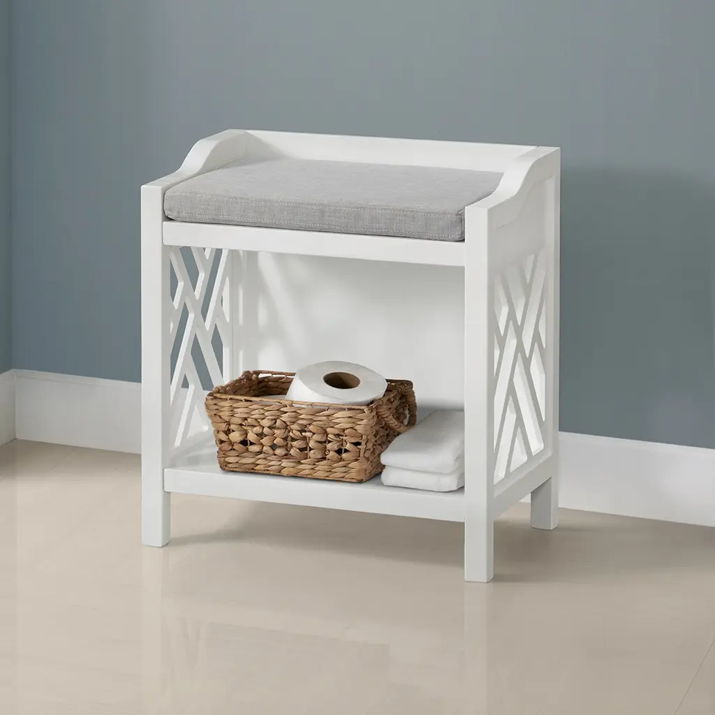 Add extra storage and seating to your entryway, kitchen, bedroom, or bathroom with the Storage Bench from the Coventry Collection by Alaterre Furniture. This entryway bench features a removable padded cushion with an open cabinet space underneath for convenient bathroom storage and has a weight capacity of 250-pounds. With seating and storage combined, the stool chair can be used in almost any room for shoe storage, living room storage, as an extra seat in an apartment or dorm room, or even as a vanity bench. This shoe bench is quick and easy to put together with all the necessary hardware as well as tools included, and it's made of durable pine wood for durable and long-lasting use. IMPORTANT: Alaterre Furniture is committed to providing the consumer with the absolute best price and value on our entire line of products. NOTE: This is an exclusive product of Alaterre Furniture and ONLY Furniture by Alaterre Furniture is GUARANTEED to be genuine. Avoid buying counterfeit products and transacting with unauthorized sellers. • This shoe bench features a comfortable seat cushion with a storage shelf underneath for shoes, toiletries, books, makeup, and more • The cushion on the storage bench for entryway is removable so you can use the shelf beneath for additional storage space and replace it when needed for extra seating • Made of durable MDF and solid pine wood, this bench with storage is designed for long-lasting use with a weight capacity of up to 250lbs • Use the small bench in the bathroom to hold towels or toiletries, in the living room for remotes or books, by a vanity as a makeup stool, or near an entryway to sit while putting on shoes • Materials: MDF and Pine Wood; Do Not Use in the Shower • Dimensions: (L) 21.625 x (W) 15 x (H) 23.375-inches; Weight Capacity: 250lbs • Color: White with Gray Cushion