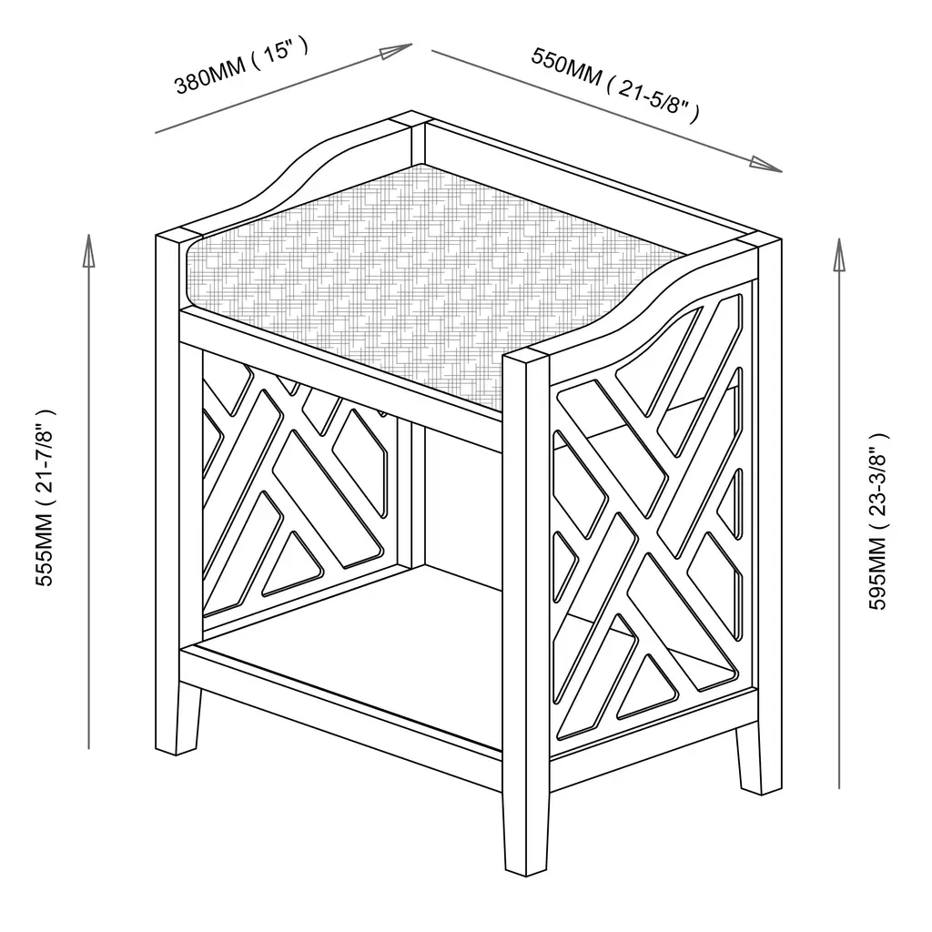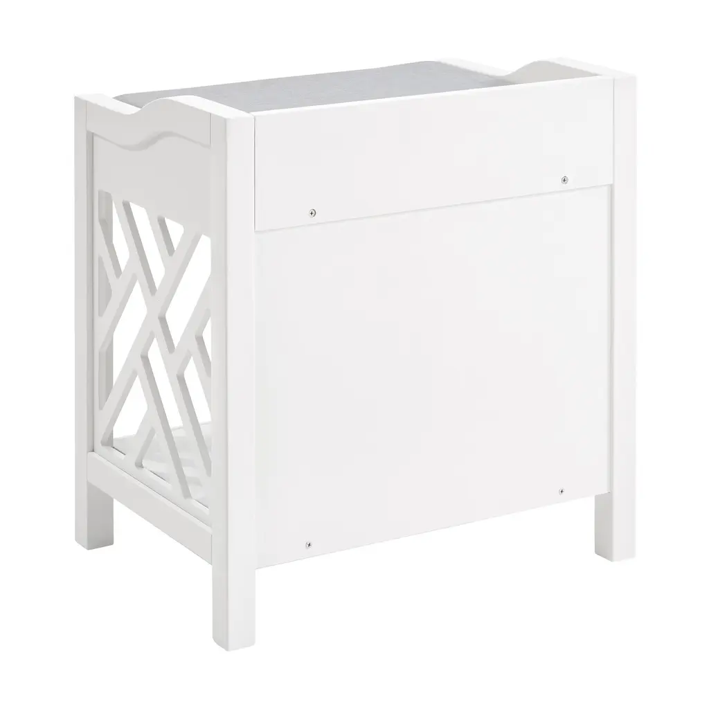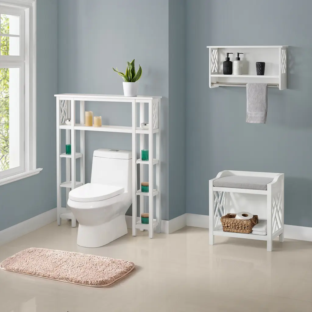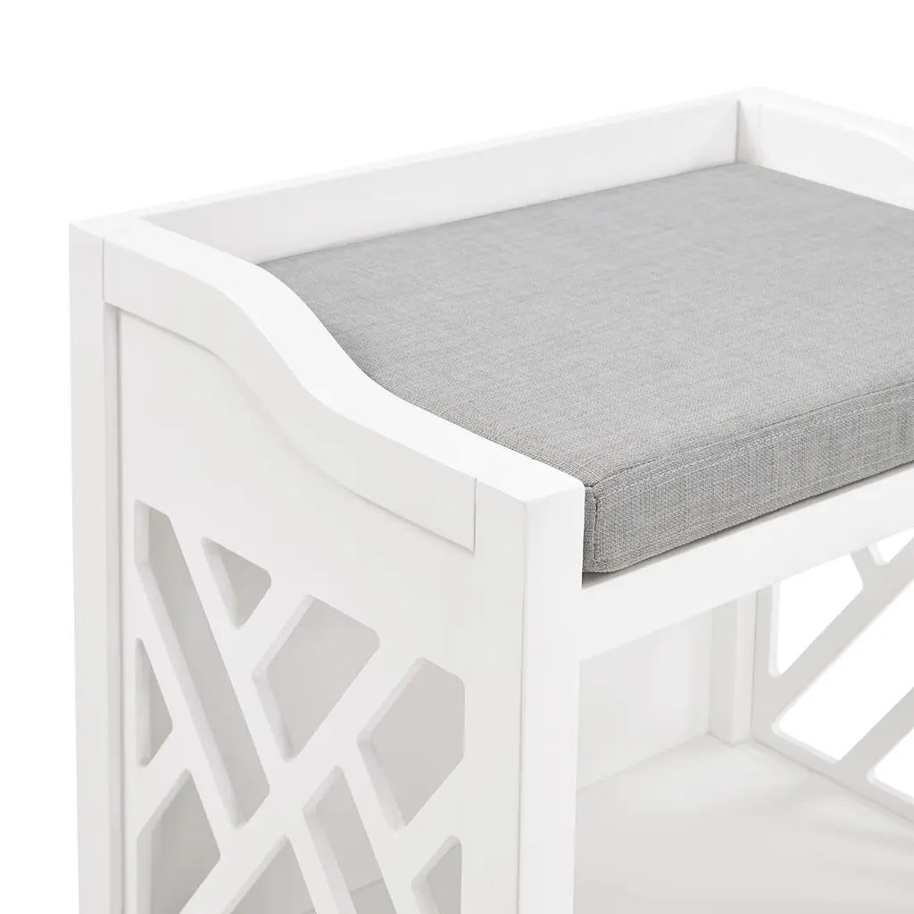 Add extra storage and seating to your entryway, kitchen, bedroom, or bathroom with the Storage Bench from the Coventry Collection by Alaterre Furniture. This entryway bench features a removable padded cushion with an open cabinet space underneath for convenient bathroom storage and has a weight capacity of 250-pounds. With seating and storage combined, the stool chair can be used in almost any room for shoe storage, living room storage, as an extra seat in an apartment or dorm room, or even as a vanity bench. This shoe bench is quick and easy to put together with all the necessary hardware as well as tools included, and it's made of durable pine wood for durable and long-lasting use. IMPORTANT: Alaterre Furniture is committed to providing the consumer with the absolute best price and value on our entire line of products. NOTE: This is an exclusive product of Alaterre Furniture and ONLY Furniture by Alaterre Furniture is GUARANTEED to be genuine. Avoid buying counterfeit products and transacting with unauthorized sellers. • This shoe bench features a comfortable seat cushion with a storage shelf underneath for shoes, toiletries, books, makeup, and more • The cushion on the storage bench for entryway is removable so you can use the shelf beneath for additional storage space and replace it when needed for extra seating • Made of durable MDF and solid pine wood, this bench with storage is designed for long-lasting use with a weight capacity of up to 250lbs • Use the small bench in the bathroom to hold towels or toiletries, in the living room for remotes or books, by a vanity as a makeup stool, or near an entryway to sit while putting on shoes • Materials: MDF and Pine Wood; Do Not Use in the Shower • Dimensions: (L) 21.625 x (W) 15 x (H) 23.375-inches; Weight Capacity: 250lbs • Color: White with Gray Cushion