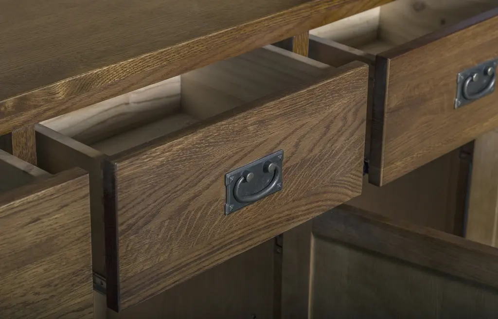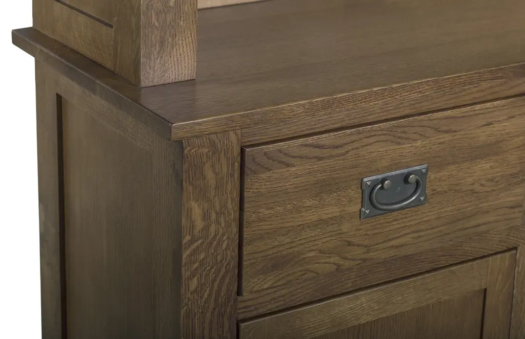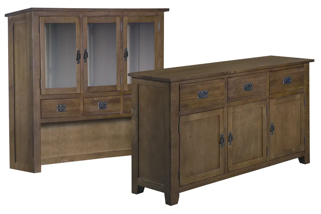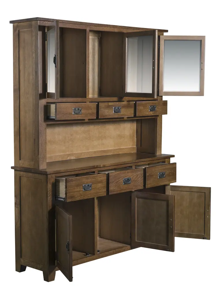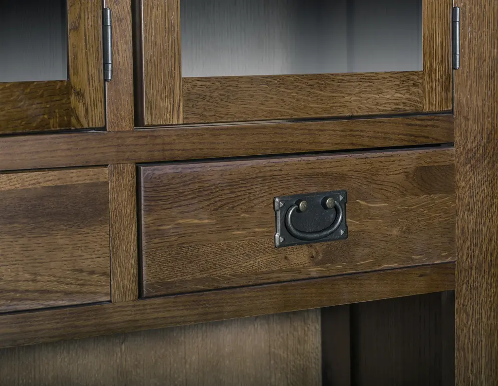 Our Mission / Arts & Crafts style furniture is made with attention to detail and expertise like that of 100 year old Stickley. - Solid Quarter Sawn White Oak with Walnut brown stain color - Drawers feature dovetail drawer fronts and metal glides - Mortise & Tenon joinery - Glass doors on top - Plenty of Storage with 6 drawers and 6 doors Dimensions: Overall: 58.75 x 17.5 x 78.25