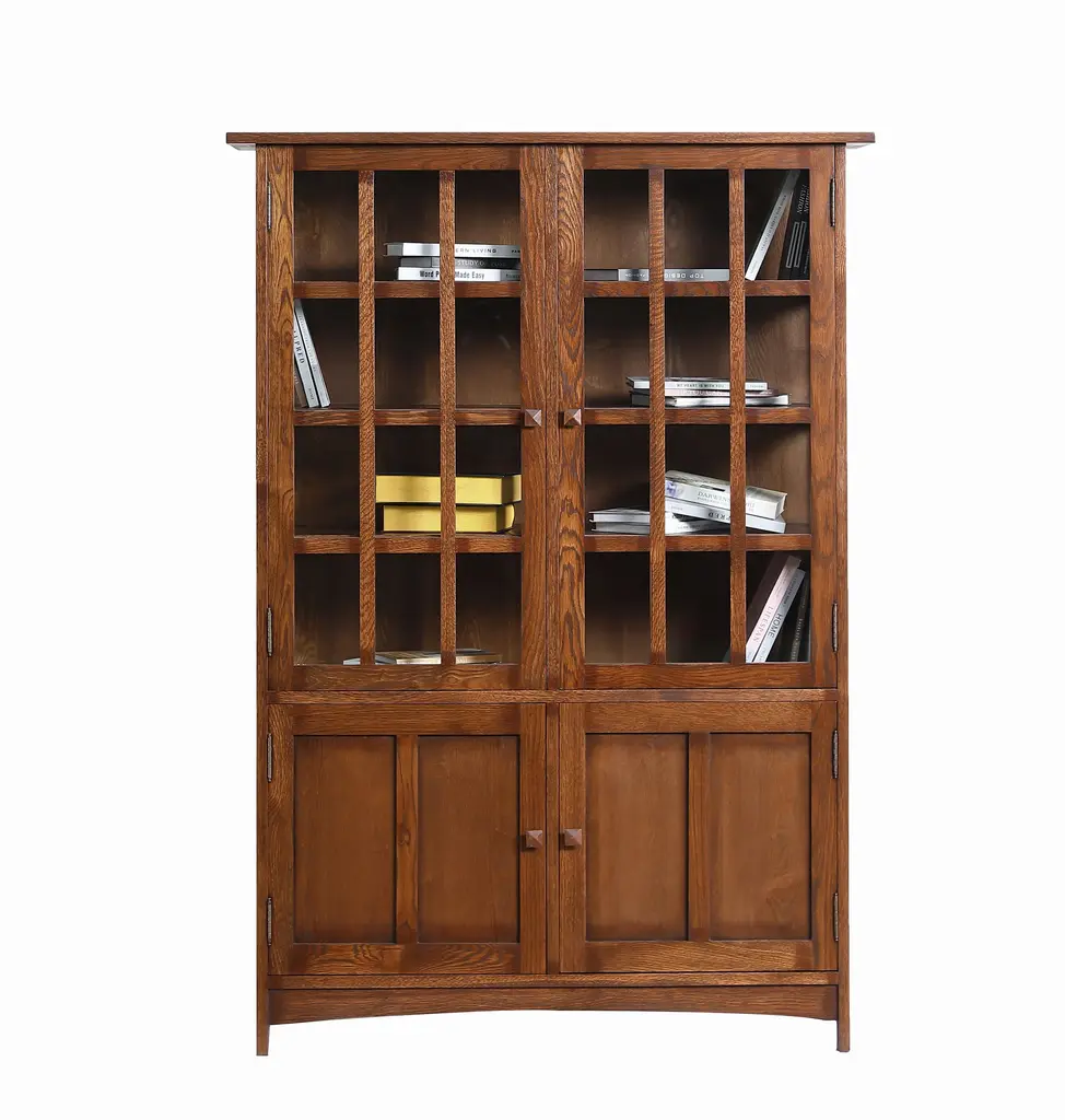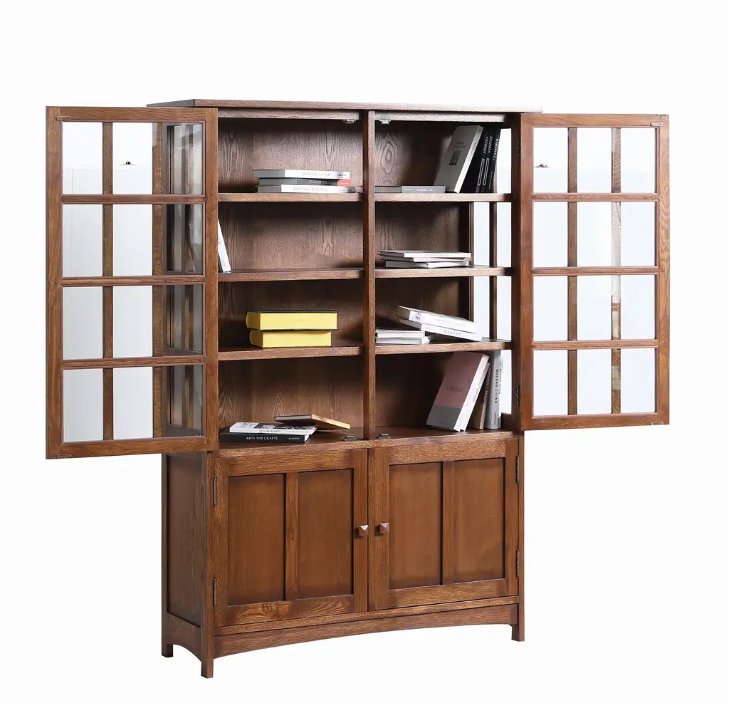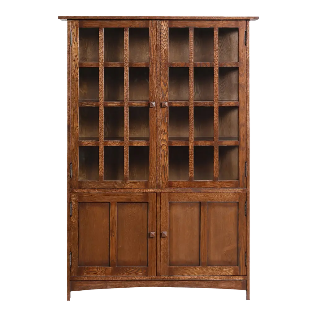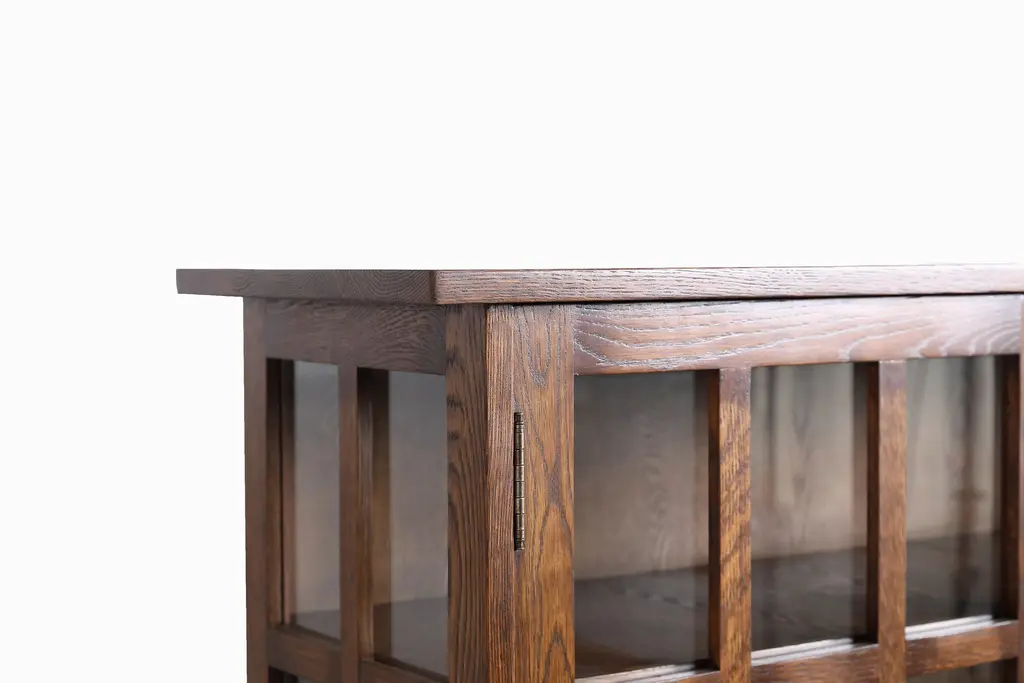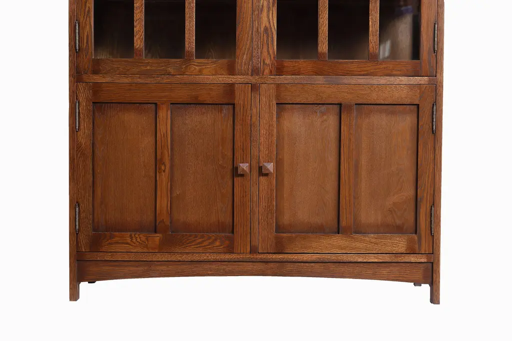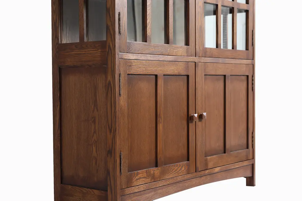 Our Mission / Arts & Crafts style furniture is made with attention to detail and expertise like that of 100 year old Stickley. - Solid oak with a medium to dark stain and hand rubbed lacquer finish - 3 fixed shelves behind glass doors - The stain is Medium to Dark Oak with hand rubbed lacquer finish Dimensions: Overall: 49W x 16D x 70H Shelves: Top: 43W x 12.5D x 10H 2nd & 3rd: 43W x 12.5D x 9H Bottom: 43W x 12.5D x 11H Cabinet: 43W x 12.5D x 21.5H