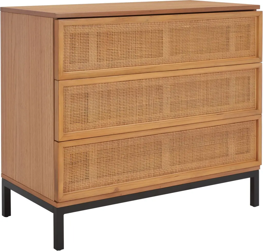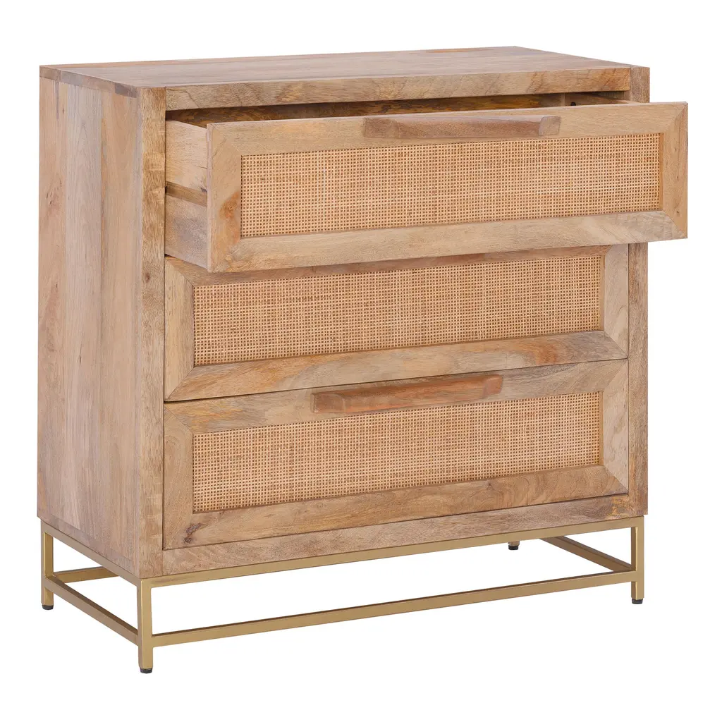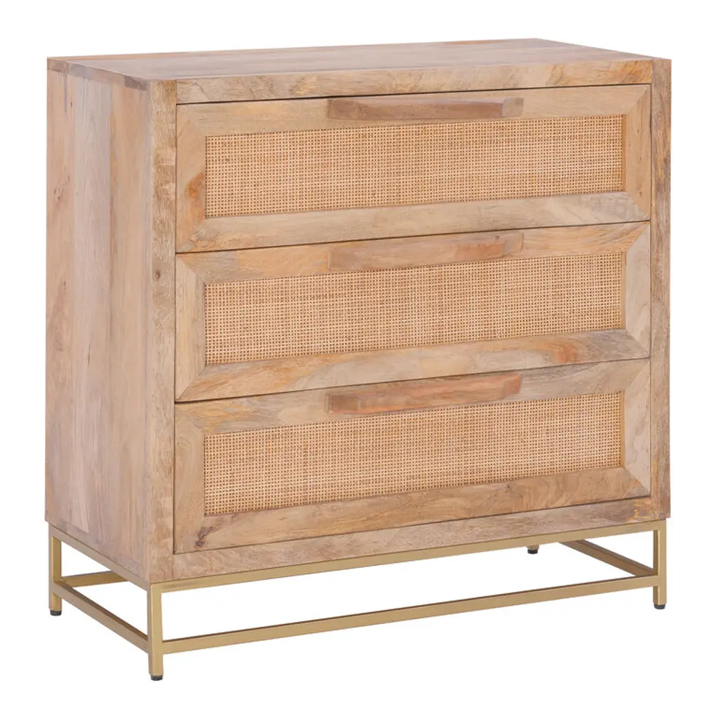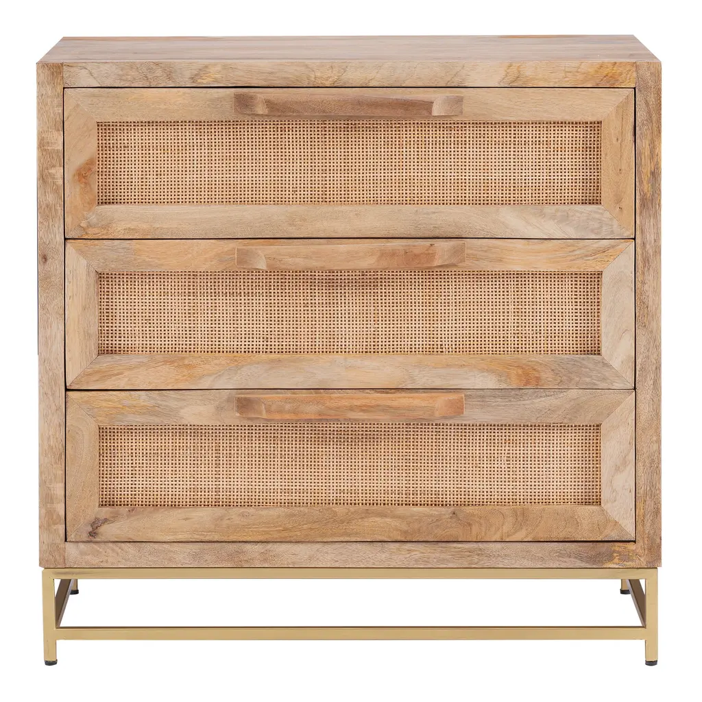 The Cresset 3-drawer storage cabinet is crafted of mango wood with textural rattan-cane inlays and the simple geometric flair of an open metal base. Available in two distinctive color combinations, this mixed-material chest of drawers is a complement for rustic, contemporary or modern-farmhouse decor. It can be a small dresser in the bedroom, a supply cabinet in the home office or a versatile storage solution in the living room.