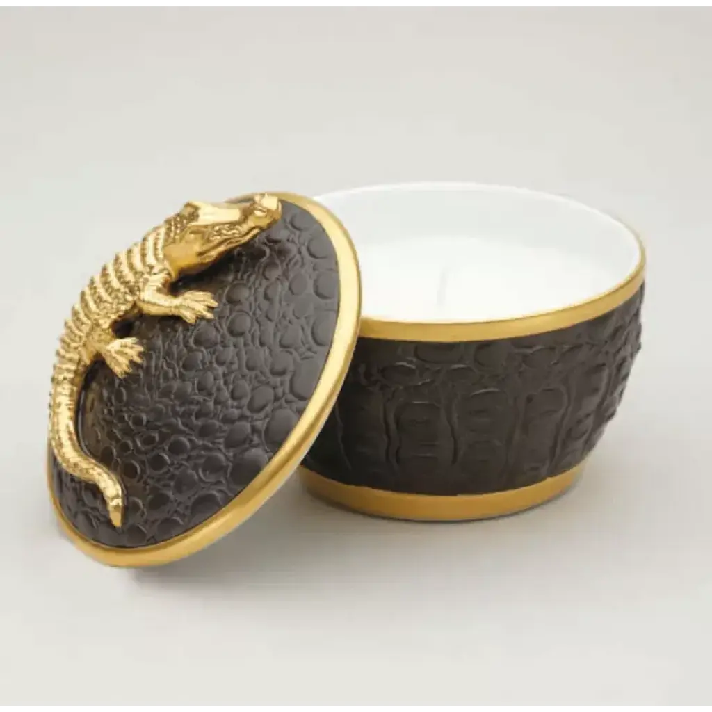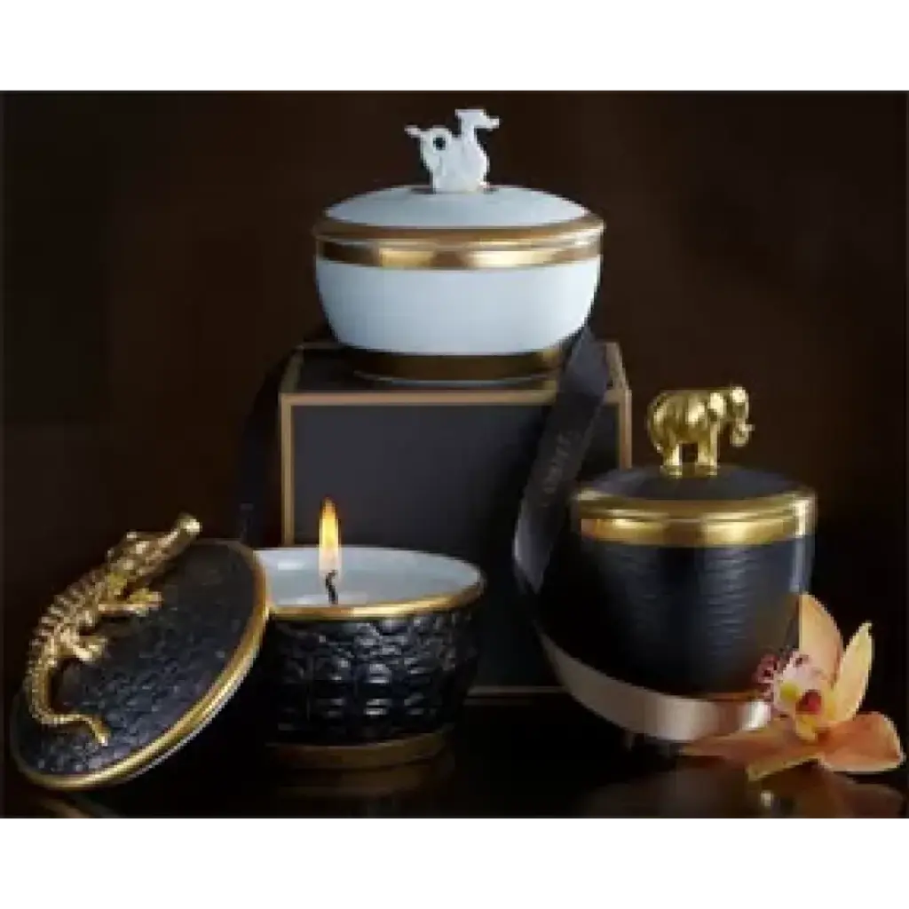 L'Objet's iconic crocodile candle features a fitted lid adorned with a golden crocodile. Featuring the intoxicating scent of Pink Champagne. Fine porcelain with matte black glaze and 14 kt gold details. Approximately 35 hours burn time. All pieces individually packaged in beautiful boxes for storage or gift giving. Reminiscent of keepsakes from a global adventure or discoveries found in a cabinet of curiosities, L'Objet candles evoke a world of fascination and wonder. The handcrafted collection features delicate finial details, 24K gold accents and an intoxicating signature fragrance. Prior to founding L’Objet in 2004, Israeli-born Elad Yifrach was a successful designer in Beverly Hills. He was creating beautiful interiors, but he was frustrated by the limited options available in home accessories, so he set out to create something better. L’Objet’s collections are diverse, but they are almost always inspired by nature and architecture. Many of his exquisite serving pieces rest in a base of hand-crafted gold foliage, other pieces feature intricate design and beadwork, and some of the most striking objects actually look like miniature buildings. And despite the lux feel, much of the line is practical with just a touch of whimsy.