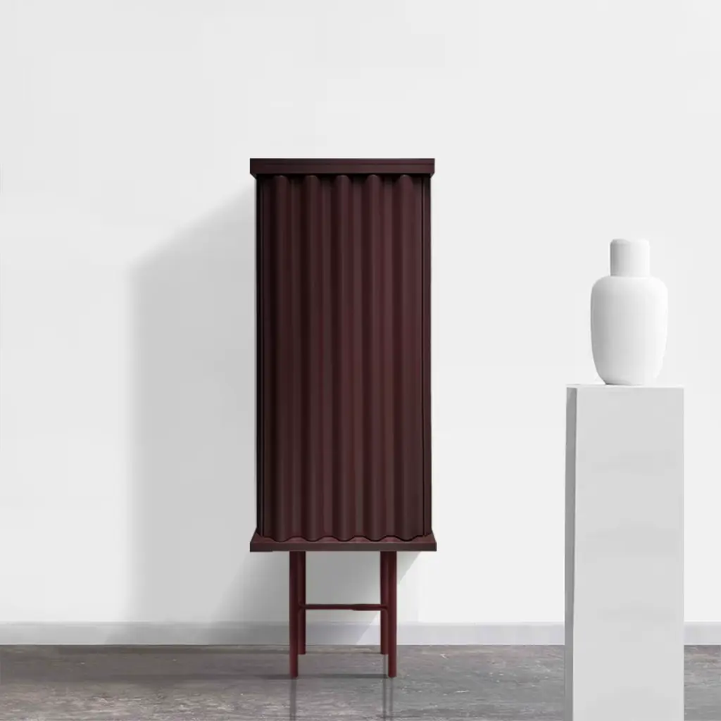 Curl is a cabinet that merges clean geometric lines with a rich, wine-red finish. The push-pull doors, accented by an industrial steel base, create a bold but elegant presence in any space. Its front panel, designed with rounded corners, introduces a dynamic flow that contrasts beautifully with the subtle simplicity of the piece. Available in 12 shades, Curl can be customized to fit various tastes, and its eco-friendly MDF structure offers a sustainable, long-lasting design solution.