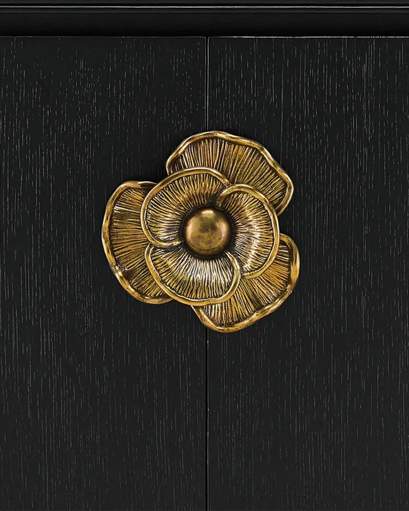 The impressively sized brass flower pull on the Briallen Black Demi-Lune Cabinet is a stunning ornamentation. Contrasting the Caviar black stain, the floral motif in an antique brass finish brings the black cabinet a sophisticated feel and illustrates the skill of our artisans who hand-cast the handle in brass. Wipe clean with a soft, dry cloth or static duster. Always avoid the use of harsh chemicals or abrasive cleaners as they may cause damage to the item's finish. Due to the use of natural materials, handmade craftsmanship, or hand finishing, expect some color variances. Hand crafted pieces may have slight size differences.