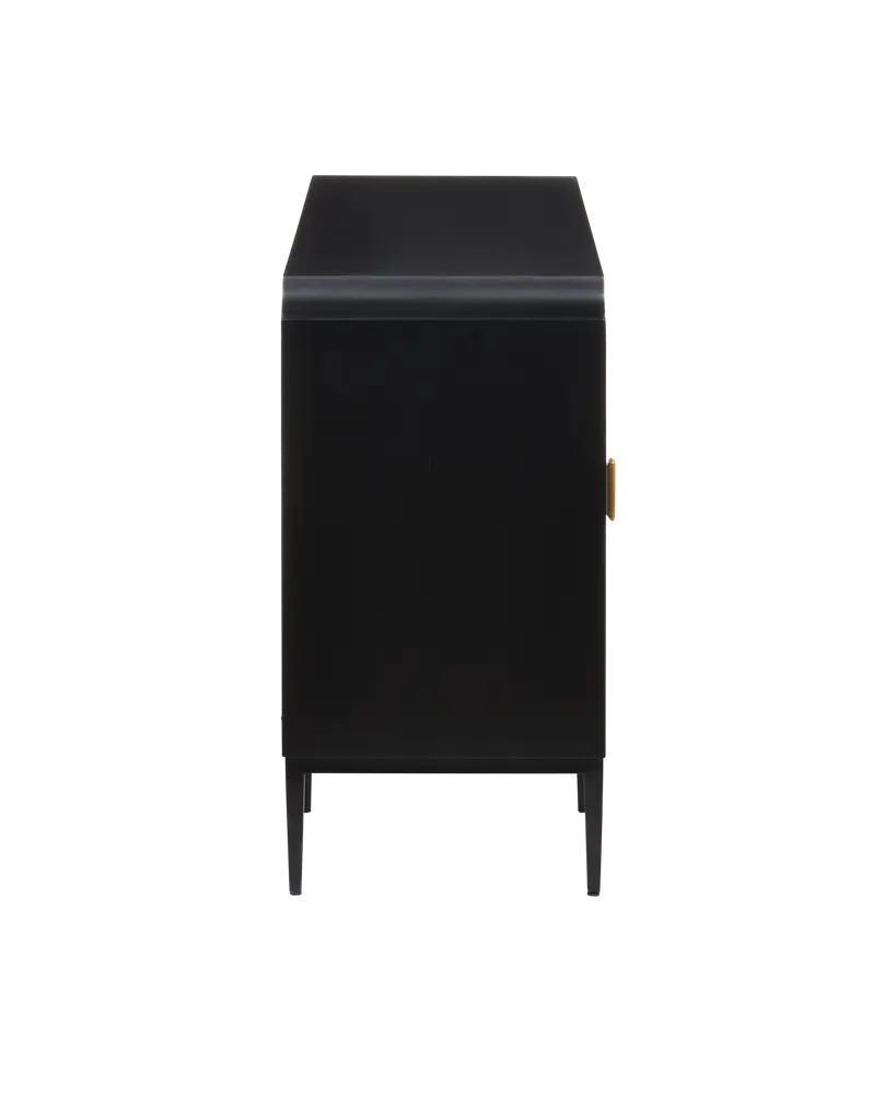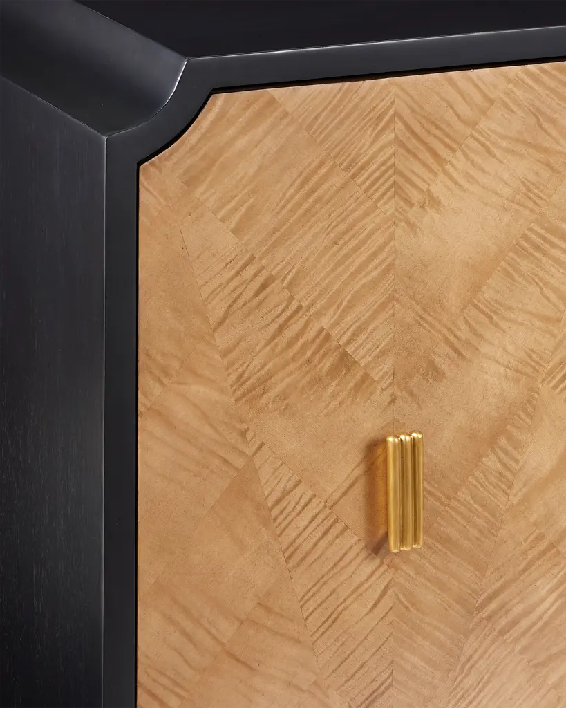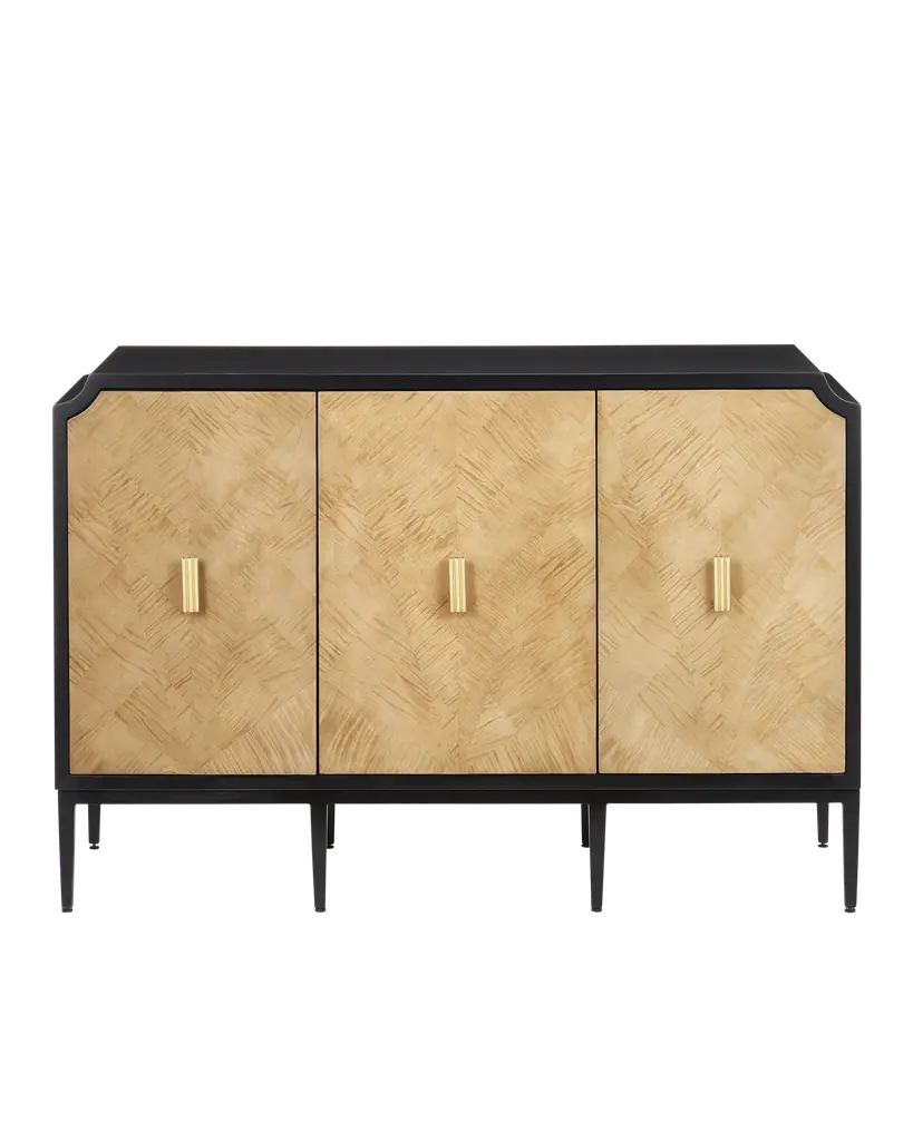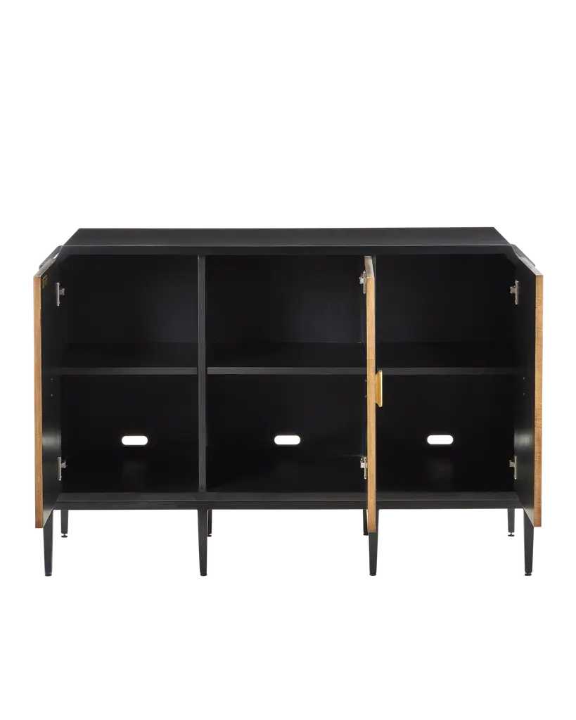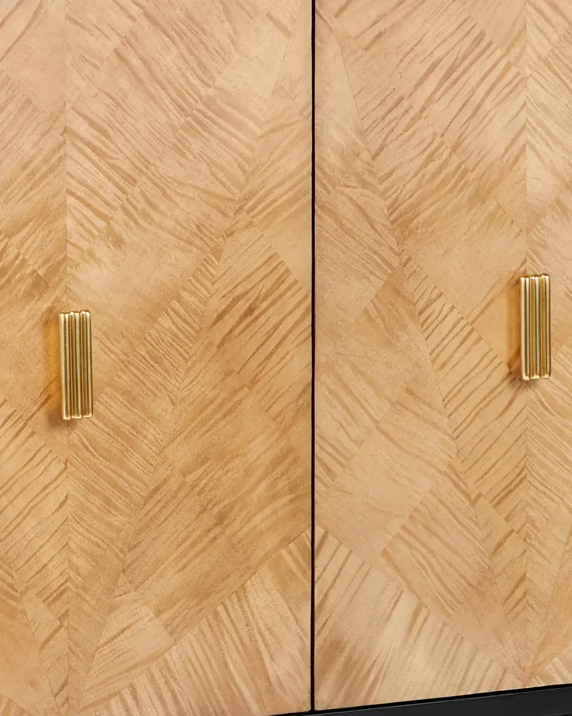 The Kallista Taupe Cabinet has a taupe finish that enlivens the figured sycamore veneers on its door fronts. The wood grains bring the cabinet a hint of distressing that contrasts the rich black of the cabinet's exterior. The door pulls are in a polished brass finish. Specialty treatments on this artful tan cabinet include soft-close doors and cord management openings. Wipe clean with a soft, dry cloth or static duster. Always avoid the use of harsh chemicals or abrasive cleaners as they may cause damage to the item's finish. Polyurethane finish Due to the use of natural materials, handmade craftsmanship, or hand finishing, expect some color variances. Hand crafted pieces may have slight size differences.