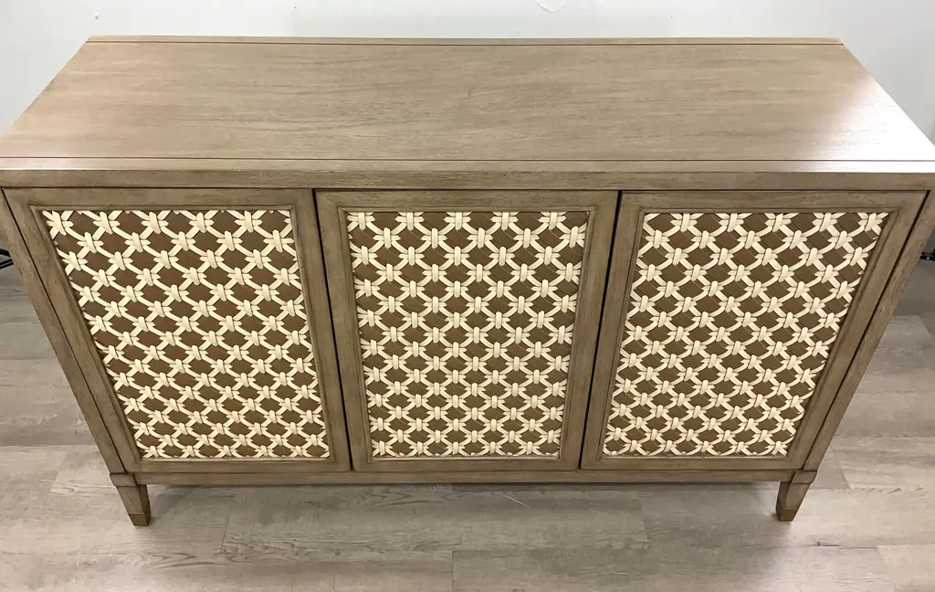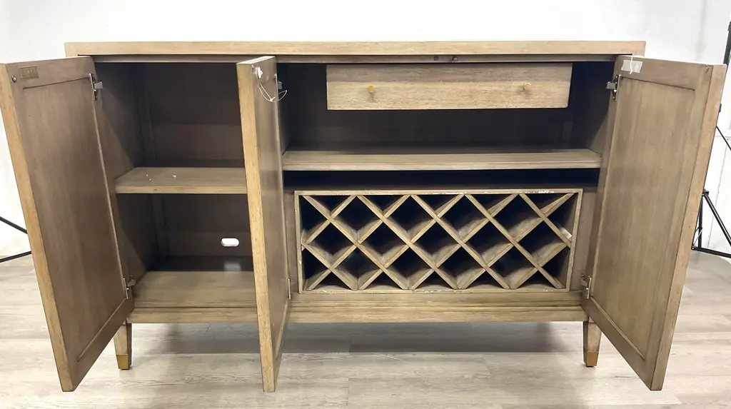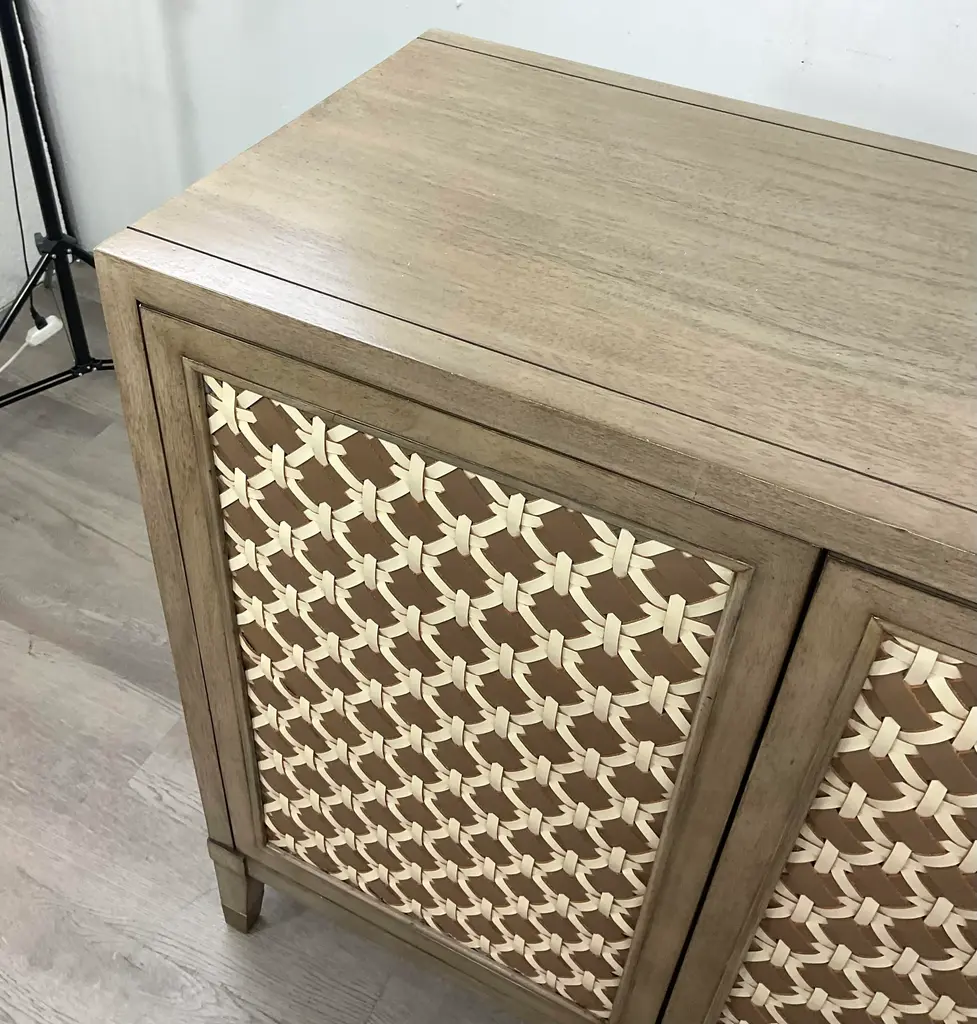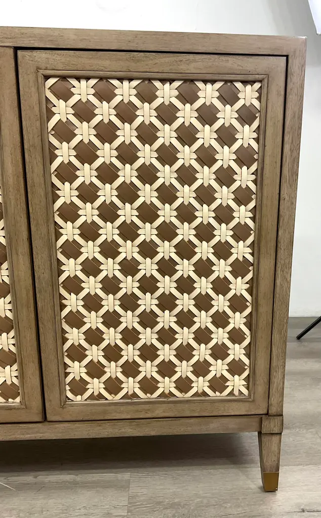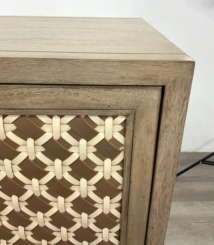 Original retail $6320, stylish Currey & Company Organic Modern Bramford Wheat Cabinet, wheat finished mahogany wood frame, three doors with an interlocking taupe and ivory leather design, two shelves, one drawer, wine bottle storage, and brass ferrules, showroom floor sample