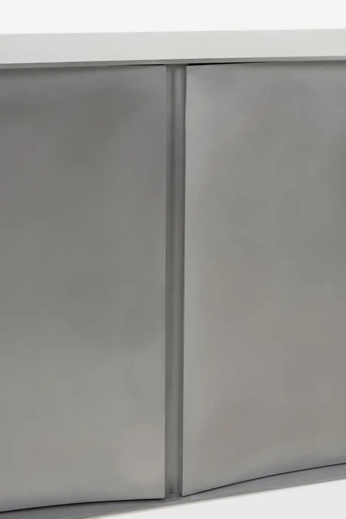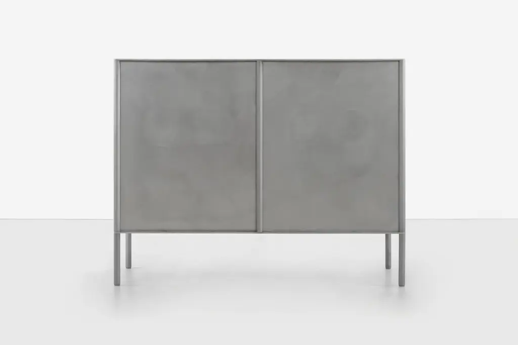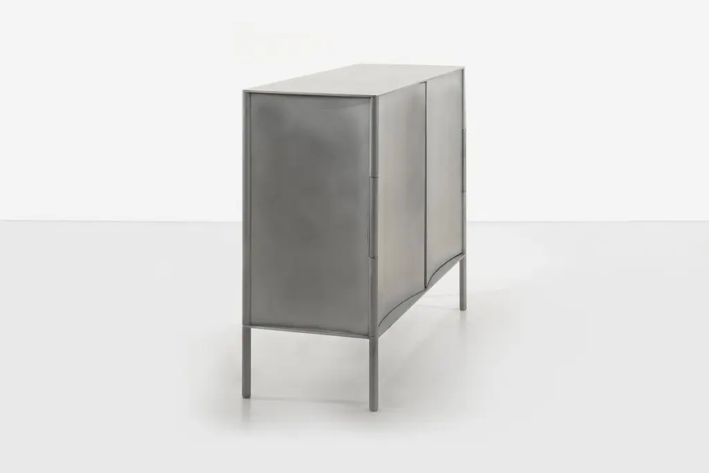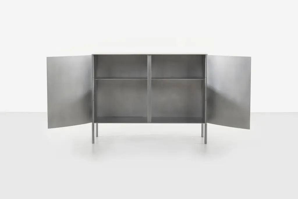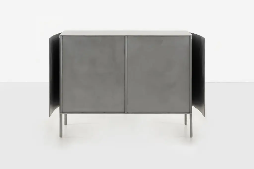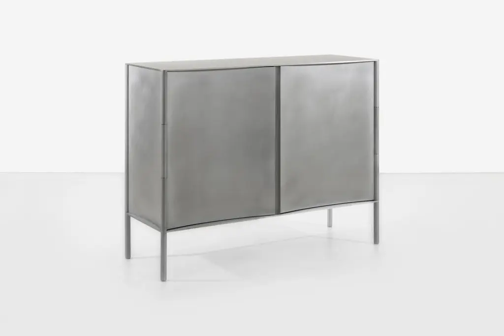 The curved cabinet by Jonathan Nesci is cut, rolled, and machined aluminum with a waxed finish. The doors, back and sides have a slight curve. The doors are cut and are welded to machined custom hinges and lap the center vertical piece slightly to act as handles. The legs have inset, machined Delrin protective feet in the legs.
