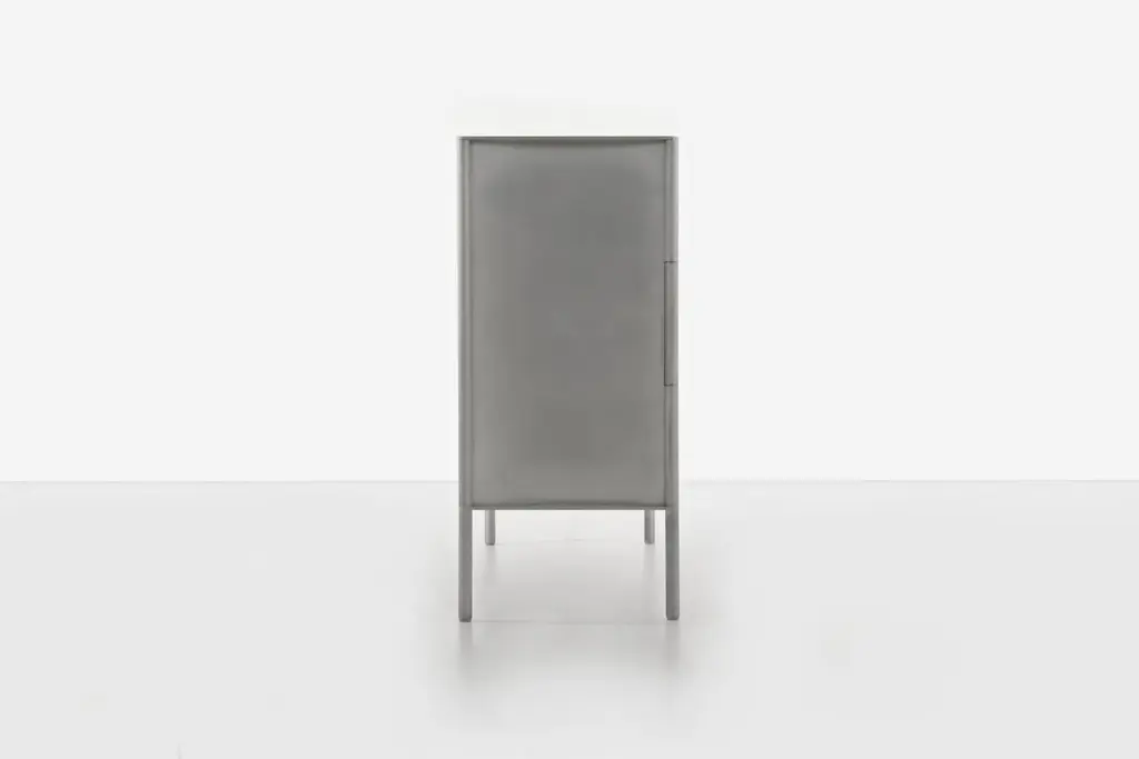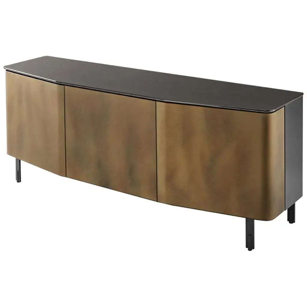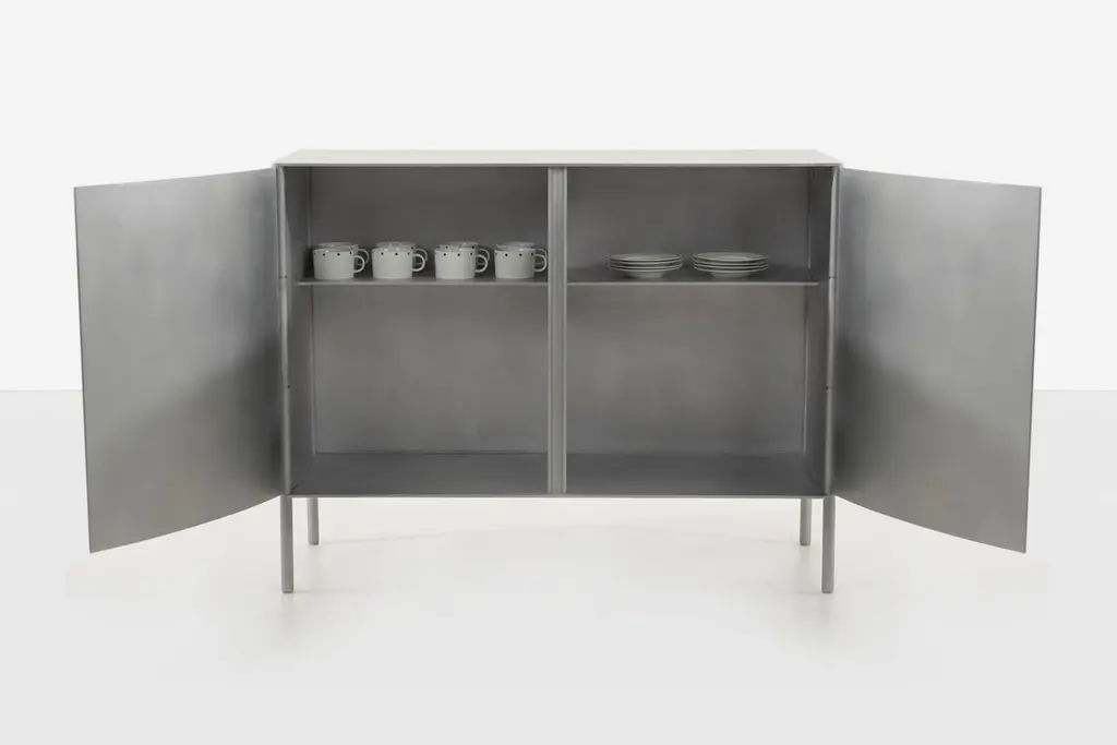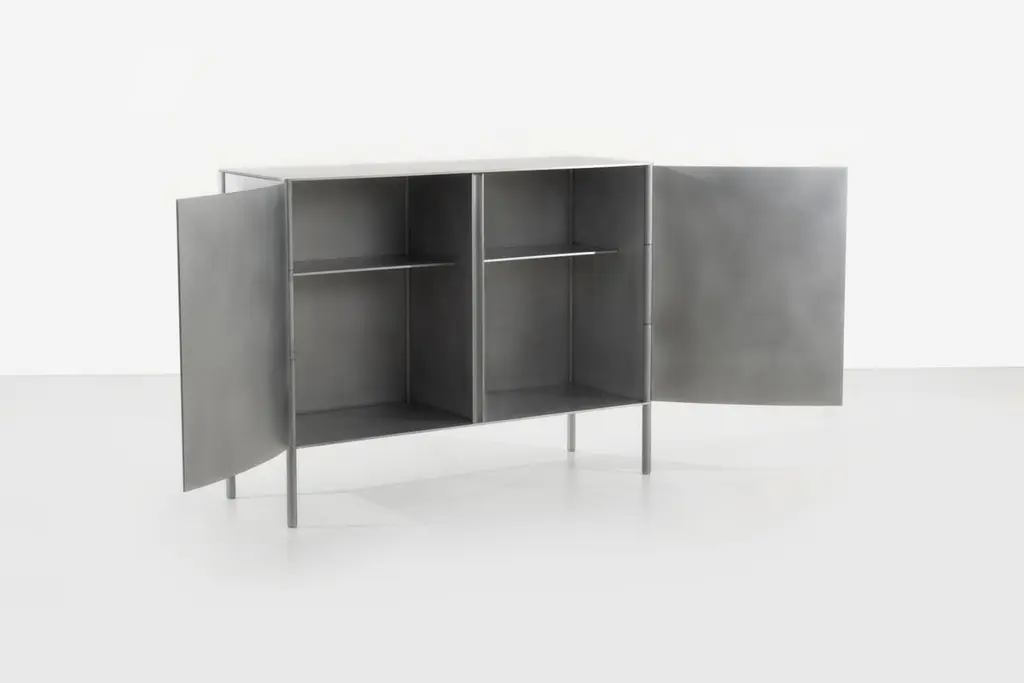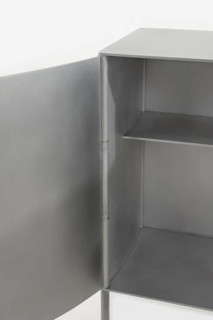 The curved cabinet by Jonathan Nesci is cut, rolled, and machined aluminum with a waxed finish. The doors, back and sides have a slight curve. The doors are cut and are welded to machined custom hinges and lap the center vertical piece slightly to act as handles. The legs have inset, machined Delrin protective feet in the legs.