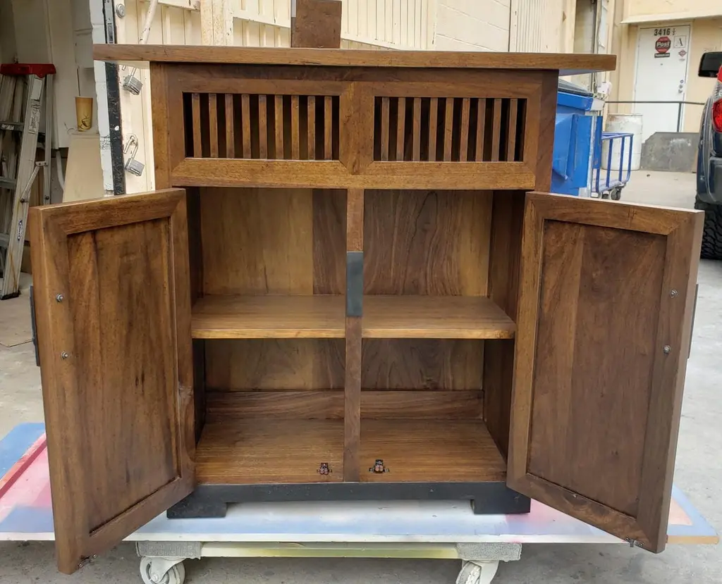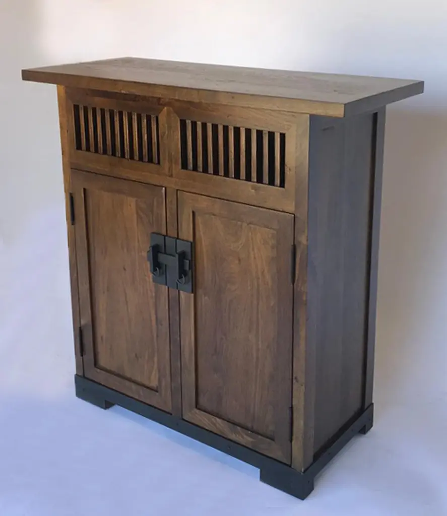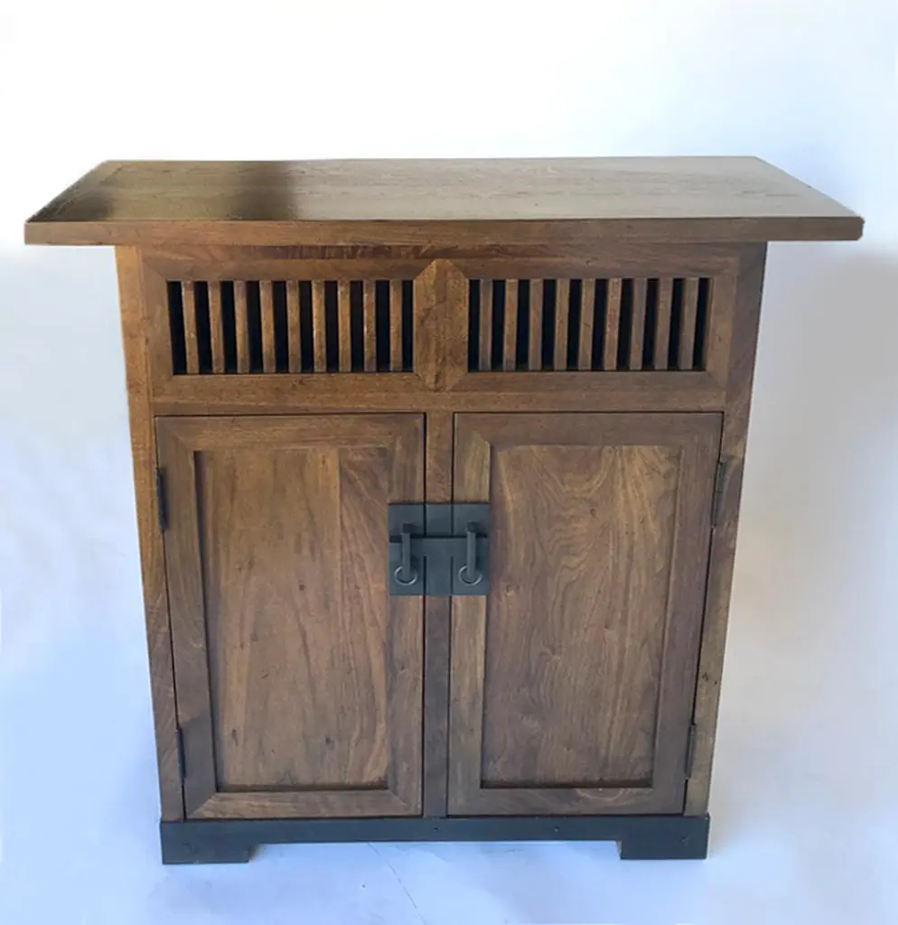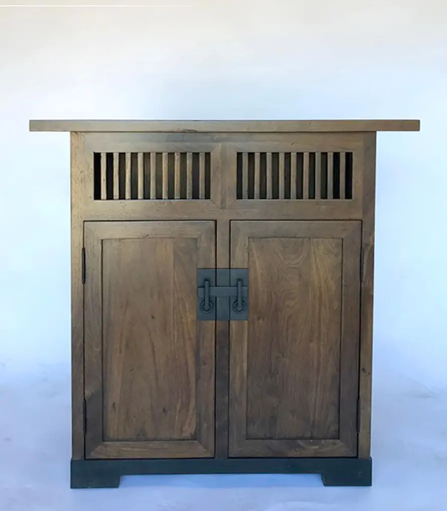 This is our custom Japanese style cabinet with iron base and hardware. Can be made in any size, in a variety of finishes. As shown in Walnut #2 with light to medium distress.Made in Los Angeles, by Dos Gallos Studio.CUSTOM PRICES ARE SUBJECT TO CHANGE. PLEASE INQUIRE BEFORE ORDERING. ALL CUSTOM ORDERS ARE NON RETURNABLE. FINAL SALE
