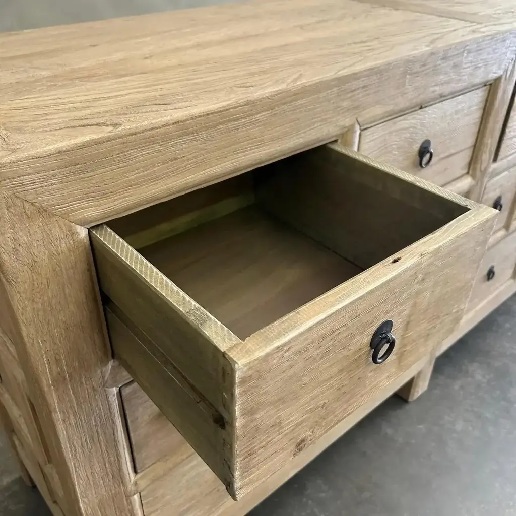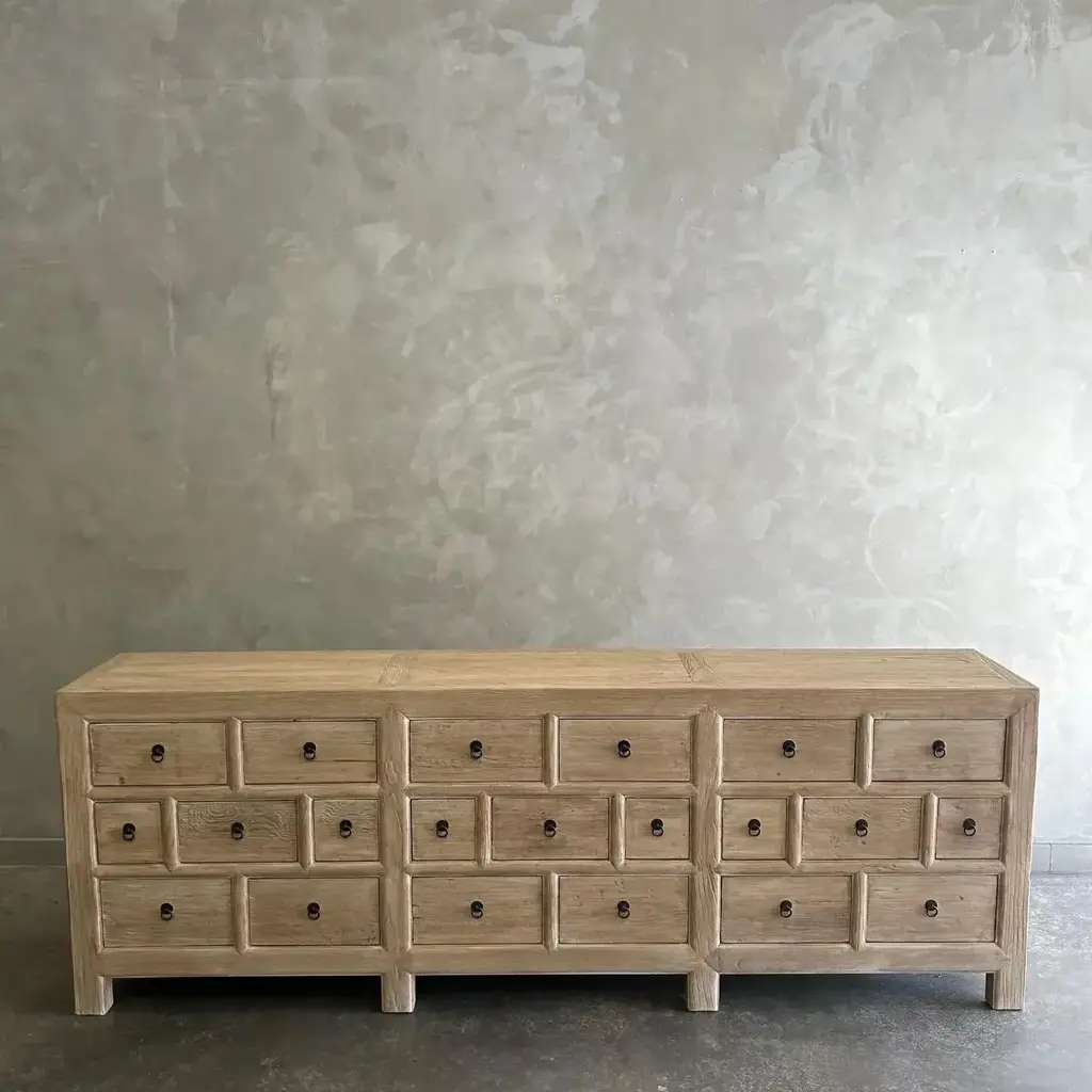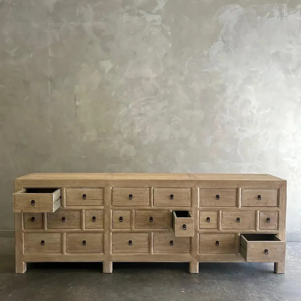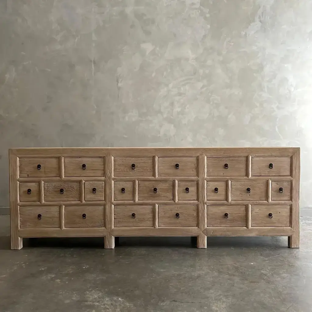 CARY SIDEBOARD IN NATURAL FINISH Made from salvaged reclaimed timbers, this console is reminiscent of antique apothecary cabinets. Featuring 21 drawers for ample storage and a distinctive weathered finish, this rustic sideboard adds a unique touch to any space. Reclaimed Materials: there may be some imperfections in the piece or grain of the wood. We like to call that character. Please note this item is handcrafted and slight variations can be expected from piece to piece. Materials: Reclaimed Elm Care Instructions: Do not use harsh chemical, use damp cloth. Drawer cabinet 94”w x 16.5”d x 33”h